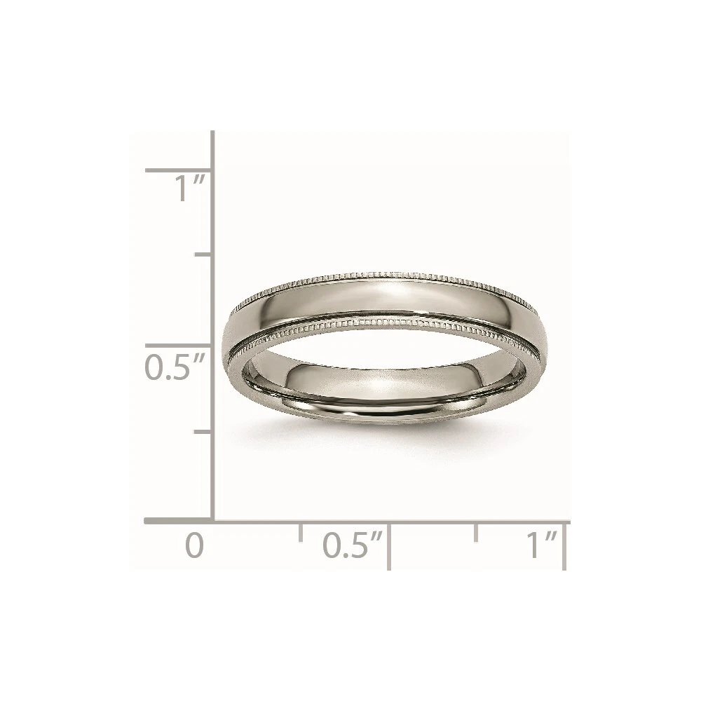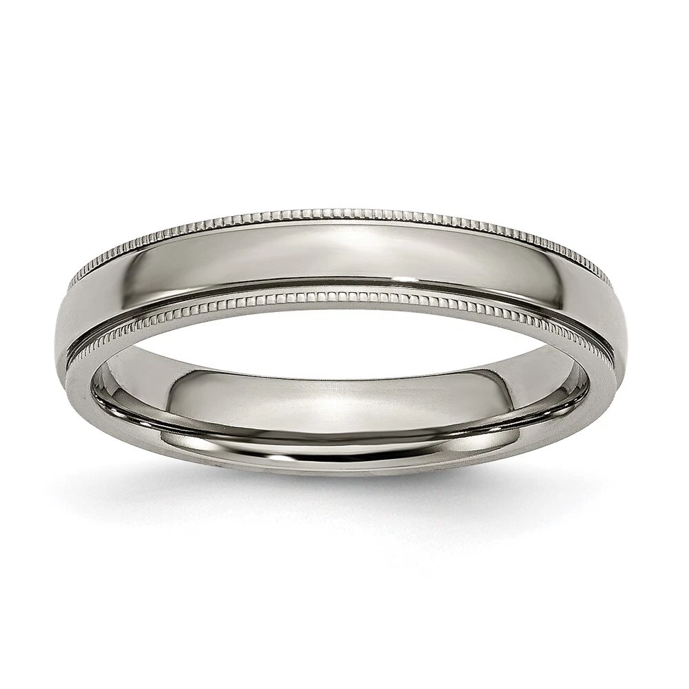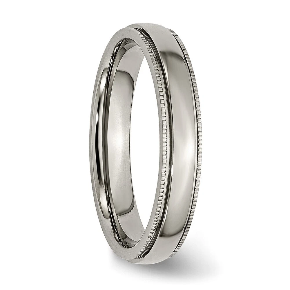 Finish:Polished|Band Width:4 mm|Material: Primary:Titanium|Ring Fit:Standard|Sizeable:No|Thickness:< 2 mm|Item Weight U/M:gm|Width of Item:4 mm|Engravable:Yes|Packaging:Gift Pouch|Product Type:Jewelry|Jewelry Type:Rings|Sold By Unit:Each|Gender:Unisex|Texture:Grooved|Material: Primary - Color:Grey|Ring Type:Wedding Bands|Edge Type:Beaded|Ring Shape:Half Round All weights and measurements are approximate and may vary slightly from the listed information. Welcome to diamond_6720 Payments We accept all Ebay approved payment. Please sent the payment to us within 8 days after the auction has ended, or you will have unpaid case auto open by eBay. Shipping Policy We will ship all items within 1 business days of purchase during the work week (M-F) excluding holidays. If you order on Friday, your order will be shipped the following business day. Tracking will be provided when it becomes available. We will only ship to a PayPal Verified Address. Please make sure your address is current and correct. If the information does not match, your order may be canceled. Buyers are responsible for all customs, duties and taxes for your respective countries. Delivery times for International Shipping will vary. California Buyers Pay 9.0% Tax on all orders. case auto open by eBay. Return Policy & Exchange Returns or Exchange are accepted. Buyer must contact us within 30 days after the item is received. Item must be returned in unworn and resalable condition. We will only issue a refund for the purchase price, excluding any shipping fees. If we are at fault, we will provide a full refund. Buyer is responsible for all return shipping costs. BUYERS FEEDBACK If you have any concerns regarding your purchase, please contact us via eBay Message, we assure you that a satisfactory resolution will be reached. Your feedback is very important to us Do remember to give us 5 star rating(*****) if you are satisfied with our product & service .