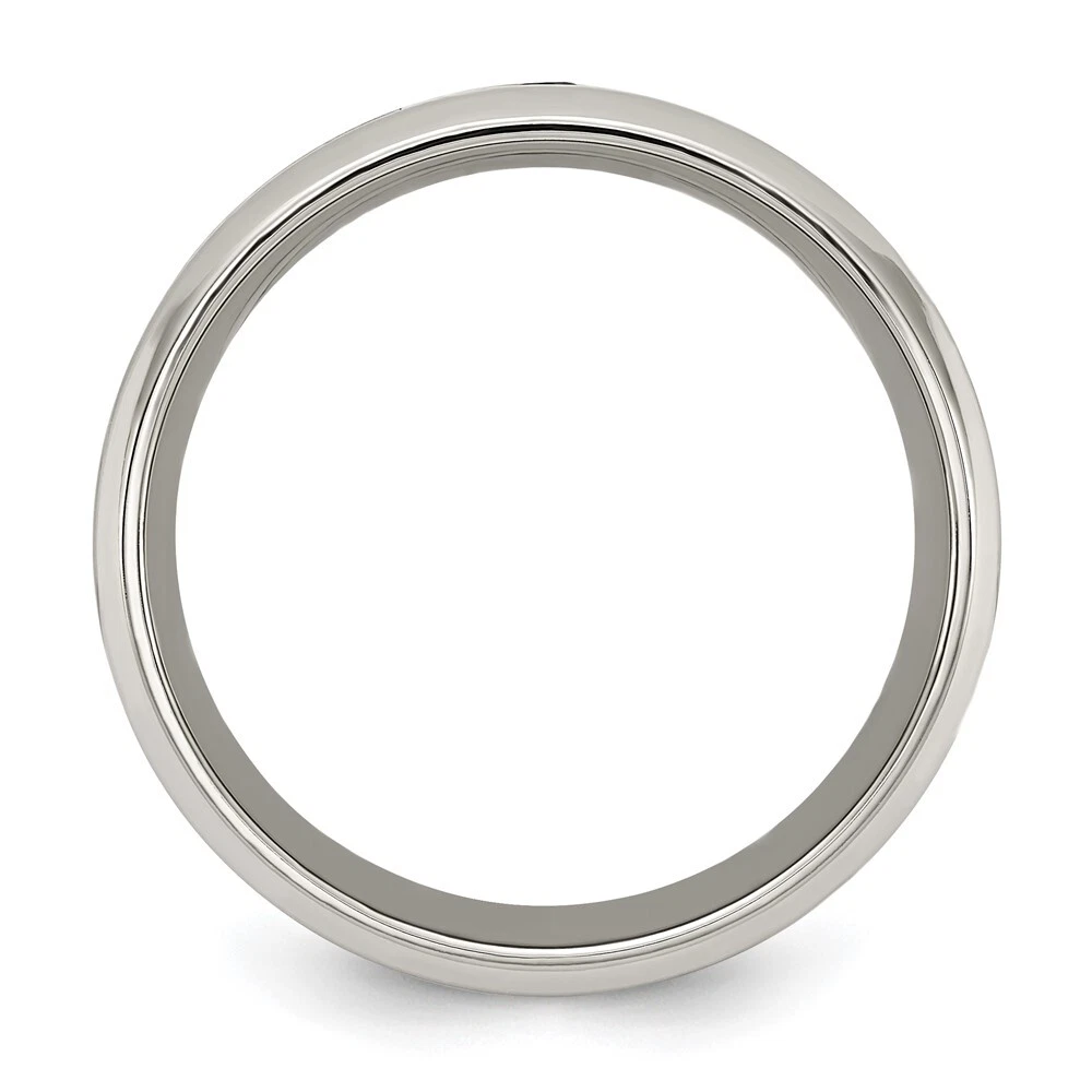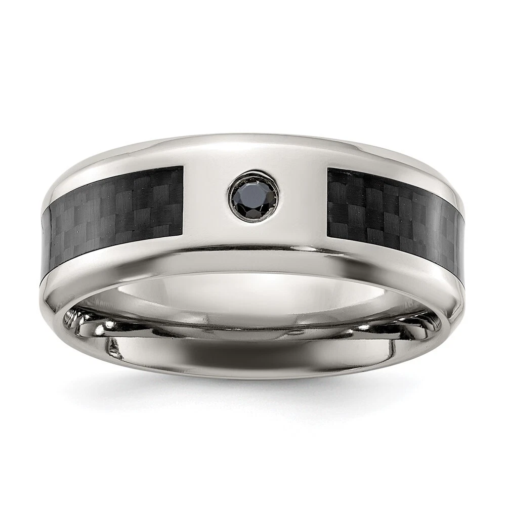 Finish:Polished|Stone Type_1:Cubic Zirconia (CZ)|Stone Color_1:Black|Stone Quantity_1:1|Material: Accent Color 1:Black|Band Width:8 mm|Stone Setting_1:Bezel Set|Material: Primary:Titanium|Sizeable:No|Stone Shape_1:Round|Stone Size_1:2.5 mm|Stone Treatment_1:Synthetic|Item Weight U/M:gm|Width of Item:8 mm|Packaging:Gift Pouch|Product Type:Jewelry|Jewelry Type:Rings|Sold By Unit:Each|Gender:Unisex|Material: Inlay:Carbon Fiber|Material: Primary - Color:Grey|Ring Type:Wedding Bands|Edge Type:Beveled|Stone Creation Method_1:Synthetic All weights and measurements are approximate and may vary slightly from the listed information. Welcome to diamond_6720 Payments We accept all Ebay approved payment. Please sent the payment to us within 8 days after the auction has ended, or you will have unpaid case auto open by eBay. Shipping Policy We will ship all items within 1 business days of purchase during the work week (M-F) excluding holidays. If you order on Friday, your order will be shipped the following business day. Tracking will be provided when it becomes available. We will only ship to a PayPal Verified Address. Please make sure your address is current and correct. If the information does not match, your order may be canceled. Buyers are responsible for all customs, duties and taxes for your respective countries. Delivery times for International Shipping will vary. California Buyers Pay 9.0% Tax on all orders. case auto open by eBay. Return Policy & Exchange Returns or Exchange are accepted. Buyer must contact us within 30 days after the item is received. Item must be returned in unworn and resalable condition. We will only issue a refund for the purchase price, excluding any shipping fees. If we are at fault, we will provide a full refund. Buyer is responsible for all return shipping costs. BUYERS FEEDBACK If you have any concerns regarding your purchase, please contact us via eBay Message, we assure you that a satisfactory resolution will be reached. Your feedback is very important to us Do remember to give us 5 star rating(*****) if you are satisfied with our product & service .