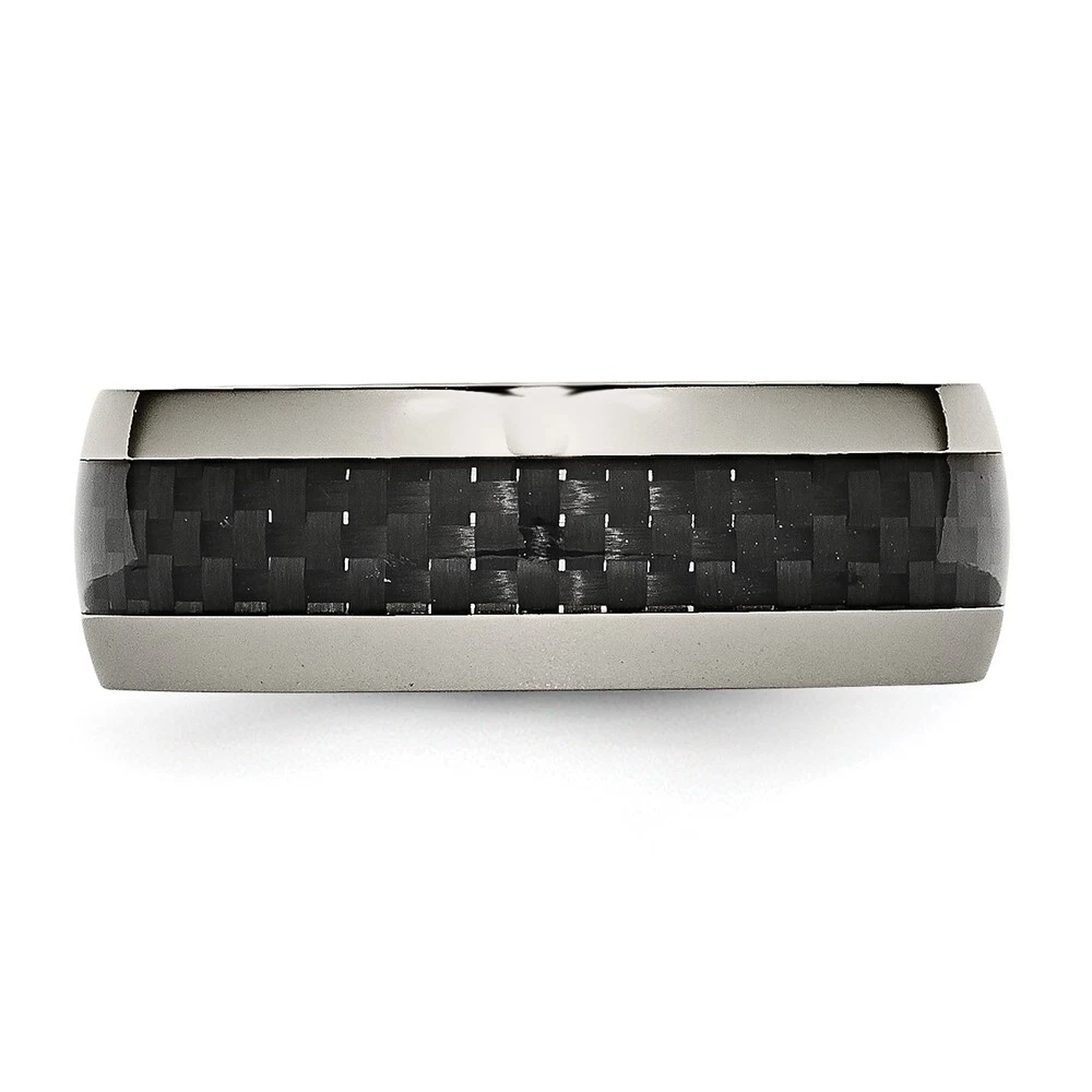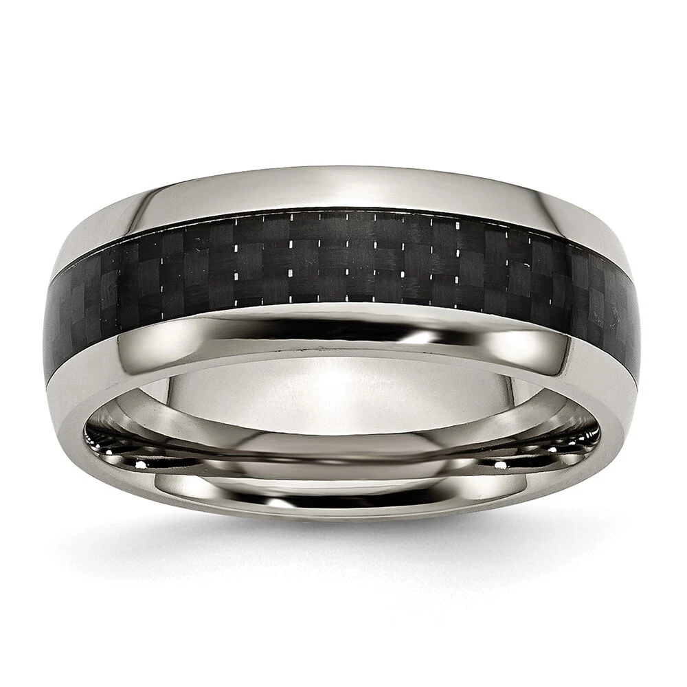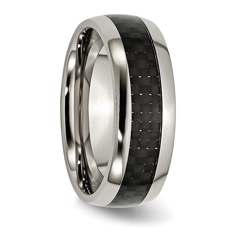 Finish:Polished|Material: Accent Color 1:Black|Band Width:8 mm|Material: Primary:Titanium|Ring Fit:Comfort|Sizeable:No|Thickness:< 2.5 mm|Item Weight U/M:gm|Width of Item:8 mm|Engravable:Yes|Packaging:Gift Pouch|Product Type:Jewelry|Jewelry Type:Rings|Sold By Unit:Each|Gender:Unisex|Material: Inlay:Carbon Fiber|Material: Primary - Color:Grey|Ring Type:Wedding Bands|Edge Type:Rounded|Ring Shape:Half Round All weights and measurements are approximate and may vary slightly from the listed information. Welcome to diamond_6720 Payments We accept all Ebay approved payment. Please sent the payment to us within 8 days after the auction has ended, or you will have unpaid case auto open by eBay. Shipping Policy We will ship all items within 1 business days of purchase during the work week (M-F) excluding holidays. If you order on Friday, your order will be shipped the following business day. Tracking will be provided when it becomes available. We will only ship to a PayPal Verified Address. Please make sure your address is current and correct. If the information does not match, your order may be canceled. Buyers are responsible for all customs, duties and taxes for your respective countries. Delivery times for International Shipping will vary. California Buyers Pay 9.0% Tax on all orders. case auto open by eBay. Return Policy & Exchange Returns or Exchange are accepted. Buyer must contact us within 30 days after the item is received. Item must be returned in unworn and resalable condition. We will only issue a refund for the purchase price, excluding any shipping fees. If we are at fault, we will provide a full refund. Buyer is responsible for all return shipping costs. BUYERS FEEDBACK If you have any concerns regarding your purchase, please contact us via eBay Message, we assure you that a satisfactory resolution will be reached. Your feedback is very important to us Do remember to give us 5 star rating(*****) if you are satisfied with our product & service .