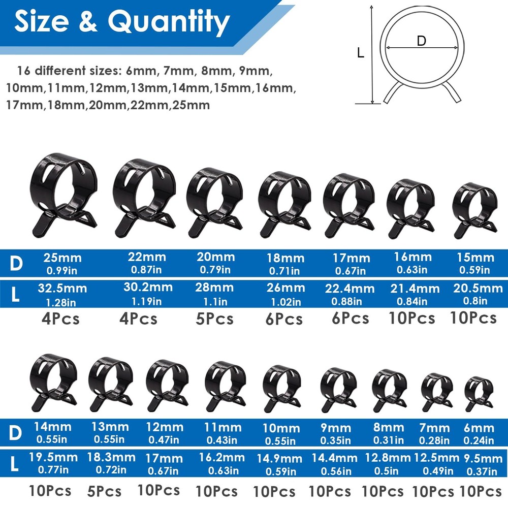 Tnisesm 132Pcs 6-25MM Spring Hose Clamps with Hose Clamp Pliers, Black Small Hose Clamps Automotive Fuel Hose Clamp Silicone Vacuum Hose Pipe Low Pressure Air Clip Clamp Various Styles Are Available: Spring Clamps Include 16 different diameters clamps to adapt to different hoses: 6mm, 7mm, 8mm, 9mm, 10mm, 11mm, 12mm, 13mm, 14mm, 15mm, 16mm, 18mm, 19mm 20mm, 22mm, 25mm.Come with a plastic storage box has classification figure inside, could facilitate your storage and classification size Tight & Strong: Made of premium 65Mn spring steel, durable in use and have a long serving time.nice construction and hold very well Protect Hose & Prevent Leakage: 360 Degree Inner Ring Precision Design, prevent damage to the pipeline effectively;fuel line hose clamp can ensure a reliable and leak-proof connection between the hose and the joint, and is very suitable for connecting the hose to the joint to prevent flow leakage Wide Application: Spring Hose Clamps are used in a wide range of applications, suitable for fuel lines/vacuum hoses/gas pipe/air hose/water pipe/silicone hose, great choose for garage, boats, motorcycles, lawn and car engines connection, etc Easy to use: equipped with professional swivel flat hose clamp Plier, you can grasp the clamp and rotary joint for multi-angle entry only by grasping the hand Shipping We offer FREE shipping on all orders! We ship within Three business days of payment, usually sooner. We use a selection of shipping services such as UPS, FedEx, USPS etc. We only ship to the lower 48 states, no APO/FPO addresses or PO Boxes allowed. Local pickups and combined shipping options are not provided at this time. Return You can return a product for up to 30 days from the date you purchased it. Any product you return must be in the same condition you received it and in the original packaging. Please keep the receipt. Payment We accept payment by any of the following methods: PayPal Please pay as soon as possible after winning an auction, as that will allow us to post your item to you sooner! Feedback Customer satisfaction is very important to us. If you have any problem with your order, please contact us and we will do our best to make you satisfied. Contact Us If you have any queries, please contact us via ebay. We usually respond within 24 hours on weekdays. Please visit our eBay store to check out other items for sale! Thank you for shopping at our store.