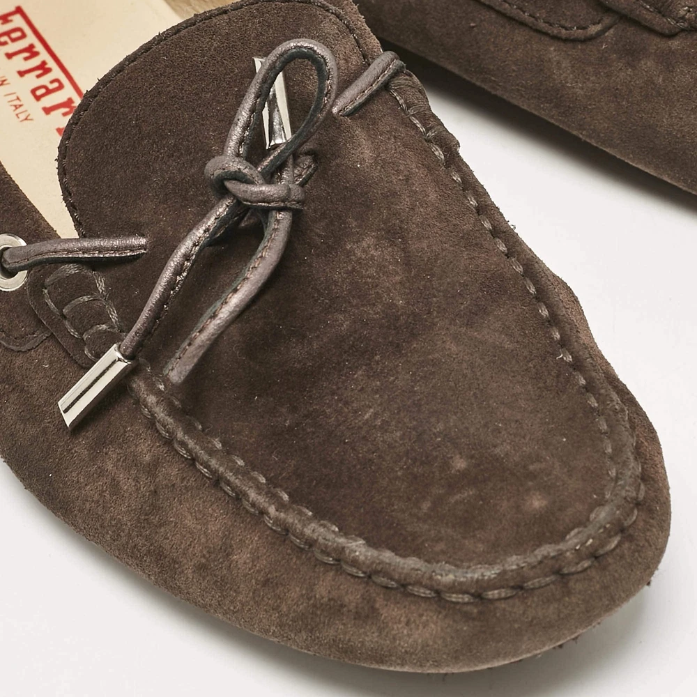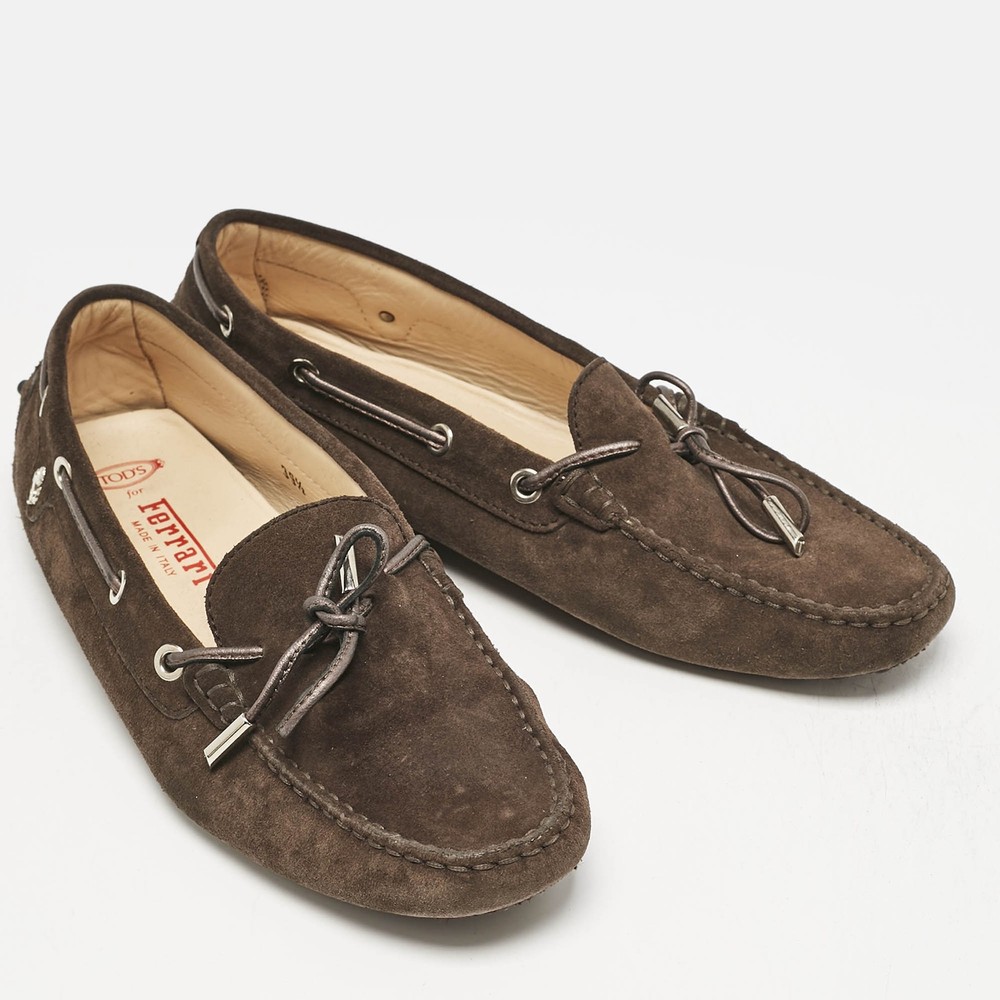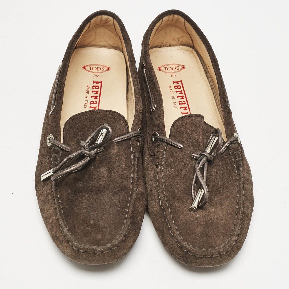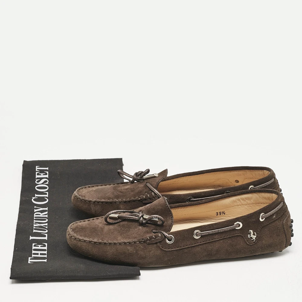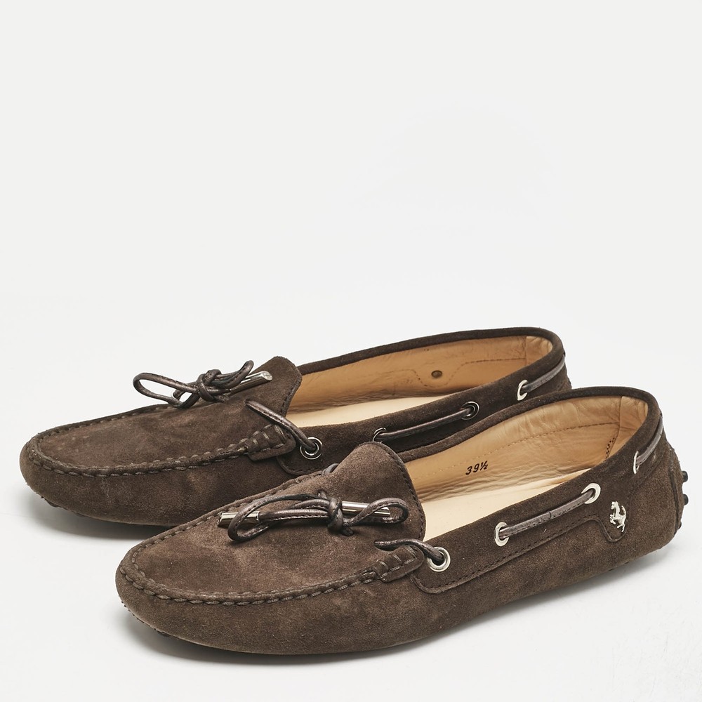 Our eBay Store About Us Contact Us Add to Favorite Sellers Tods for Ferrari Brown Suede Bow Slip On Loafers Size 395 Blending Italian flair and automotive spirit, Tod’s for Ferrari slip-on loafers are crafted in rich brown suede. Featuring a subtle bow accent, they offer a stylish nod to both relaxed sophistication and racing heritage. Product Details Brand Tod's Color Brown Includes The Luxury Closet Packaging Outsole Length 27 cm Outsole Width 8.5 cm Size 39.5 Certified by The Luxury Closet This item has gone through a detailed authentication process overseen by our experts. We offer a lifetime guarantee of authenticity on all our items. How We Check The in-house team of experts at The Luxury Closet is highly trained to verify the authenticity and the condition of the luxury products. They ensure that only 100% authentic items are put on sale.The evaluation process is unique with its own mix of assessment criteria and differs according to the category. Each item is evaluated based on the following combination of hallmarks, hardware, stitching, symmetry, material, craftsmanship, stamping, codes, hologram stickers, and packaging. Our authenticators also check if the items have been modified or amended (e.g., aftermarket diamonds, replaced batteries, repaired bags, etc.) International Buyers Import duties, taxes and charges are not included in the item price. These charges are the buyers responsibility. Please check with your country’s customs office to determine what these additional cost will be prior to buying.