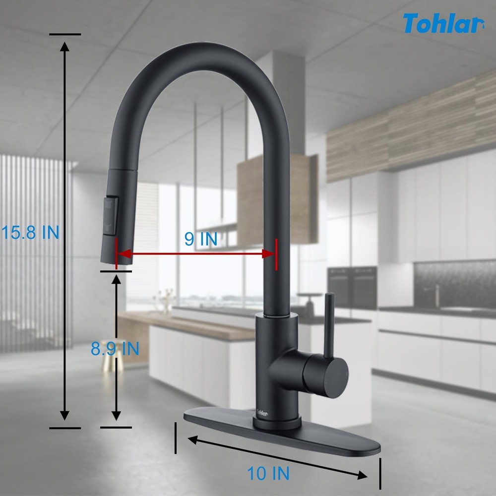 【QUALITY ASSURANCE】 - Tohlar kitchen faucet made of SUS 304 stainless steel, multi-layer surface protection can be anti-corrosion, anti-rust, longer life. 【CLASSIC MATTE BLACK APPEARANCE DESIGN】 - Classics that never go out of style, the surface of the anti-fingerprint design, usually just use a soft cloth to wipe the faucet can be. 【EASY TO USE】- Black kitchen faucet with sprayer got 2 water modes: A silky soft and steady stream; A med-high pressure shower stream. Both of them can meet various washing requirements. 【EASY DIY INSTALLATION】- NO NEED plumber, save money and time. Everything you need is in the box. Quick connect hose takes only 30 minutes for easy DIY. 【RETURNS POLICY】- 90-Day return Guaranteed & 2 years warranty service. Please feel free to contact us if you have any problem with the kitchen sink faucet, we will try our best to help!