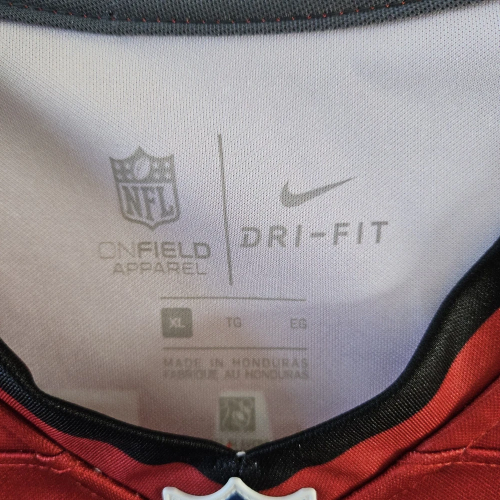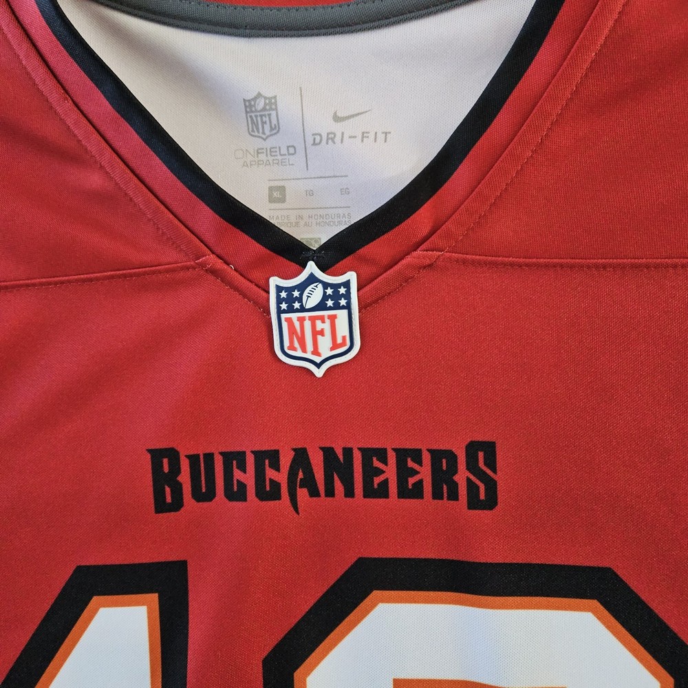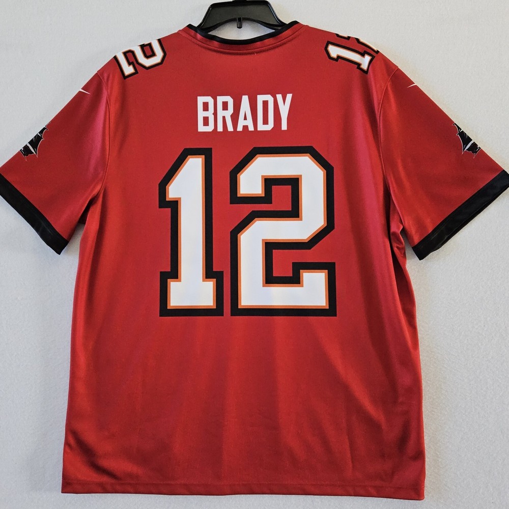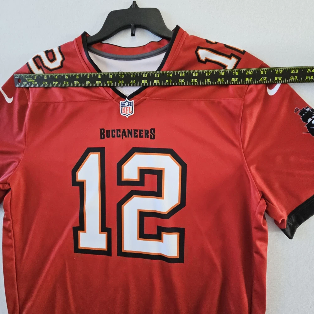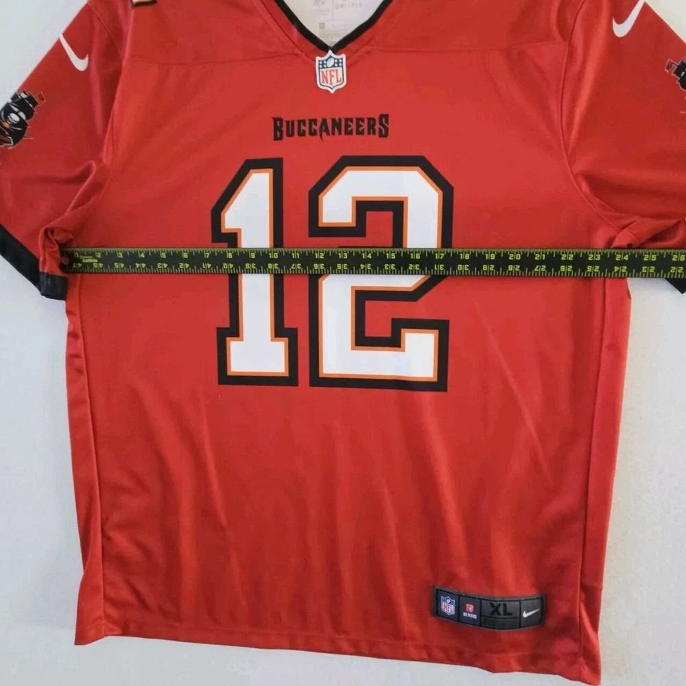100% polyester short sleeve jersey onfield apparel nike dri fit buccaneers #12 tom brady. Short sleeve shirt is in excellent clean condition no holes or tears. Sz XL Measures flat 21" across shoulders 24" pit to pit 30" Length