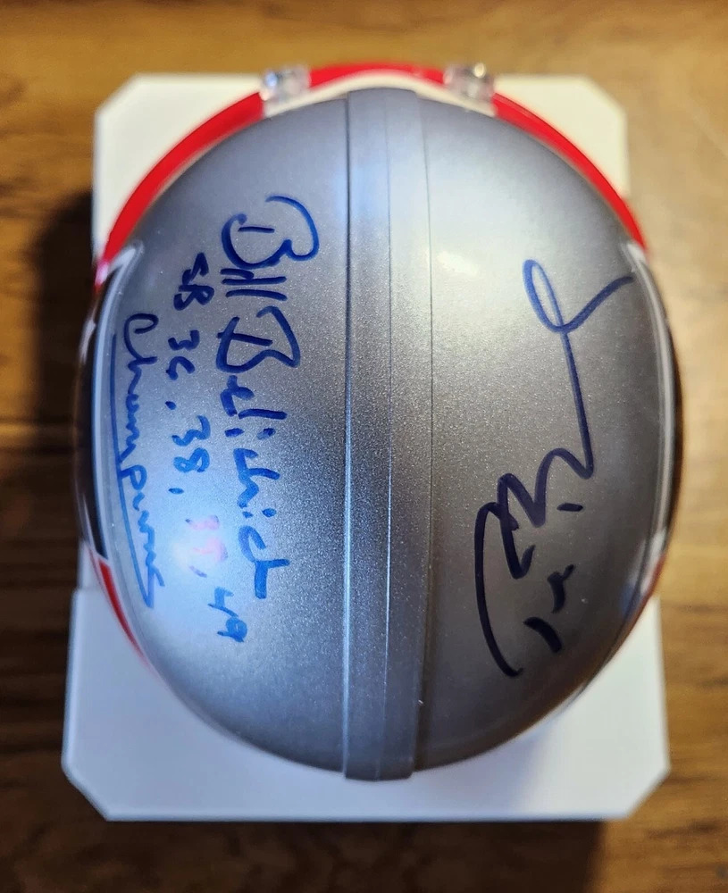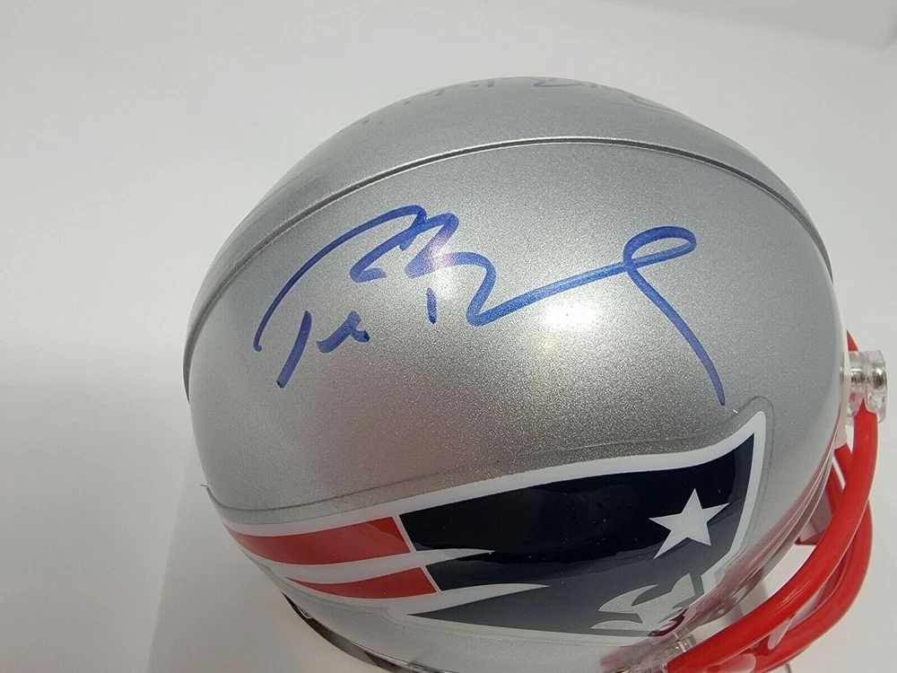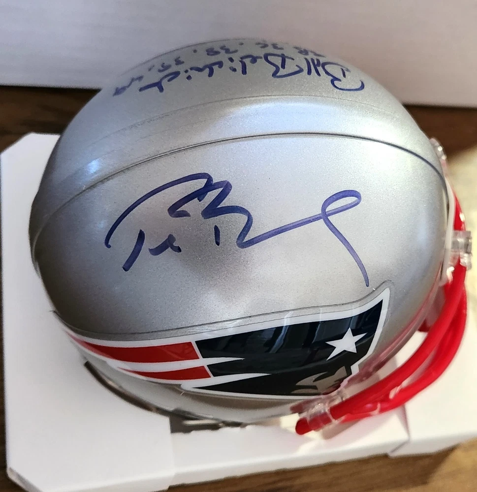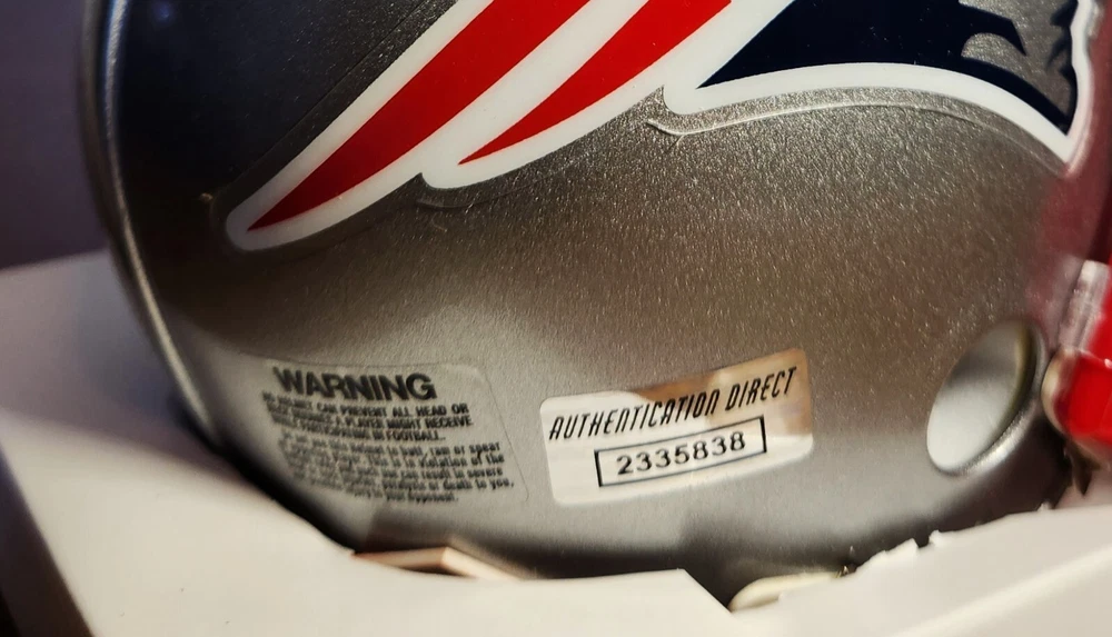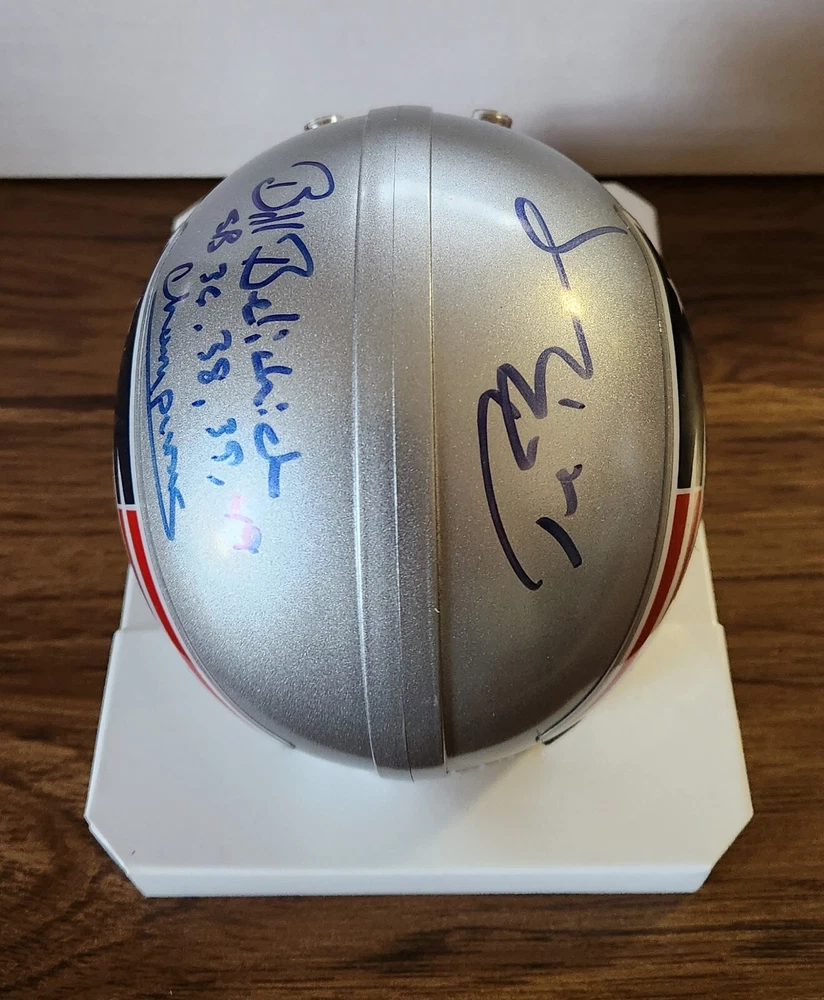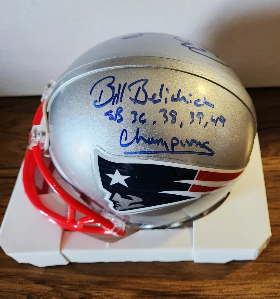 Tom Brady & Bill Belichick Dual "GOAT" Signatures w/Super Bowl Inscription Fantastic dual auto of future HOFers Tom Brady & Bill Belichick in clear, dark blue sharpie with inscription "SB 36, 38, 39 49 CHAMPIONS" under Belichick's auto. Both autographs are certified by Authentication Direct, an industry leader in sports, music, historical and political signatures with affixed hologram and certification #2335838. Please see their website at Authentication Direct (directcoa.com) to verify the authenticity. Rare helmet with dual autos of both legendary Patriots. USPS Priority Shipping with full insurance included. On-line payments only please (no checks, money orders, etc.). *********************************************** Thanks for stopping by and please check out our other auctions! We offer an eclectic mix of sports cards & memorabilia; quality fishing tackle to include discount, brand new Megabass lures; top-quality harmonicas and various other items. We ship the same day as your purchase whenever possible. *** Count On Super Fast & Safe Shipping - USA & APOs Only ***