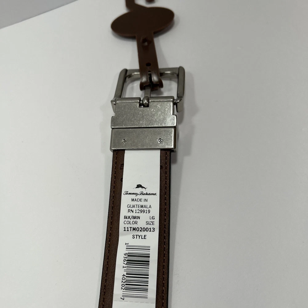 This Tommy Bahama Men's Reversible Black/Brown Leather Belt, size Large new with tags, will elevate your look. This belt is new with tag. While taking photos I notice that it has air bubbles on the blue paint as seen the last photos. As shown in the photos depending on the angel you stand you might notice the air bubble. This is a manufactured defect. If you need more photos or any questions send me a message .