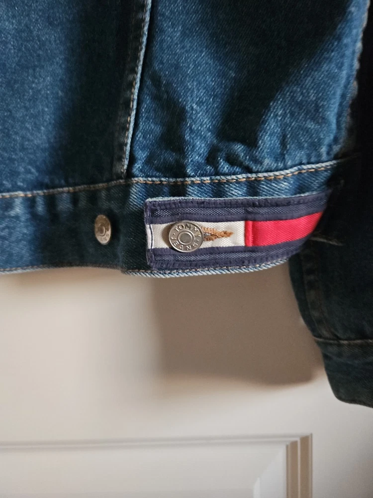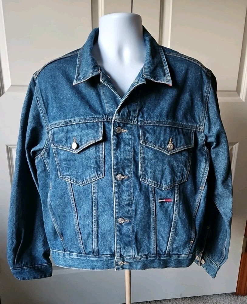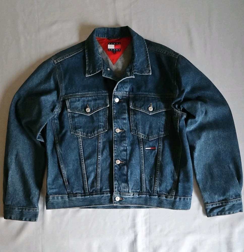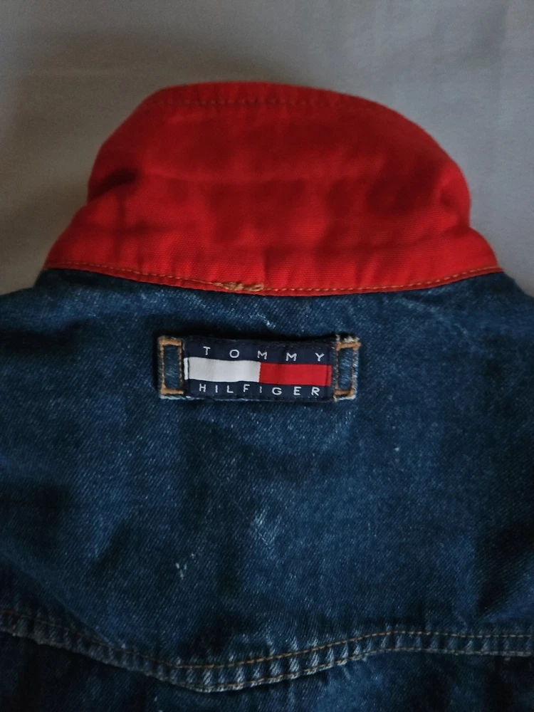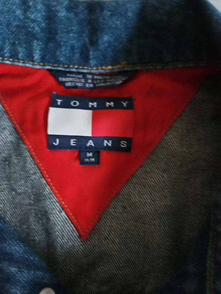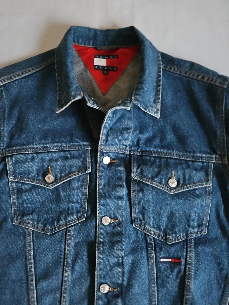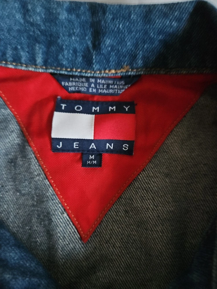 This Tommy Hilfiger denim jacket from the 1990s is a vintage piece with a hip-hop look, featuring red nylon trim and a bold blue color. Made from denim with a regular fit, this jacket is a stylish and unique addition to any man's wardrobe. With a medium size and a chest size of 46 inches, it is perfect for everyday wear and adds a retro touch to any outfit. Made in Mauritius, this original Tommy Hilfiger jacket combines classic style with a modern twist. Pre-owned Excellent Condition
