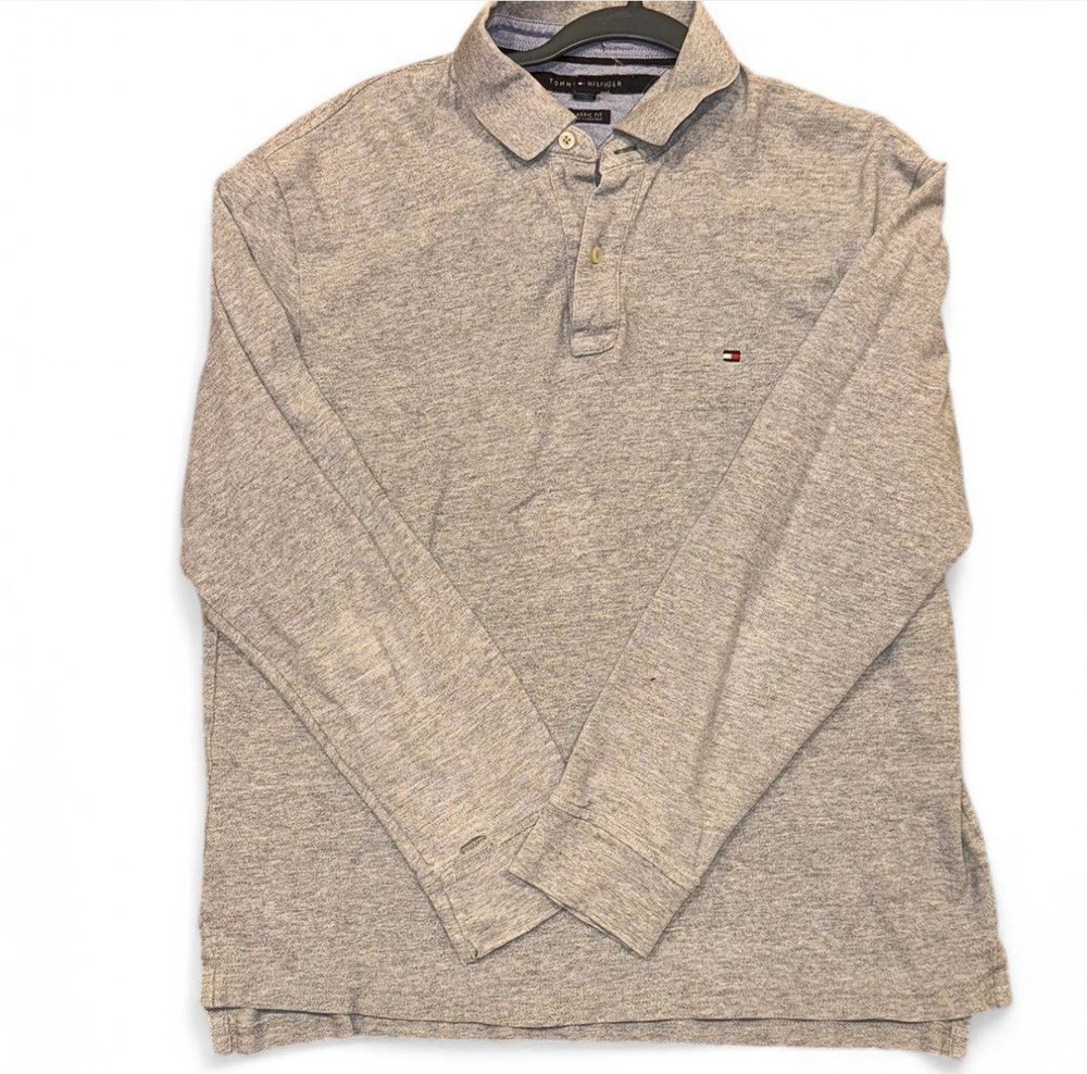 The Tommy Hilfiger Classic Fit Men's Large Grey Long Sleeve Polo Shirt is a stylish and versatile wardrobe staple for men. Made from 100% cotton knit fabric, this collared polo features a classic button closure and long sleeves, making it suitable for both casual and party occasions. The grey color and Tommy Hilfiger logo accent add a touch of sophistication to this timeless piece. With a regular fit and spread collar style, this polo is a perfect addition to any man's clothing collection, suitable for all seasons.