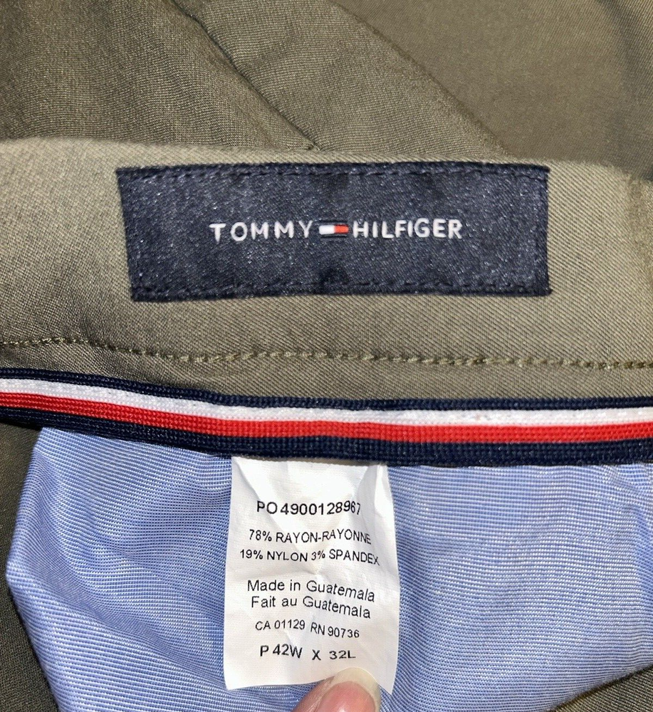 Tommy Hilfiger Pants Mens 42x32 (Measures 40x30) Stretch TH Flex Olive Comfort In very good gently used condition. Measured flat: 20" waist, double this 11.5" Rise 30.5" Inseam 8" Leg opening at hem