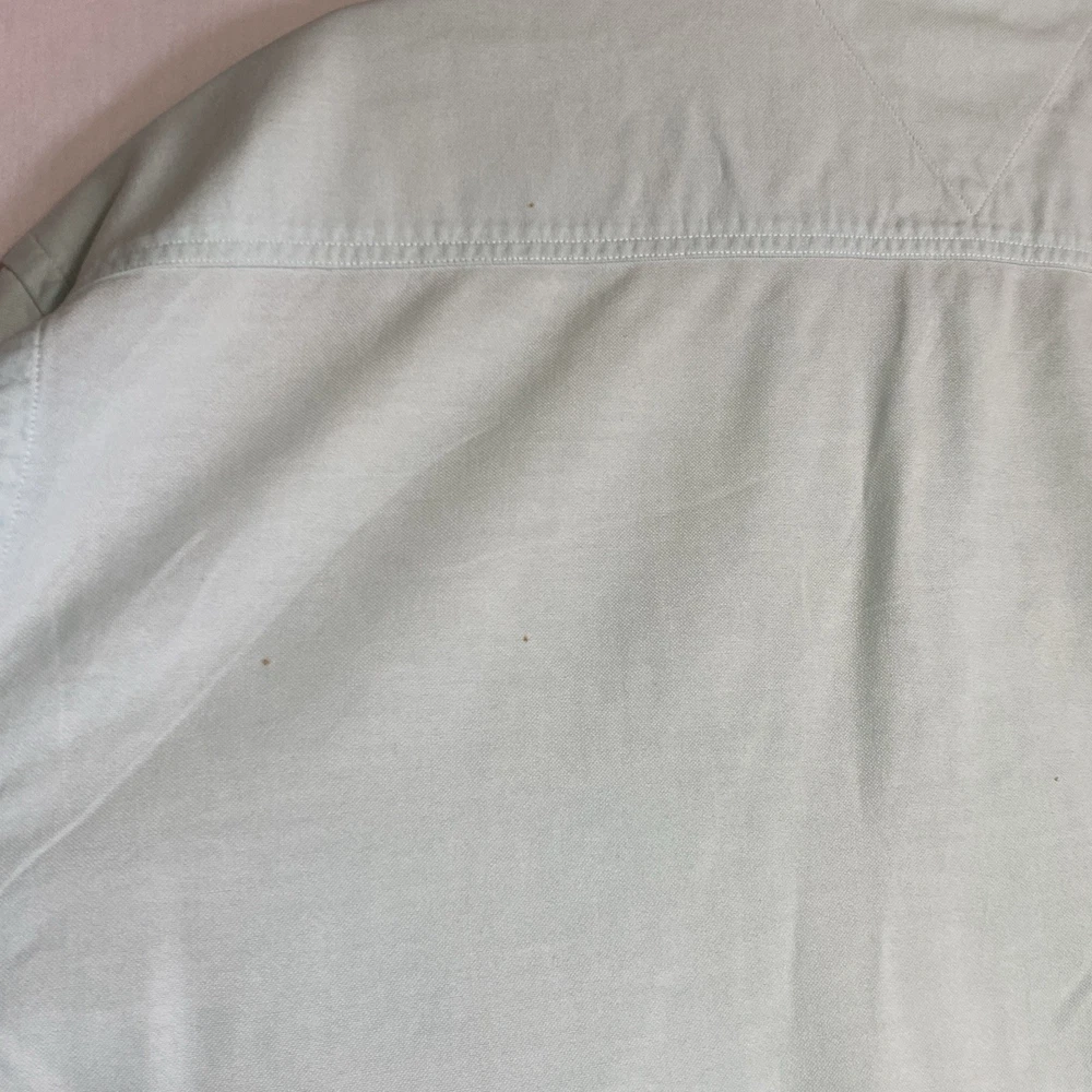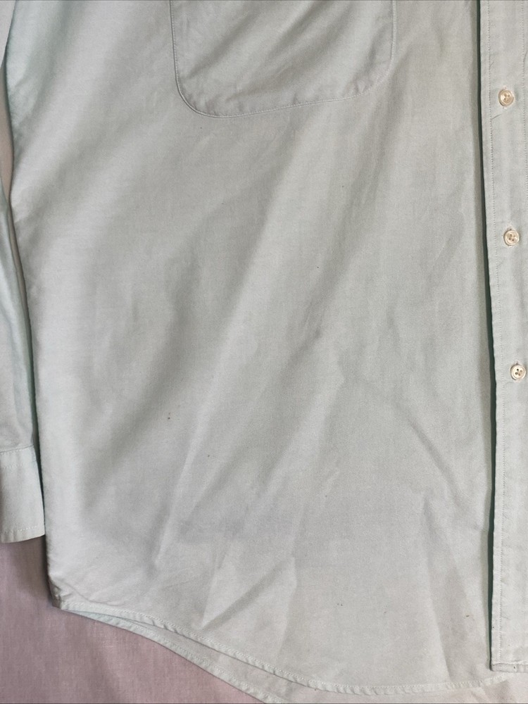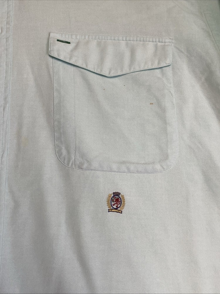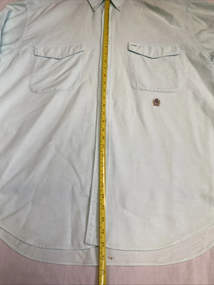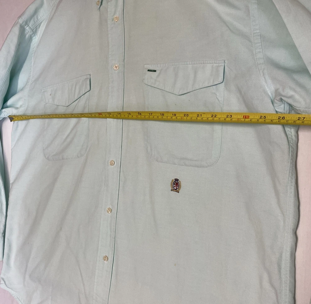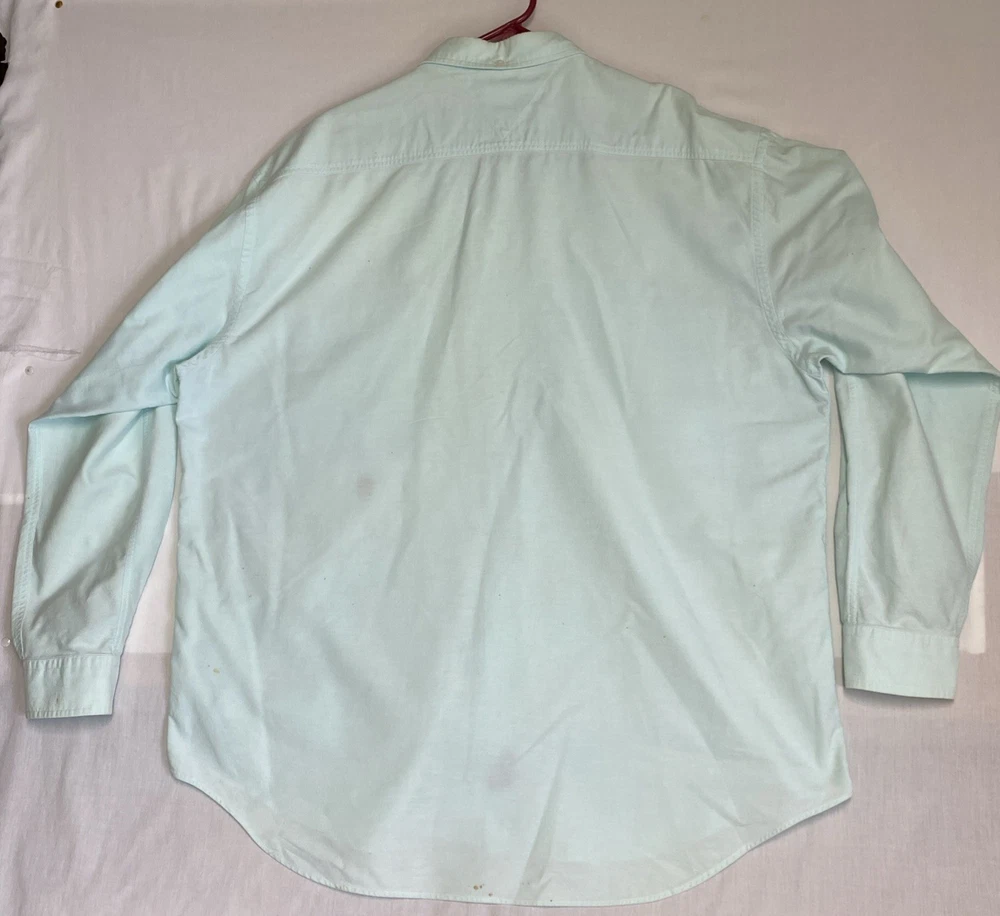 Brand: Tommy Hilfiger Jeans Size: Men’s XL Color: Mint green (faded chambray style) Style: Long sleeve button-down shirt Material: Tag is missing— likely 100% cotton or cotton blend Fit: Regular fit Chest (pit to pit): 26 inches Condition: Pre-owned – See details below Condition Notes: • Multiple small stain specs on both front and back • Faint discoloration on back area • No rips or holes • Priced accordingly due to cosmetic flaws • Great worn-in/distressed look — ideal for workwear, layering, or casual styling Features: • Button front closure • Buttoned cuffs • Classic Tommy Hilfiger embroidered logo on chest pocket • Lightweight, breathable fabric Care: Machine washable Please see all photos for condition details.