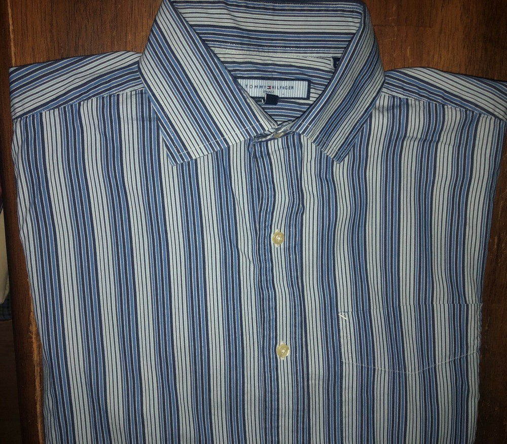 Men's Tommy Hilfiger Ithaca long sleeve button front shirt: Size Medium 15 1/2 32/33 All cotton French cuffs Blue and navy multicolor vertical stripes One pocket Excellent condition! Measures approximately 24x30 Smoke-free home! Fast shipping with tracking information provided!
