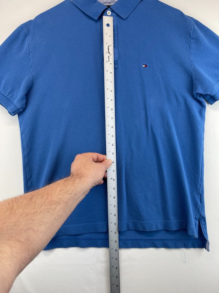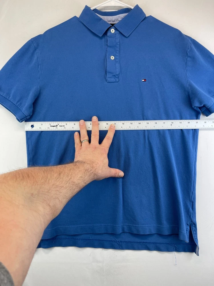 This Tommy Hilfiger Polo Shirt is a stylish addition to any man's wardrobe. Made from 100% cotton knit fabric, it features a classic blue color with the brand's iconic logo accent. The collared shirt with a button closure is versatile for various occasions such as casual wear, workwear, and even parties. With a comfortable regular fit and short sleeves, this breathable shirt is suitable for all seasons, making it a timeless and practical choice for any man looking for a classic and preppy polo shirt. Very good preowned condition with normal preowned wear and a few loose threads on the inner seam as pictured. Please see all photos; specifically for measurements. For clothing specifically, see photos for all measurements and/or any issues if applicable. Pay close attention to the measurements as the size of the garment may quite possibly be different than the actual measurement(s) due to washing, shrinkage, or stretching as these are used clothes. The size in the title is the size on the tag of the garment. See photos for measurements of actual measurements as they may differ. ALWAYS CHECK THE MEASUREMENTS IN THE PHOTOS. This will remove any questions on measurements as well as always cover the possibility of human error in the listing(s) in the case of a typo or oversight. All clothing and shoes have been washed/cleaned, and are cleaned and stored in a smoke free environment. However, please keep in mind that these are preowned items and there is always a possibility of there being preowned dirt, dust, or stray hairs present. I do my best to clean these items with hair collecting products in the dryer after being washed, and by hand with shoes. If shoe trees appear in the photos, they are for photography purposes only to illustrate how the shoes look filled out, and are not included. I am available for questions. I accept or negotiate reasonable offers. Have an amazing day. Thank you.