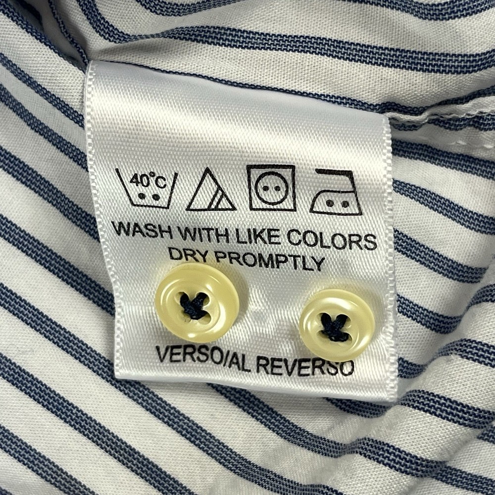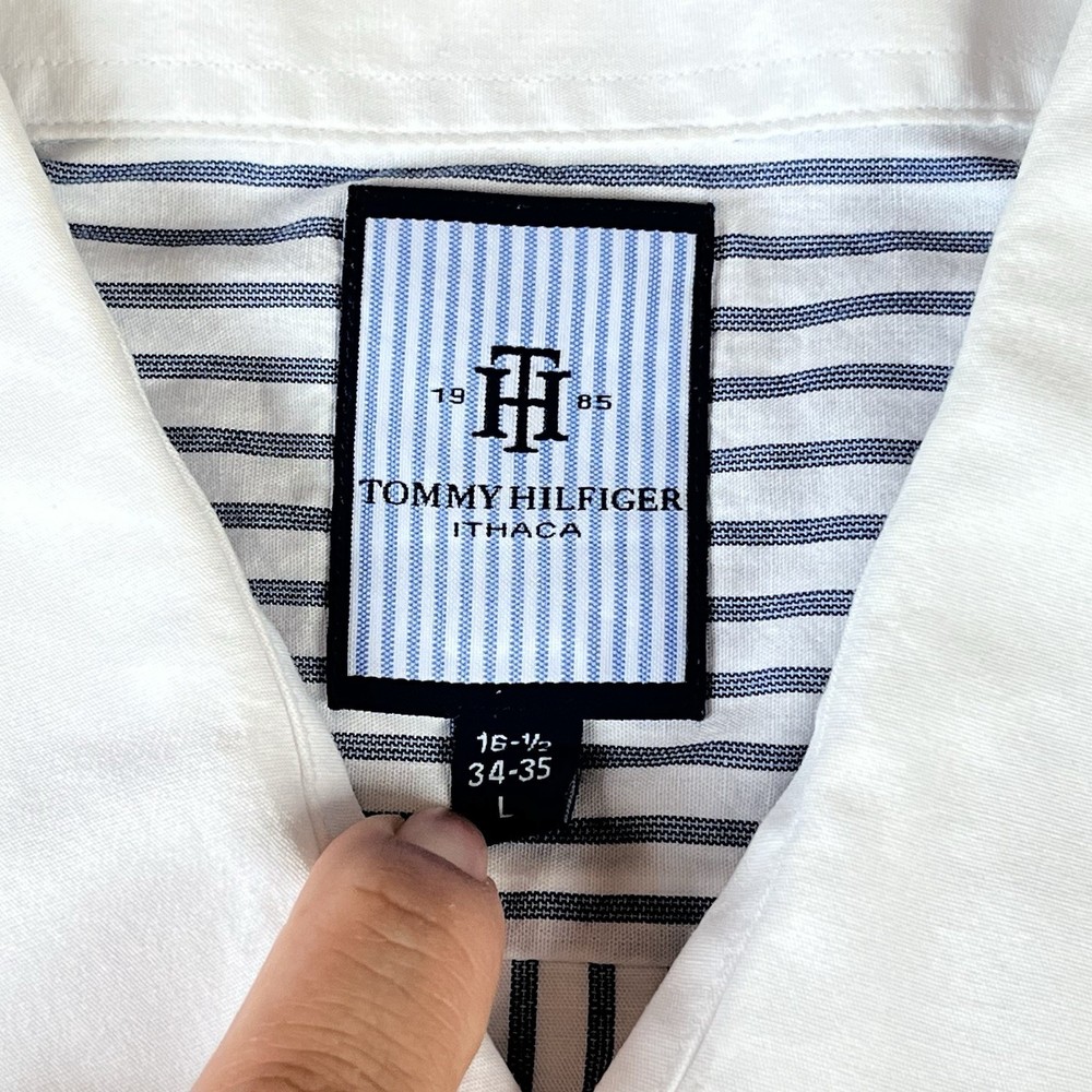 Elevate your wardrobe with the timeless elegance of the Tommy Hilfiger Ithaca Dress Shirt. Designed for the discerning gentleman, this men's dress shirt features a classic spread collar and long sleeves, tailored to fit a neck size of 16.5 inches and a chest size of 48 inches. The light blue striped pattern adds a touch of sophistication to any outfit, making it ideal for a range of occasions from business meetings to weddings. Crafted from high-quality cotton, this shirt ensures comfort and durability. The woven fabric is machine washable, allowing for easy care and maintenance. The slimming features and regular fit of this dress shirt accentuate a sleek silhouette, embodying the essence of American preppy style. Whether you're dressing up for a cocktail party or maintaining a professional look for workwear, the Tommy Hilfiger Ithaca shirt is a versatile addition to your collection.