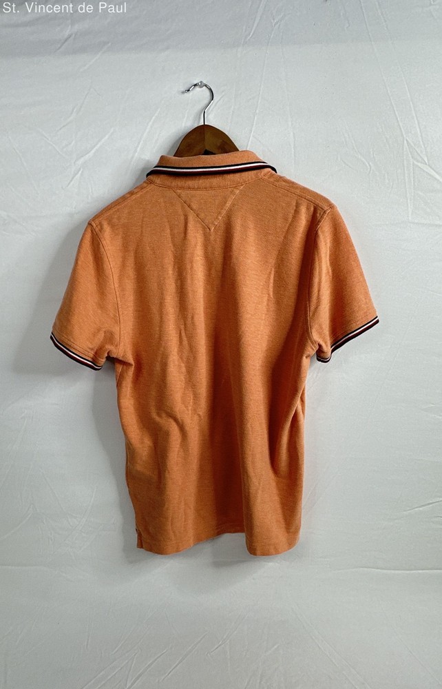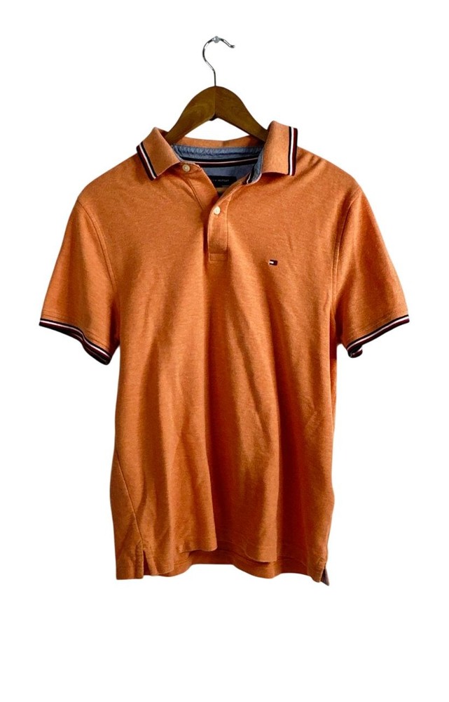 Tommy Hilfiger Orange Peach Flag Pride Short Sleeve Polo Shirt. Men's - Size M Brand: Tommy Hilfiger Type: Flag Pride Short Sleeve Polo Shirt. Men's Condition: Excellent - shows no sign of wear Size: M Color/Pattern: Orange Peach Tommy Hilfiger Men's Flag Pride Polo Shirt in an orange color. It features a classic polo design with a two-button placket, short sleeves, and a contrasting stripe on the collar and cuffs . The shirt is made of cotton and has the Tommy Hilfiger logo embroidered on the chest.