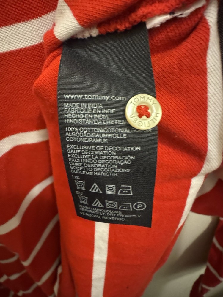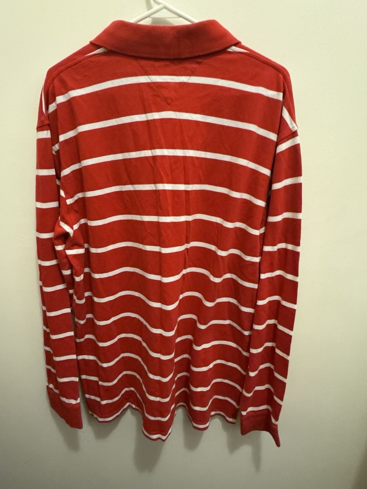 This Tommy Hilfiger Polo Shirt in Men's XL is a stylish and versatile addition to any wardrobe. Made from comfortable cotton knit fabric, it features a classic red and white striped pattern with a collared neckline and button closure. Suitable for a variety of occasions such as travel, casual outings, workwear, or business meetings, this shirt is machine washable for easy care. With its Tommy Hilfiger logo accents and regular fit, this polo shirt is perfect for everyday wear in any season. See photos for item condition. SKU: M117