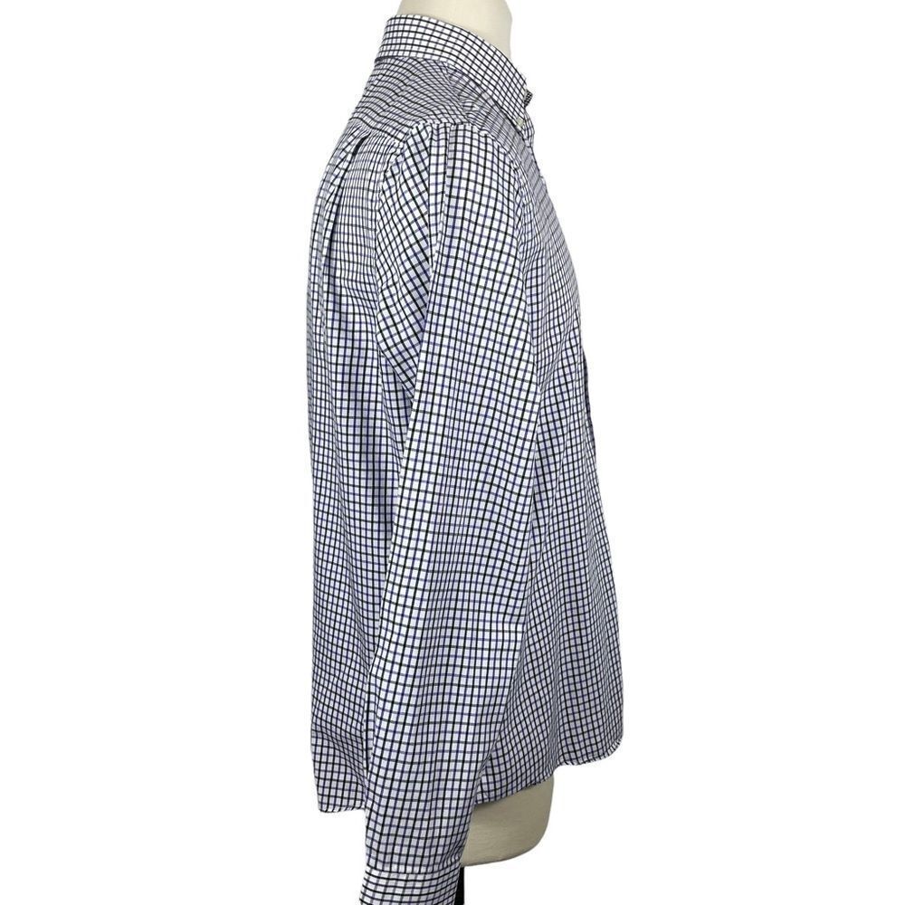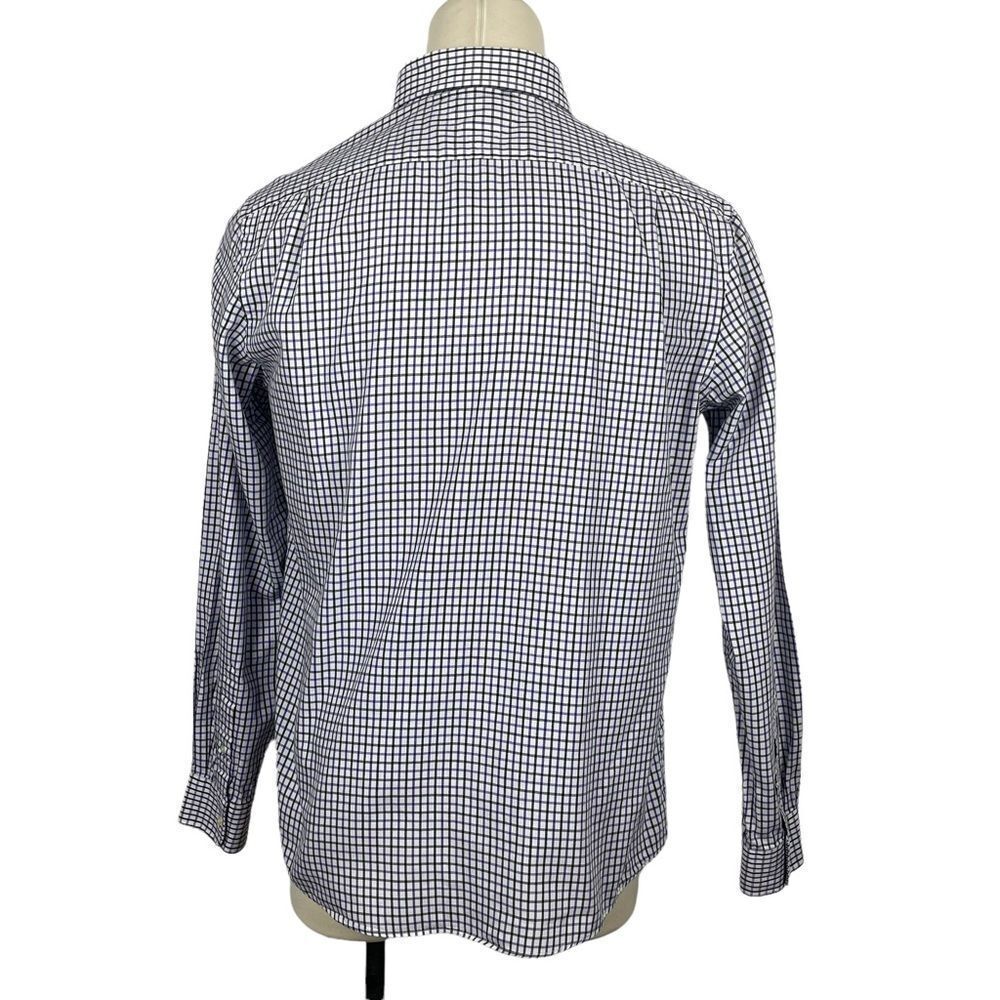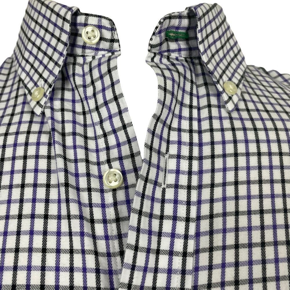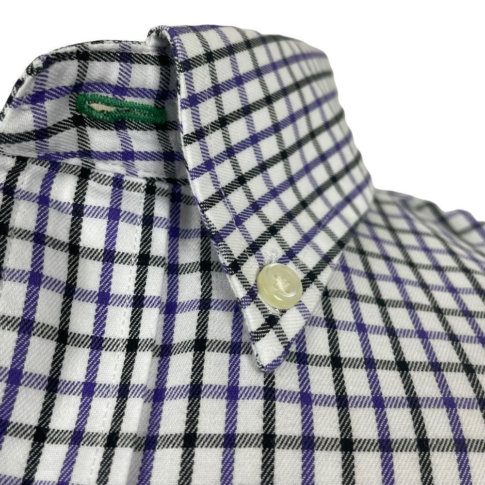 This is a great looking dress shirt It is in great condition with no stains or tears or holes Slim Fit Buttoned Collar Front Left Pocket Purple & Black Plaid 100% Cotton From a smoke and pet free home Size: 17 Width Pit To Pit: 24" Sleeve Length: 37" Length: 31"
