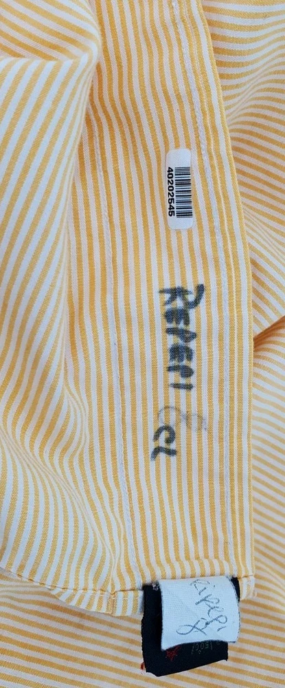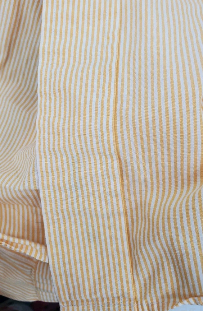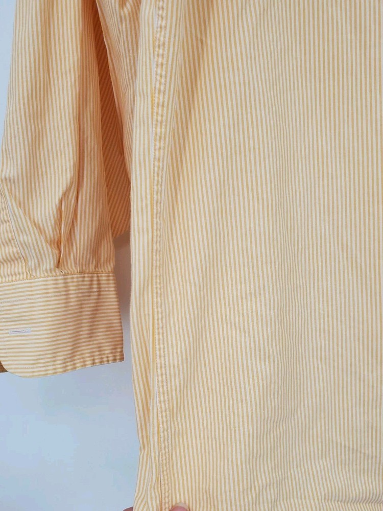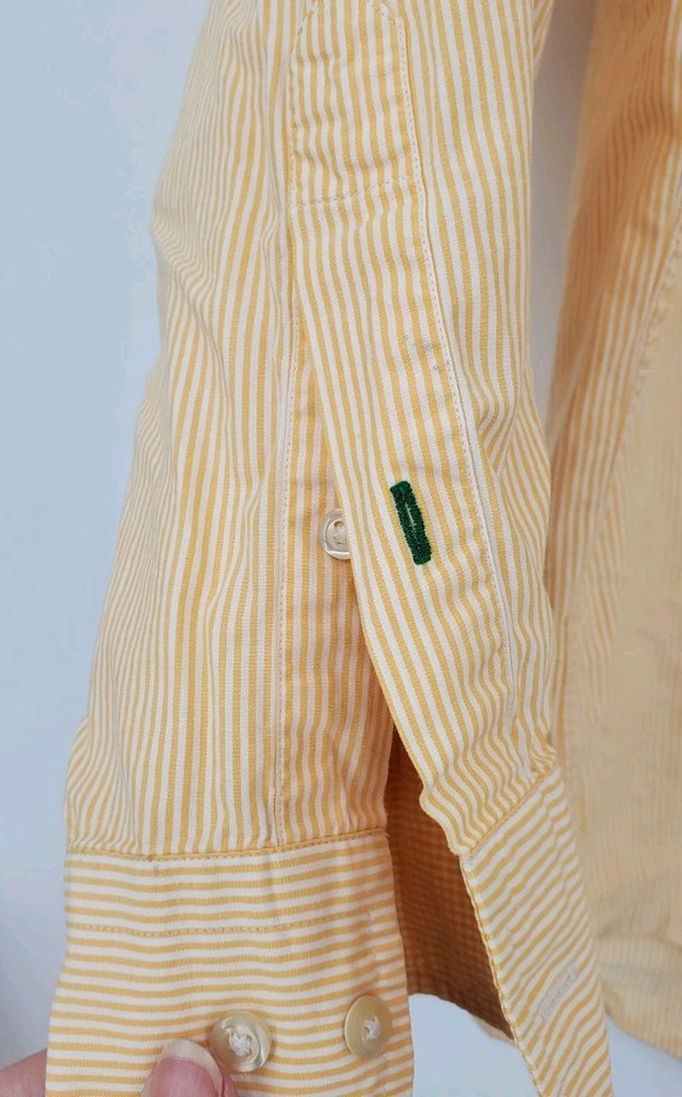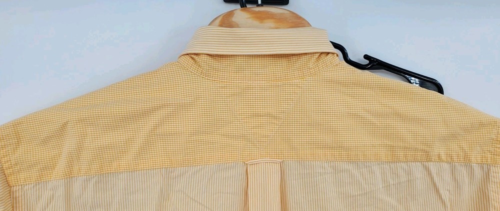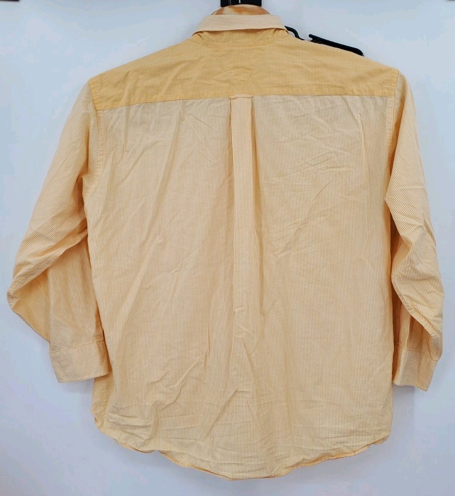 Tommy Hilfiger American Classics Button Down Shirt Yellow/ White Vintage Men's 17 34/35. It's yellow and white striped with a check pattern across the back of the shoulders. It's made of 100% cotton and there is a name and dry cleaning tag on the inside of the button flap. I took a picture of the front and back, so you can see the name isn't visible on the outside. Please check measurements as preowned item measurements may vary. The measurement across the chest laying flat is 27 1/2 inches, the length from the shoulder to the bottom is 30 inches, the measurement from the middle back of the neck to the shoulder seam is 11 1/2 inches and the length from the middle back of the neck to the end of the sleeve is 34 1/2 inches.