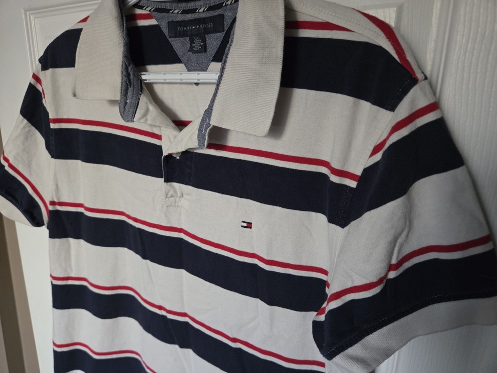 Elevate your casual wardrobe with the classic Tommy Hilfiger White Red Blue Stripe Polo T-Shirt in men's size large. Featuring the iconic striped pattern in a crisp white base accented with red and blue hues, this polo is a versatile addition to your collection. The short sleeves, collared neckline, and breathable 100% cotton material make it an ideal choice for all seasons and a variety of activities, from walking and school events to golf and hiking. The shirt's easy-care fabric ensures a light wash that maintains its look and feel, perfect for the man on the go. The regular fit offers comfort without sacrificing style, and the shirt's timeless design is complemented by the quality and prestige of the Tommy Hilfiger brand. Whether paired with jeans or shorts, this polo is a staple for any occasion.