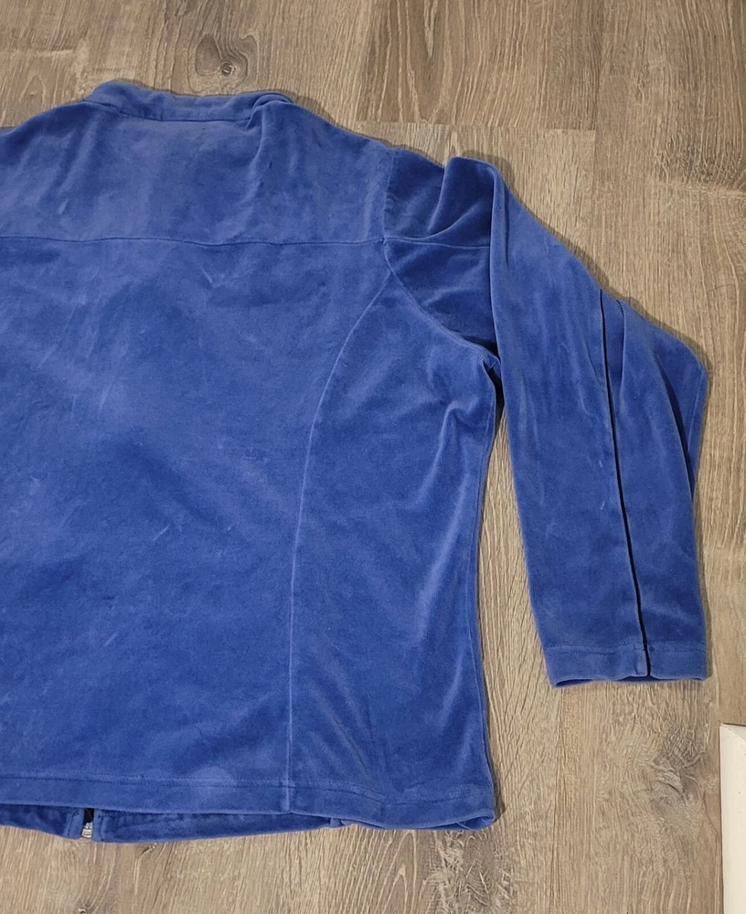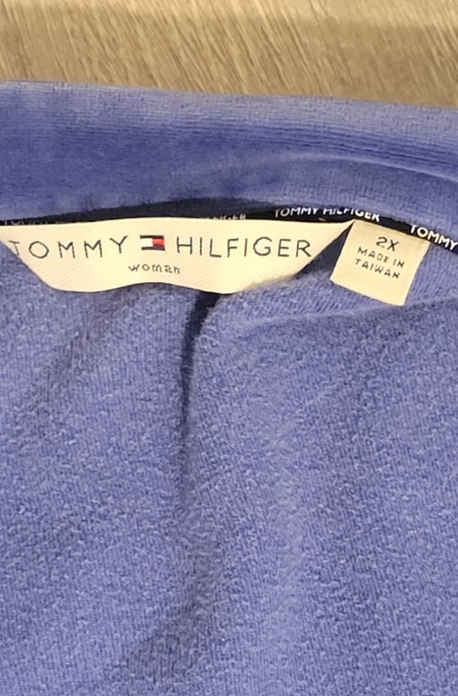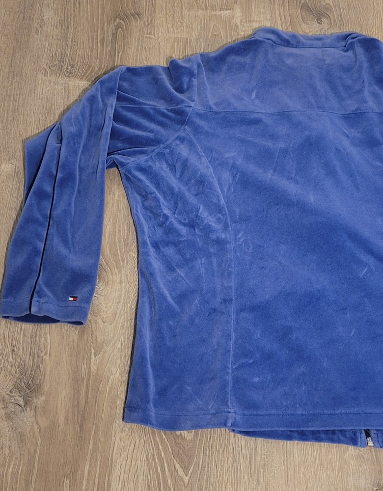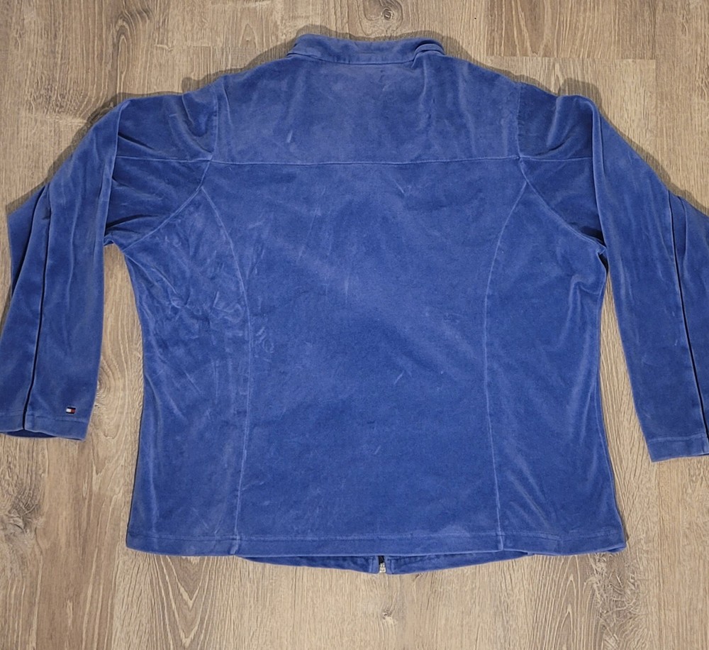 For sale is a women's Tommy Hilfiger velour jacket in size 2X. This jacket features a solid pattern with contrasting trim and pockets. It has a relaxed fit and long sleeves with a zip closure. The jacket is part of a tracksuit set that includes one piece. This versatile jacket is perfect for travel, activewear, and casual occasions. It is machine washable and suitable for all seasons, including winter, summer, fall, and spring. The jacket comes in a beautiful blue color and is made of high-quality velour fabric. FS1