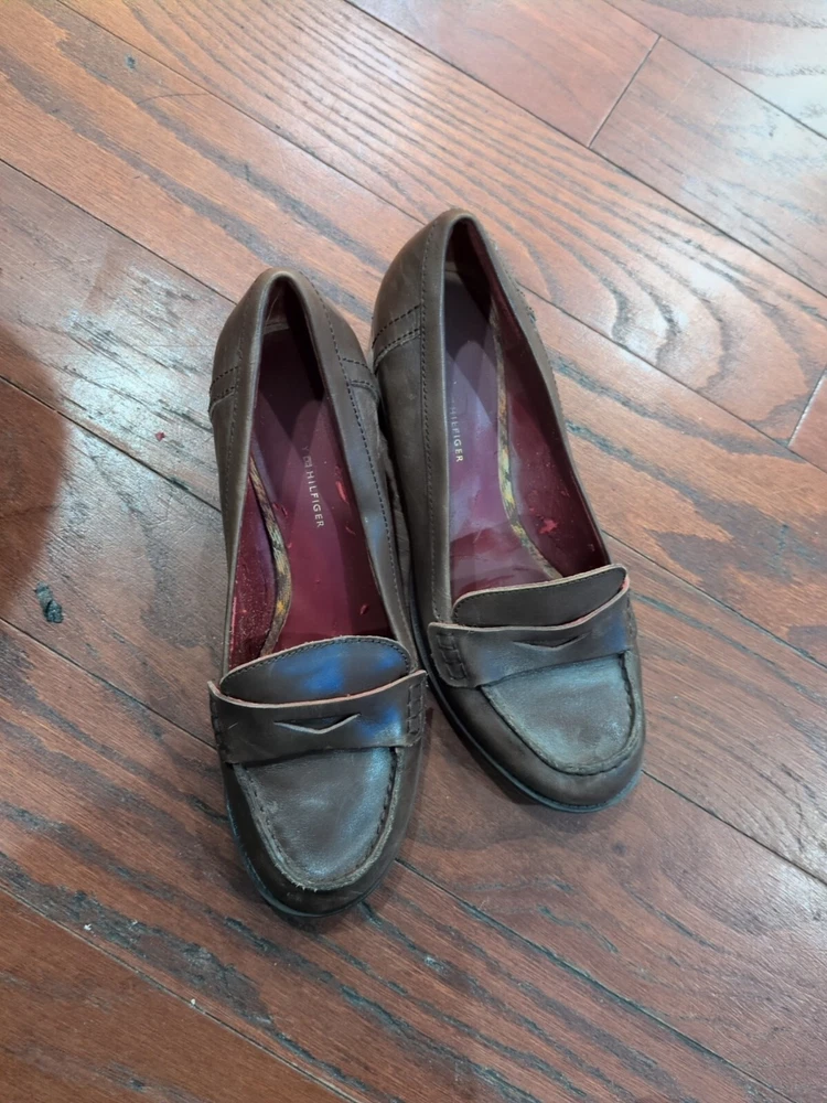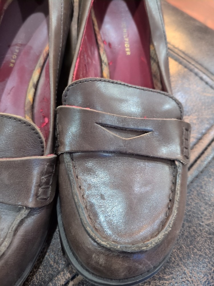 These Tommy Hilfiger loafers are women's slip-on shoes in a dark brown color, featuring a low block heel for added comfort. With a round toe shape and a low top shaft style, they are designed for casual wear. The shoes are made of leather with a synthetic lining, offering a stylish and durable option for everyday use. The slip-on closure and rubber outsole make them convenient and practical for on-the-go activities. Perfect for a casual and comfortable look, these loafers are a versatile addition to any wardrobe.