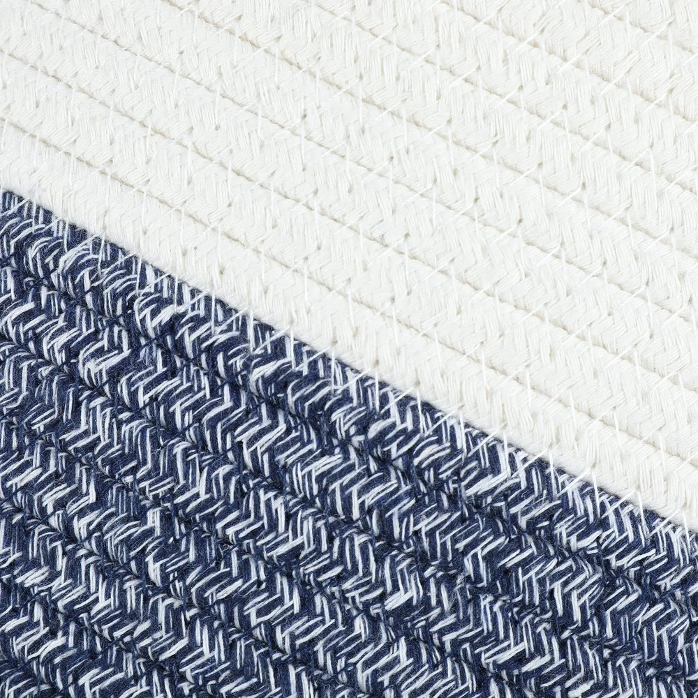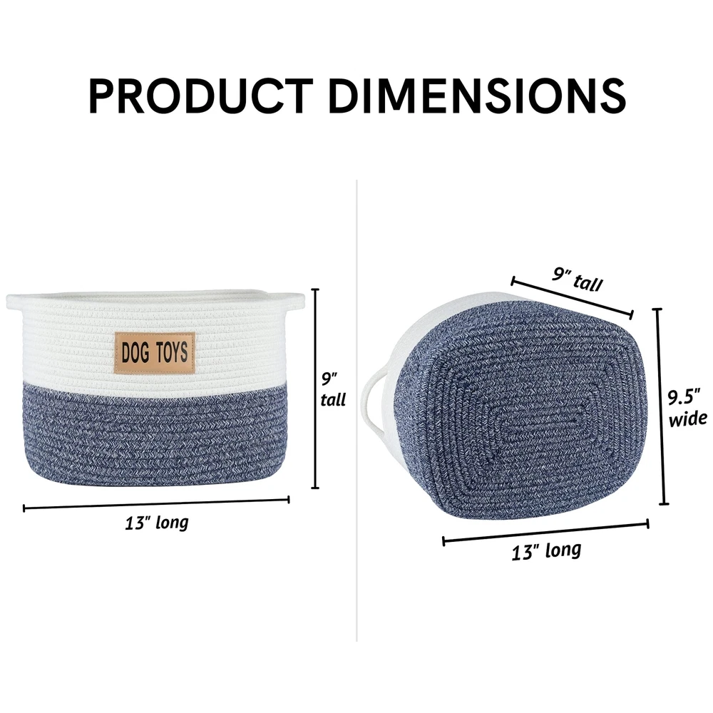13" x 9.5" x 9" A stylish toned blue and white cotton rope dog toy storage basket will be a great addition to your home decor. This makes for an easy way to your dog's toys. Top access allows them to pick and choose what they want.