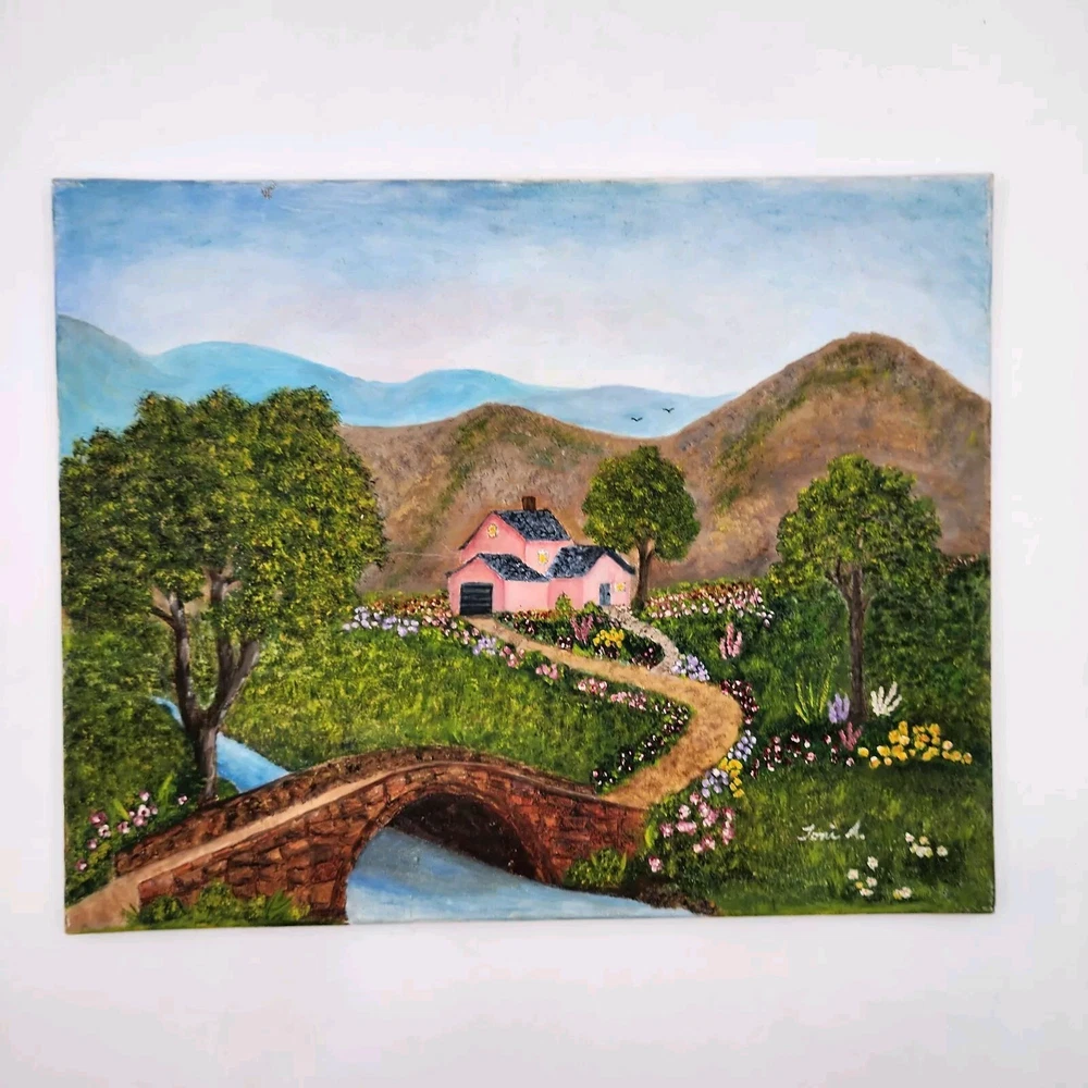 HomeToni A. Painting Landscape House Woods Bridge Original Signed Folk Art 20"x16"