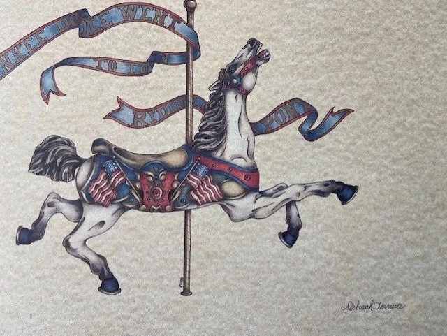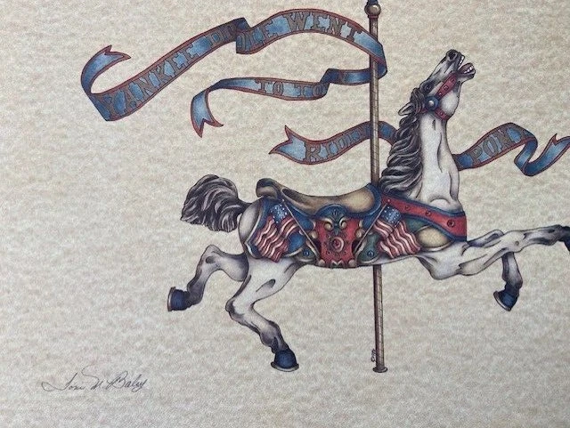 A unframed print by Toni M. Baley and Deborah Ferrusa of a Carousel Horse. Perfect in a nursery for a boy or girl. Frame not included. You can have it framed with your choice of pink or blue border matting and choice of frame. Will ship to insure un-damaged delivery. Picture measures11x14 outside dimension. Picture is actually 9.3/8 w x 10.1/4