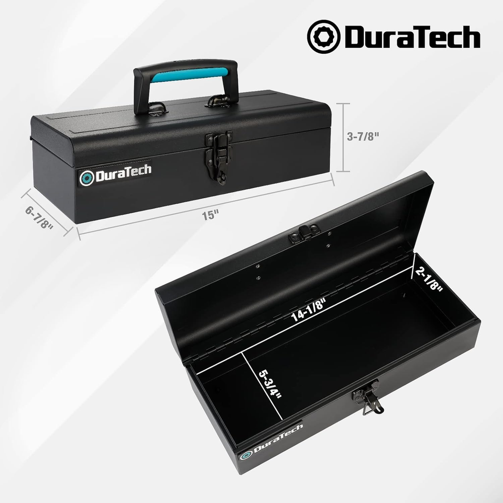 [STURDY & DURABLE] The entire tool box uses high quality carbon steel, which is strong and durable and not easily deformed and damaged when used. Metal surface spray-painted treatment makes it easy to clean and preventing rust. [PORTABLE] 15-inch small handheld tool box is ideal for the car and household use, lightweight for carrying. Outside dimensions: 15" x 6-7/8" x 3-7/8". Internal size: 14-1/8" x 5-3/4" x 2-1/8". Item Weight: 3.3 lbs. Rated up to 30 lbs. [ORGANIZATION] DuraTech Tool Box Organizer can contain your hammer, screwdrivers, wrenches and pliers among many others while keeping the tool kit organized. [LOCKABLE LATCH & ANTI-SLIP PADS] The 4 non-slip foot pads design at the bottom makes it stable in structure. Equipped with a plastic Non-slip handle and a steel latch with small padlock eye, keep your hand tools safe (LOCK NOT INCLUDE). [WIDELY APPLICATION] Great organizer as first aid box, trailer toolbox, mechanic tool box, car tool box, professional tool box, kids tool box and much more.A choice as Christmas gifts for women, men and kids, orangized the hand tools. Product Description Professional Quality DuraTech metal tool box is made of heavy-duty steel, fine workmanship and beautiful design. A necessary tool storage box for every family. DuraTech 15" Portable Steel Tool Box Hand-friendly matting body and anti-slip design upgrade your use experience. Metal connecting shaft:Open and close smoothly, strong and sturdy. Toolbox outside dimensions:15" x 6-7/8" x 3-7/8". 15-inch small tool box is ideal for household use, lightweight for carrying. Rated up to 30 lbs. PRODUCT DETAILS ERGONOMIC HANDLE Non-Slip handle for more comfortable and firm to hold, more convenient to carry STABLE SAFETY LOCK Lockable latch design allows you to lock and ensure your tools safety ANTI-SLIP PADS 4 Non-slip pads can effectively prevent the box from sliding, reduce noise and protect your floor