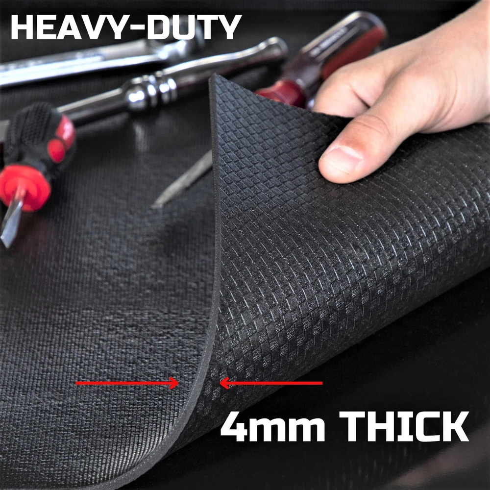 PROTECS DRAWERS & TOOLS: toolbox drawer liners protect your tools from scratching & sliding, Keep your tools and toolbox or workbench in pristine condition with our heavy duty tool box liner; Protects surfaces from grease stains, oil spills, dings and dents. DURABLE & QUALITY: 4mm thickness, made to last with increased protection of natural wear, tear and heat-resistant. Durable material stands up to common workshop chemicals, making it the perfect long-term addition for mechanics and craftsman. The foam rubber mat is tough enough to support any heavy tools; Thick and durable drawer and shelf liner is superior when it comes to durability. ANTI-SLIP ORGANIZER: Non-slip surface grips tools and prevents movement or shifting when drawers are slammed. Our tool box mat keeps your tools in place on the move, in your trunk, or when opening and closing the drawers of your rolling tool chest. EASY TO CUT & PLACE: The rubber foam drawer liner makes measuring and cutting easy so that you can easily and quickly install this liner in any tool box drawers. The tool box liner is perfect to fit any brand tool box such as Craftsman, Snap on, Husky, Milwaukee, US General and so on. 100% SATISFACTION GUARANTEED: You never regret shopping black drawer liner. Quality and customer satisfaction is our priority. We 100% return in 365 days if you are not completely satisfied receiving our toolbox liners, you can feel free to us anytime. SPECIFICATIONS: Tool box liner, Size: 30 inch wide x 22 feet long, thickness: 4mm thick, Material: Rubber, Color: Black, Non-slip surfaces.