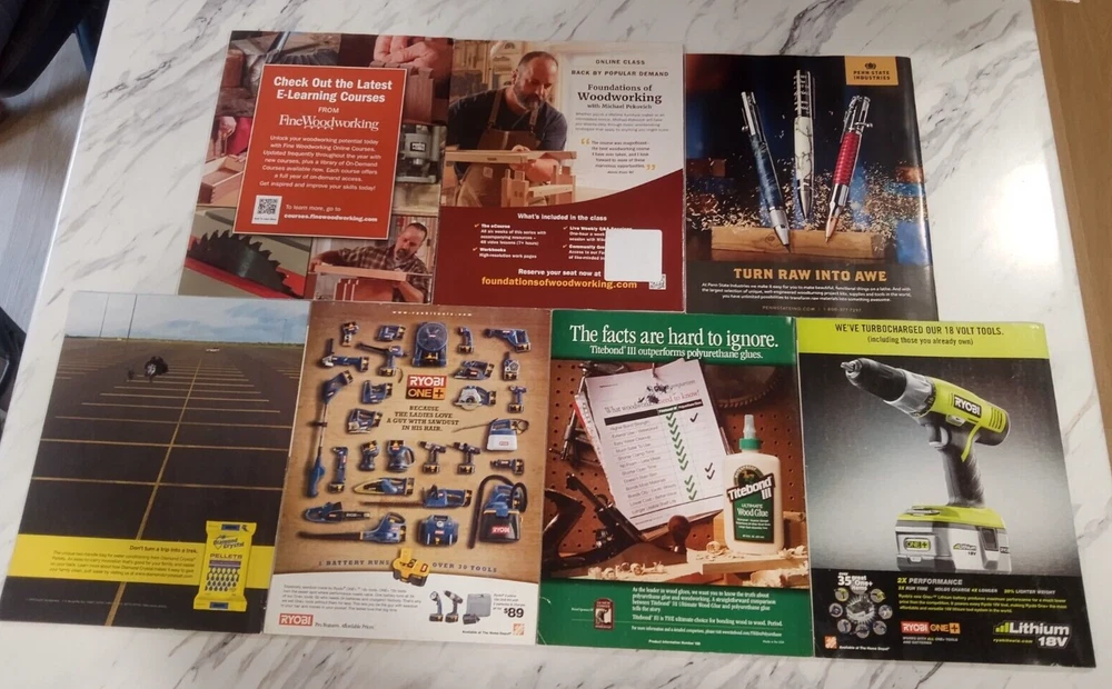 Tools & Shops, Wood, & Workbench 7 Magazine Lot: Tools & Shops: *Winter 2024 - #307 - Annual Issue - Floor-Standing Tool Cabinet - Ex-Library Copy *Winter 2023 - #300 - Annual Issue - Carriage Doors For Your Shop - Ex-Library Copy Wood: *March 2024 - Issue #294 - Super Cyclone Workbench (All Library Copies, And Have Some Writing On The Covers): * December 2008 - Volume 64 No. 6 Issue #310 - Simple Kitchen Updates * October 2008 - Volume 64 No. 5 Issue #309 - Create Your Own Relaxing Retreat * April 2008 - Volume 64 No. 2 Issue #306 - Before & After Amazing Home Makeovers * February 2008 - Volume 64 No. 1 Issue #305 - Get Organized!