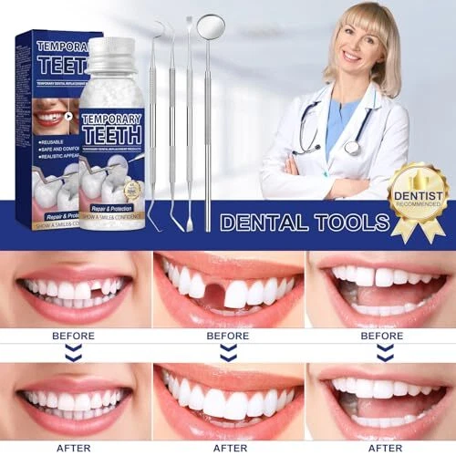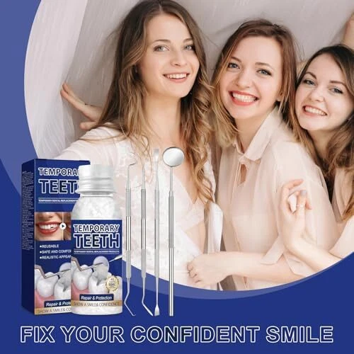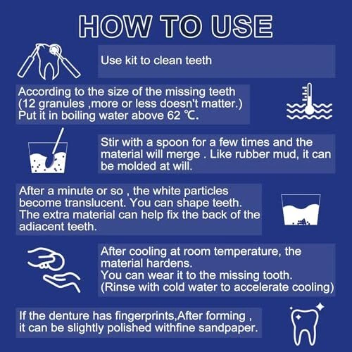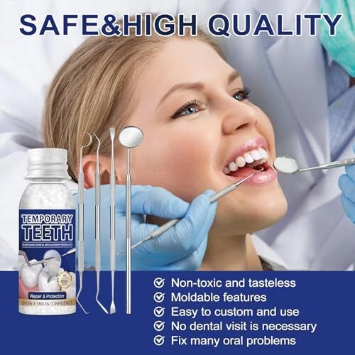Return Policy Fast Delivery Trusted seller Tooth Repair Kit, Moldable Tooth Filling Repair Kit with 4 Dental Tool, Dental Care Kit Fixing The Missing and Broken Replacements, DIY Natural Filling Fake Teeth,Smile Confidently Again-1 Product Description 【CompleteTooth Repair Kit】 :This tooth replacement kit contains everything you need to create replacement teeth(30ml Tooth beads +4 Dental Tools), moldable polymer plastic beads that you can sculpt into realistic teeth or crowns in minutes, these beads are high quality and non-toxic so they are extremely durable. 【Easy and Convenient】 :Heat the tooth replacement beads with warm or hot water, shape the material to fit the missing tooth in the upper or lower jaw, and once it dries, the tooth snaps into place - no dental cement or glue needed! Teeth can be stained with cold coffee or tea to match your smile. 【Please Note】 :Temporary teeth are used to replace a missing tooth or crown but are not intended to replace a broken or chipped tooth. It is recommended that you need to follow the instructions for best results. Some clients may have difficulty getting their teeth done as our product does require some craftsmanship skills. Once you get the hang of it you will find it convenient and you will enjoy this method of dental restoration. 【Smile with Confidence】 :Smiling is the best way to socialize, so don't let missing teeth keep you from smiling. Regain your confidence with our temporary tooth replacement kits, these bead's are natural in color and our kits are a great do-it-yourself temporary tooth restoration option until you see your dentist or get dental implants. 【Wide Application】 :Suitable for all dental restorations, don't worry about the size. Broken teeth, large gaps, uneven teeth, missing teeth can be fixed by yourself, DIY your own teeth at home, save time and money. Whether it's an important occasion such as a date, a job interview or a party, dentures can help you regain your confidence and increase your attractiveness. Shipping Returns Payment Shipping Shipping is FREE to all addresses other than APO/PO boxes in the lower 48 states. All our stock ships from US-based warehouses. Shipped via USPS or UPS (depending on location and package weight) Unless stated otherwise, all orders will ship within 24-72 hours of your payment being processed. Check our feedback to see the great reviews of FAST shipping we offer. Returns Seller does not accept returns Payment We currently accept payment via eBay managed payments only. Once payment is cleared, we will dispatch your shipment within 1-3 business days. Please refer to the "Shipping" tab for more information regarding shipping speed to your destination.