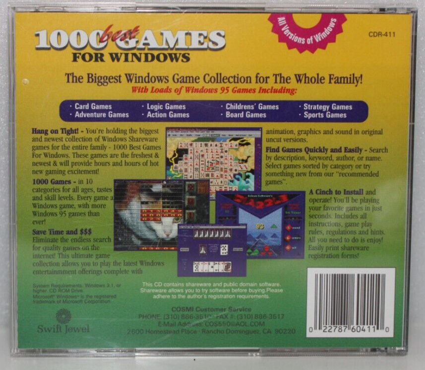 Check out my eBay store for more great items! 1000 BEST GAMES FOR WINDOWS PC CD ROM GAME CASE HAS SOME WEAR. DISC HAS SOME MINOR SCRATCHES. PLEASE CHECK OUT THE PHOTOS! Check out my eBay store for more great items! SHIPPING US: ALL ITEMS SHIPPED WITH DELIVERY CONFIRMATION. I TRY MY BEST TO ONLY CHARGE ACTUAL SHIPPING COSTS. NO HANDLING FEES. YOUR ITEM USUALLY SHIPS OUT WITHIN 24 HOURS OF PAYMENT. SHIPPING INTERNATIONAL: BUYER IS RESPONSIBLE FOR ANY POSSIBLE FEES, TAXES OR DUTIES ASSOCIATED WITH IMPORT OF THE ITEM. I WILL NOT MARK THE ITEM AS A GIFT OR LOWER THE VALUE OF THE ITEM SO PLEASE DO NOT ASK. IT IS BUYERS RESPONSIBILITY TO MAKE SURE THE ITEM BEING PURCHASED IS ABLE TO BE IMPORTED. RETURN POLICY: I WILL GLADLY ACCEPT A RETURN OF ANY ITEM I SELL. BUYER IS TO CONTACT ME WITHIN 14 DAYS TO ARRANGE RETURN. ITEM MUST BE SENT BACK IN THE SAME CONDITION AS IT WAS SENT TO YOU INCLUDING ALL PARTS. OTHER: FEEDBACK IS LEFT AUTOMATICALLY AFTER IT HAS BEEN LEFT FOR ME. PAYMENT IS TO BE MADE WITHIN 4 DAYS OR THE ORDER WILL BE CANCELLED AND RELISTED. A PACKING LIST OR INVOICE WILL NOT BE AUTOMATICALLY ADDED TO YOUR SHIPMENT TO SAVE ON PAPER WASTE. IF ONE IS REQUIRED PLEASE LEAVE A NOTE WITH PAYMENT REQUESTING ONE. Check out my eBay store for more great items!