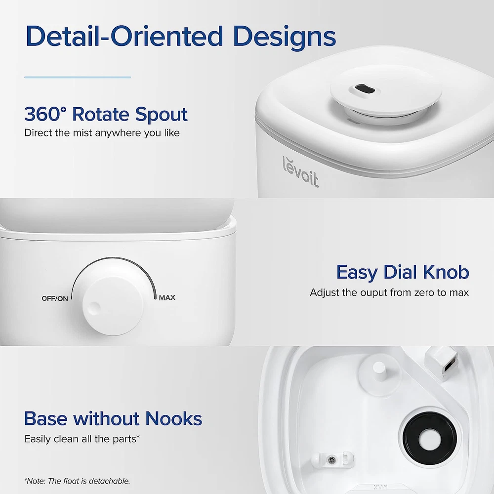 ๐๐๐จ๐ฉ ๐๐ช๐ข๐๐๐๐๐๐๐๐ฉ๐๐ค๐ฃ ๐ผ๐ก๐ก ๐๐๐๐๐ฉ: Runs for up to 25 hours on low thanks to its SUPER LARGE capacity of 2.5 liters. The soothing moisture helps quickly relief congestion and dry throat. ๐๐๐จ๐ฎ ๐๐ค๐ฅ-๐๐๐ก๐ก ๐ฟ๐๐จ๐๐๐ฃ: LEVOIT listened to feedback from humidifier customers and upgraded to a easy top-fill design. No need to turn the water tank over or spilling water all over the place. Just ONE-STEP to remove the cover and easily fill the tank. ๐๐ช๐๐ ๐๐๐จ๐๐๐ง ๐๐ค๐ง ๐พ๐ก๐๐๐ฃ๐๐ฃ๐: Easily clean the inside of the tank through its big opening. The detachable designs and simple construction of the base leaves no hard-to-reach corners when cleaning. Maintaining health has never been this easy. ๐๐ค ๐ฟ๐๐จ๐ฉ๐ช๐ง๐๐๐ฃ๐๐ ๐๐๐๐ฃ ๐๐ก๐๐๐ฅ๐๐ฃ๐: The Classic 160 cool mist humidifier is perfect for sleeping, with noise level as low as 26dB and all lights off. Helps create a peaceful and quiet atmosphere The perfect humidifier for bedrooms and baby nurseries. ๐พ๐ช๐จ๐ฉ๐ค๐ข๐๐ฏ๐ ๐๐ค๐ช๐ง ๐๐๐จ๐ฉ: Customize the mist output with just one knob and adjust the direction freely with the 360 degree nozzle. Enjoy full control of your air humidifier ๐๐ ๐๐ค๐ฉ ๐๐ค๐ช๐ง ๐ฝ๐๐๐ : Auto shut-off when the water level in base is low and featured with BPA-Free material, for no need to worry about safety issues. Also, you can count on our customer service team in California whenever you need help. ๐๐๐ฅ๐จ: Auto Shut-off function is controlled by the float in the base to stop the machine, there may be some delay in the stopping time, no worries about safety. Besides, there will be a red light when the machine is off due to the low water level. ๐๐๐ฅ๐จ: To ensure the capture and filtration of fine impurities, we provide our valued customers with a ๐ฝ๐ฟ๐ฒ-๐ถ๐ป๐๐๐ฎ๐น๐น๐ฒ๐ฑ water filter sponge. We hope you relish the soothing and healthful humidification experience delivered by our Classic 160 humidifier. ๐๐๐ฅ๐จ: It is not recommended to add essential oil to this humidifier. Item dimensions: 6.38"D x 7.12"W x 10.14"H Experience uninterrupted tranquility with our brand new Classic 160 Top Fill Humidifier. Indulge in a blissful night's sleep, knowing that it is diligently moisturizing the air for you and your little one๏ผ Featured with BPA-Free material and Auto Shut-off when the water level in the base is low, there is no need to worry about safety issues. Troubleshooting: 1. Do I need to use distilled water? Yes, we recommend using purified or distilled water to minimize white dust as much as possible. 2. How should I clean the water tank? Please watch the cleaning video in the listing before cleaning the humidifier and follow the steps shown in the video. 3. Should I place the humidifier on a table for use? We recommend placing the humidifier at a higher position and using it in a more open space to achieve the best possible humidification effect. 4. I noticed that the pre-installed filter cotton inside the humidifier got dirty after some time. What should I do? Generally, it lasts about one month, depending on the hardness of the water. You can purchase a replacement on Amazon when the filter cotton becomes dirty. Please search for B09ZY9N6PD or "LEVOIT 10-Pack Humidifier Replacement Filters" on Amazon. 5. Why doesnโt the humidifier turn off immediately when the water tank is empty? The auto shut-off function is controlled by the float in the base to stop the machine. There may be a slight delay in the shut-off time, but there is no safety concern. Additionally, a red light will indicate when the machine turns off due to a low water level. Features: โ Large Water Tank of 2.5L โ Operation that Lasts Up to 25 Hours When Used at the Lowest Level โ Easy Top-Fill Design โ Easy to Clean with Big Opening and Base without Nooks โ Ultra-Quiet Operation โ 360 Rotating Nozzle โ Auto Shut-Off (Controlled by the float to stop the machine, there will be some delay in the stopping time), and there will be a red light when the machine is off due to the low water level. โ BPA-Free for Safety and Reliability โ Comes with Cleaning Brush Your satisfaction with our products is the team's priority. If you find the product damaged or used when you receive it, please don't hesitate to contact us. Specifications: Product Dimensions: 7.1 ร 6.4ร 10.2 in / 18.1 ร 16.2 ร 25.8 cm Product Weight: 2.16 lb / 0.98 kg Whisper-Quiet Operation: 26-28dB Effective Range: 219 ftยฒ / 20 mยฒ Material: BPA free, suitable for babies and adults Fuel Your Classic160 with Levoit Humidifier Replacement Filters Levoit Humidifier Replacement Filters/ Levoit Water Filter Sponge Why to use:Capture and filter fine impurities and particles to improve humidifying efficiency more healthily. When to change: Generally lasts 1 month depending on the hardness of water. Where to buy: Please search B09ZY9N6PD or "LEVOIT 10-Pack Humidifier Replacement Filters" on Amazon.