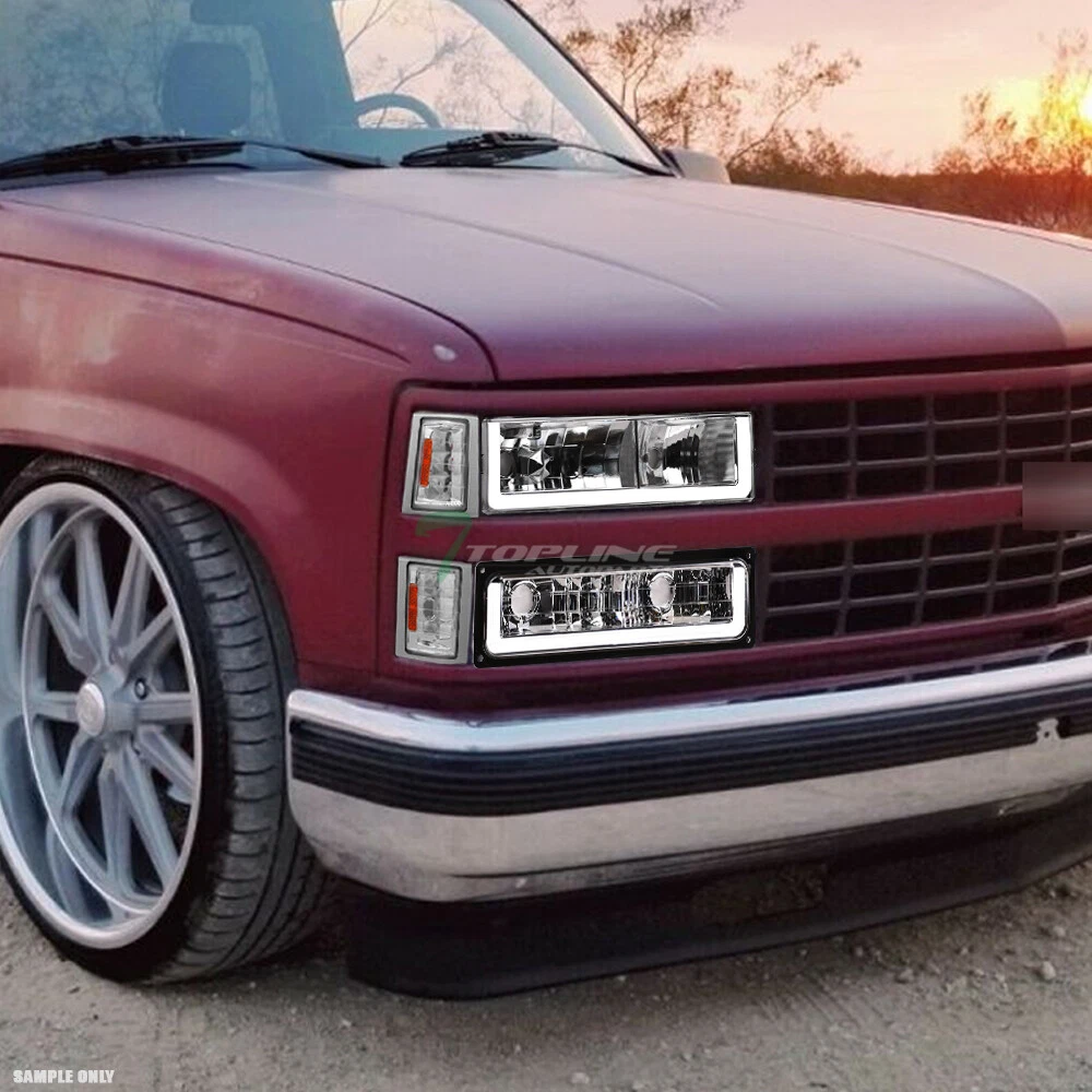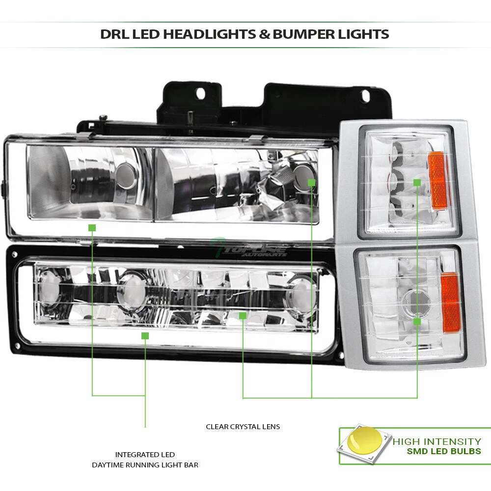 Powered by Frooition Save up to 5% daily deals shop now Topline For 94-00 Chevy C10 CK LED Strip Headlights+Bumpe+k2 Corner Amber Chrome Topline For 94-00 Chevy C10 CK LED Strip Headlights+Bumpe+k2 Corner Amber Chrome Part Number: hlnb-c1088lbw-ch+blnb-c1088lbw-e+clk2-cpu94-ea-201 Description Description Payment Shipping Return & Refund Feedback Description Item Description Crystal Headlights Video will open in a new window Using the eBay App? Paste link into a browser window: [isdntekvideo] Application For 1994-2000 Chevy C10 Pickup Truck Models 1994-2000 Chevy C/K 1500 / 2500 / 3500 Models 1994-1998 Chevy C/K Silverado Models 1994-1999 Chevy C/K Suburban Models 1995-1999 Chevy Tahoe Models Attention Note : Will Only Fit Full Size Truck / SUV Models With Composite Headlights For All Models Above Will Not Fit Models With Sealed Beam Headlights Will Not Fit Facelifted New Generation Models Description Crystal Headlights & Front Signal Parking Bumper Lights & Front Signal Parking Corner Lights ( 4-Pieces ) Features Headlights & Bumper Lights : Custom Design With Fiber Optic LED Strips New Technology High Intensity SMD LED Tube Bar Daytime Running Light Can Be Help Other Road Users Identify & Better Visibility On Road Offers Extra Smooth & Bright Light During Day / Night Time Brings Significant Exterior Upgrade, Give Your Vehicle An Unique Look Corner Lights : Euro Style Direct Replacement Product Details • 100% Brand New In Stock, Item Exactly As The Picture Shown • Comes With A Complete Set ( Driver & Passenger Side ) • Direct Bolt-On Replacement • Instruction Is Not Included, Highly Recommend To Install By Professional Mechanic • Modification Might Require For Using HID Lighting System • Dramatically Improve Both Styling & Appearance • Please Go Check Out Our Ebay Store For More Additional Hot Items Technical Tips : For Cars That Do Not Have Daytime Running Light ( DRL ) Function: The Lights / HALO / LED Part Can Serve As / Give Out Daytime Running Light ( DRL ) As Extra Functions But In Order For It to Work, You Might Need Modifications To The Wirings And Plugs. Additional Wirings & Plugs For Daytime Running Light ( DRL ) Function Will Not Be Provided. Please Advice Mechanics For Installation & Remember that Professional Installation Is Always Highly Recommended. Please make sure all Headlights are install properly, sockets are tightly fastened and all O-rings or rubber gaskets are in great condition. Broken or loose O-rings or rubber gaskets on your factory sockets can cause moisture in your lights ( It can damage your light bulb ). If you happen to have moisture buildup in your lights, please try the following solution. simply remove the lights from the vehicle and set out in the sun or in a dry area for at least few hours. Wait until the moisture has fully evaporated, and reseal around the seams with a clear silicone sealant on the assembly and replace any worn down O-rings or rubber gaskets. This should alleviate the condensation issue. Payment Payment Please complete the Ebay checkout within 3 days after winning. Payment is expected within 3 days after auction ends. Product availability is not guaranteed after 3 days. PAYPAL payment is for US. customer only and we only ship to PayPal confirmed address, no exception. PAYPAL payment ( in USD ) is the only payment method will be accepted for International Buyers. Insufficient payment amount or missing information will delay the process of order, please read the invoice carefully. Shipping Shipping U.S. 48 Contiguous States Shipping Service: UPS / Fedex Ground Price: $ 0 Transit Time: 1-7 Days With Tracking U.S. 48 Contiguous States ( Express Shipping Service ) Shipping Service: FedEx 2Day Price: $ 128 Transit Time: 1-3 Days With Tracking Canada Shipping Service: Fedex International Economy Price: $ 146 Transit Time: 2-5 Business Days With Tracking ( Brokerage Fee Is Included ) Alaska & Hawaii Shipping Service: FedEx 2Day Price: $ 128 Transit Time: 1-3 Days With Tracking International ( U.K. Europe, Australia Only ) Shipping Service: Not Available Price: $ Not Available Transit Time: Not Available There will be 9.5% Sales Tax on the Total sales price With Shipping Cost for California Buyers. " Free Shipping " Services, If offer, is for US Lower 48 States Buyers Only. Alaska & Hawaii will have a different Shipping rate. We accept Paypal / Credit Card payment through Ebay Checkout ONLY. We only ship to Paypal Confirmed Address as this is recommended for both buyer and seller protection. Most of the orders will be shipped out from our main warehouse CA 91789 within 24-48 hours after payment is cleared. The transit time is provided by the shipping carrier based upon the item is picked up. Additional shipping charge will be applied to reship for incorrect address entered by the buyer at checkout. We DO NOT Ship to PO Box , APO, FPO, Puerto Rico , Virgin Islands, Guam , American Samoa , Minor Outlying Islands , Northern Mariana Islands. International & Canada buyers are responsible for any possible brokerage/custom fee. Please consult with your local post office or authority for details. All International countries except CANADA. If Buyer can't find their country shipping rate in the Ebay shipping info, We apologize that we couldn't process the shipment to those countries which are not listed. Alaska & Hawaii Buyers Attention: Please only choose The Correct Shipping Method That Shown On The Shipping Table For ALASKA & HAWAII at the Ebay checkout to complete the transactions. It is the only shipping method that we provide for customers on U.S. territories outside the lower 48 states. Wrong shipping method selected will put the order on hold for insufficient shipping fee paid. There are shipping size limitation on certain items such as body parts that we are not be able to ship to AK/HI. Please feel free to contact us prior to bidding. We do provide Combined Shipping Discount, Buyer would receive a 10% shipping fee discount after
