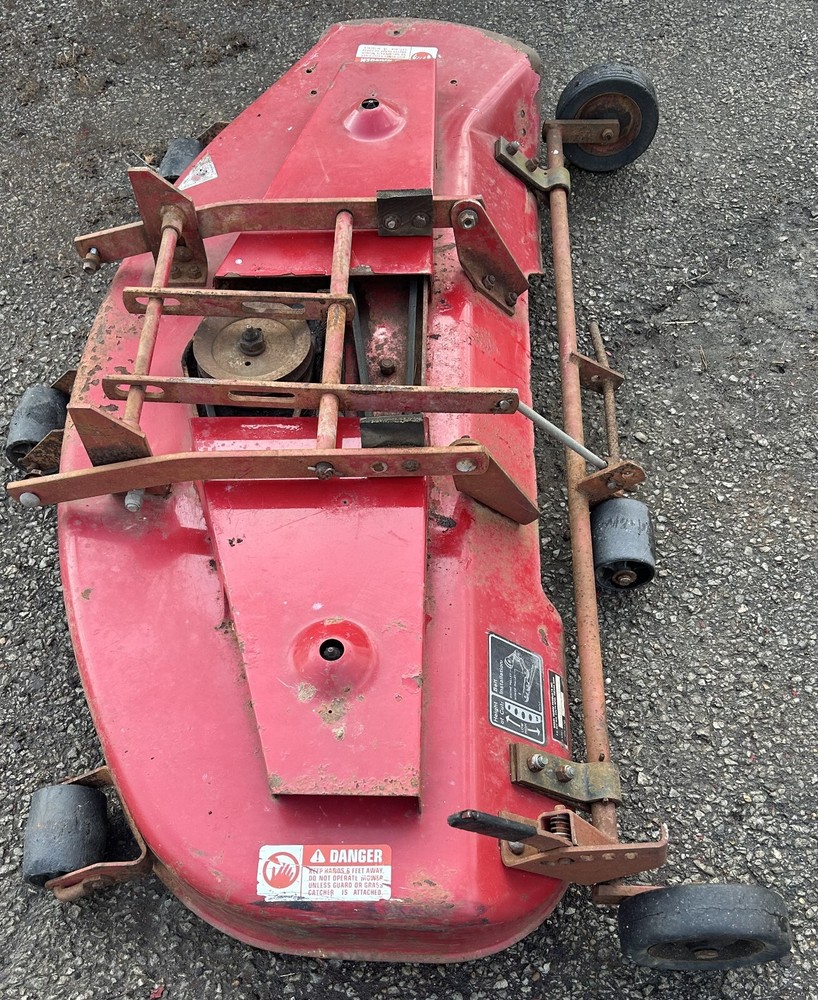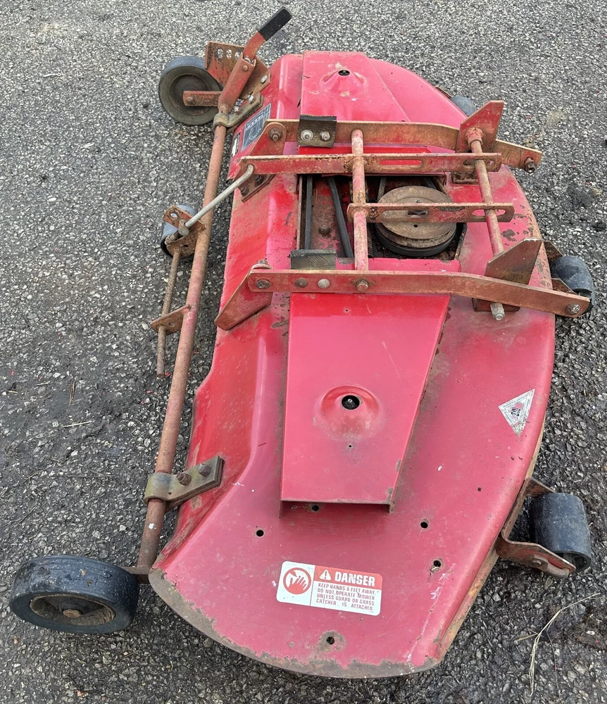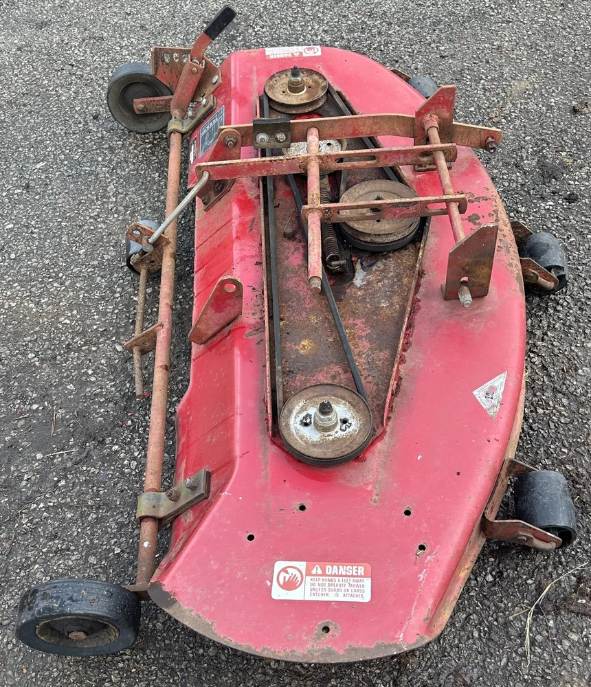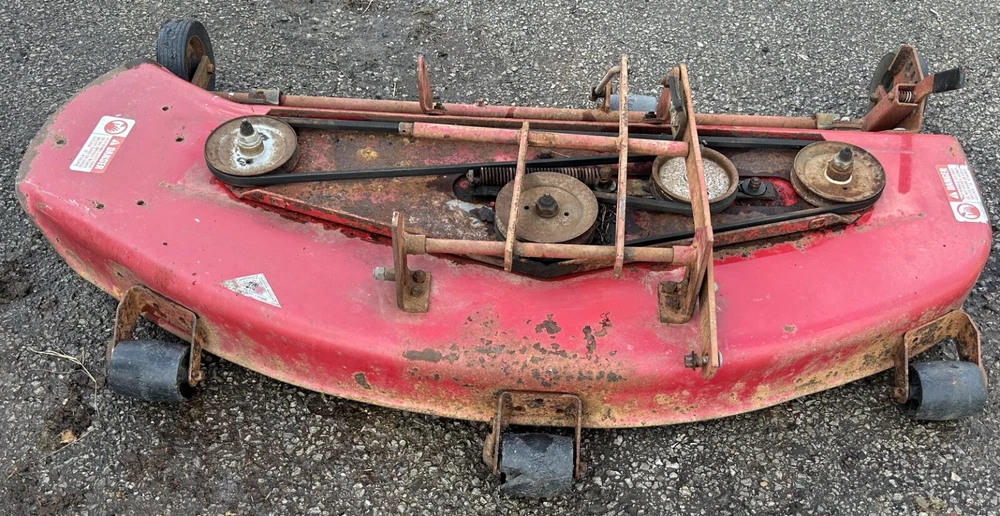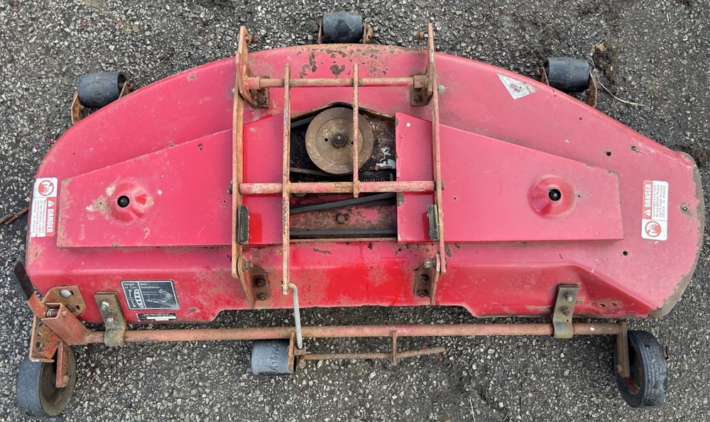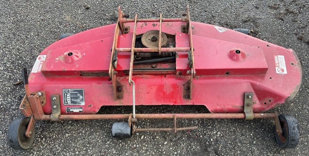 This is a 48" working mower deck model 05-48MS05 from a 1988 Toro Wheel Horse 414-8 model 31-14K803 garden tractor which is being parted out. Blade spindles and pulleys all spin freely. Includes sharpenable blades and belt. This assembly fits other model tractors including all Series 300 and 400 models. Pics are of the actual assembly for sale and show everything included. I've also included a short video of me tugging the included belt and spinning each spindle and pulley. Compare model numbers to ensure fit and compatibility or inquire for fast and friendly assistance. Flat rate UPS Ground shipping of $125 is available to the lower 48 states only. Others please inquire for a shipping quote. We will try our best to get it on the UPS truck within 24 hours of purchase, but allow up to 3-day handling on mowers decks which ship wrapped in stretch wrap, bubble wrap and plastic tape. Rear gage wheel assembly will be removed and boxed and shipped separately. It doesn't always take 3-days to ship, depending on staffing and work flow in the garage. Message me for additional info and deals on multiple parts. I'll make sure you get everything you need. I part out Toro and many other brands of lawn and garden tractors and zero turn mowers. If you don't see a related part you need feel free to message and I'll let you know if I still have it and at what bargain price. If you need only a specific part or parts from any assembly for sale, message me and I will consider pulling that part for you at a reduced price and reduced shipping cost.