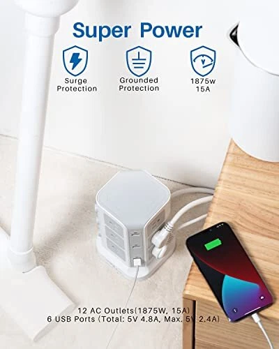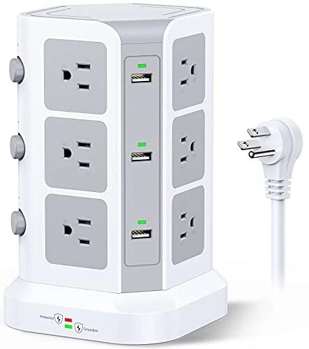 18 IN 1 Power Strip- Integrating 12 Outlets and 6 USBs together : tower power strip, the answer to all your charging needs, is a versatile, sophisticated, and intelligent charging dock. It integrates 12 AC outlets and 6 USB charging ports within one charging station, allowing you to connect and charge up to 18 devices simultaneously, even where space is limited. It is an ideal all-in-one solution. INDIVIDUAL SWITCH DESIGN : The power strip accompanied by USBs and outlets has an individual power control switch on each level, 3 in total, making it easy to turn off multiple electronics at once when not in use. The cable core made of pure copper is sturdy, durable, and safe to use. The 2-Meter long cord can meet most usage scenarios and can accommodate your instant charging needs. SUPERIOR SECURITY : The 1500 J built-in surge protector protects all the attached devices effectively and keeps them safe from voltage spikes, even during thunderstorms. The overload protection button switches off automatically when the total power of the device exceeds 1875W and thus, completely protects you and your electronic devices and appliances. HIGH-QUALITY MATERIALS : Owing to the advanced flame retardancy of the PC material (UL 94V0 standard) and the ABS shell, the Power Strip Tower is fireproof, high-temperature resistant. The premium-grade material employed significantly increases the lifespan of the sockets, ensuring the safety of your gadgets and short circuit protection. REAL SPACE SAVER : Equipped with an assortment of 12 AC sockets and 6 USB ports, this innovative power strip has sockets perpendicularly positioned to the floor, maximizing space compared to the conventional models. The ergonomic spacing and orientation of the sockets will allow better organization of the space as the whole system can be tucked away neatly into tight spaces and corners.