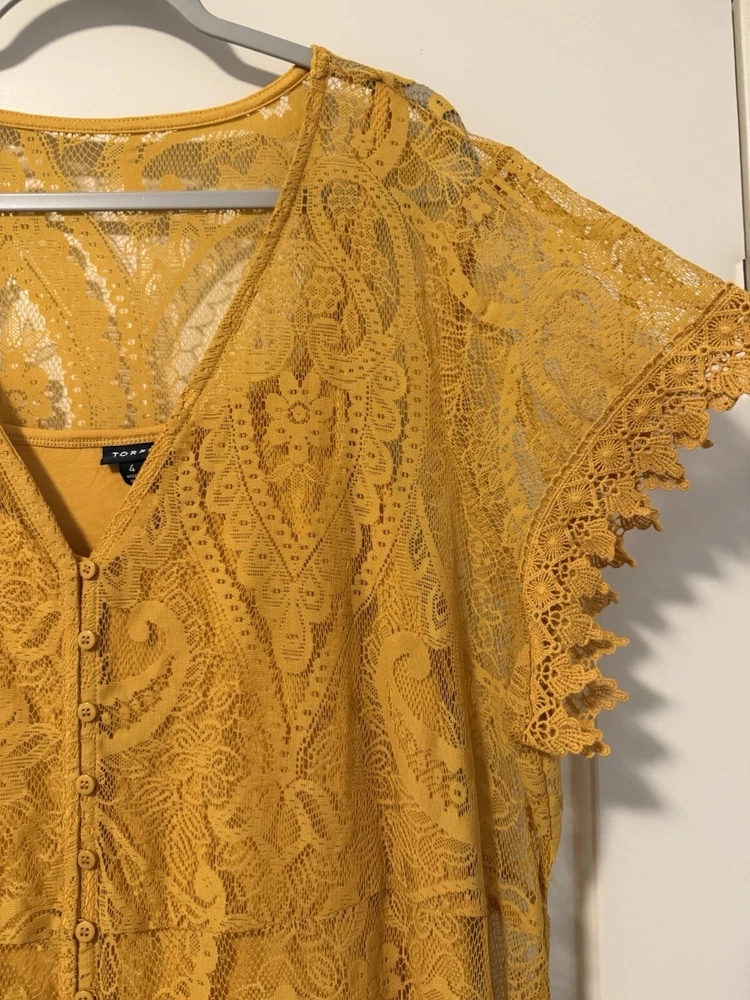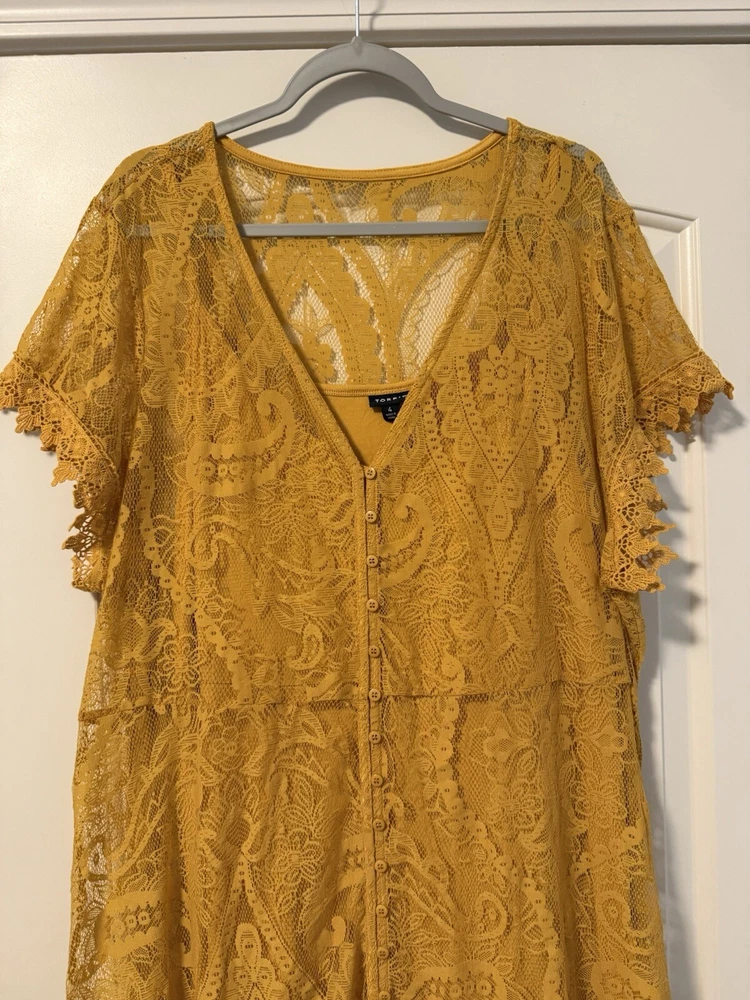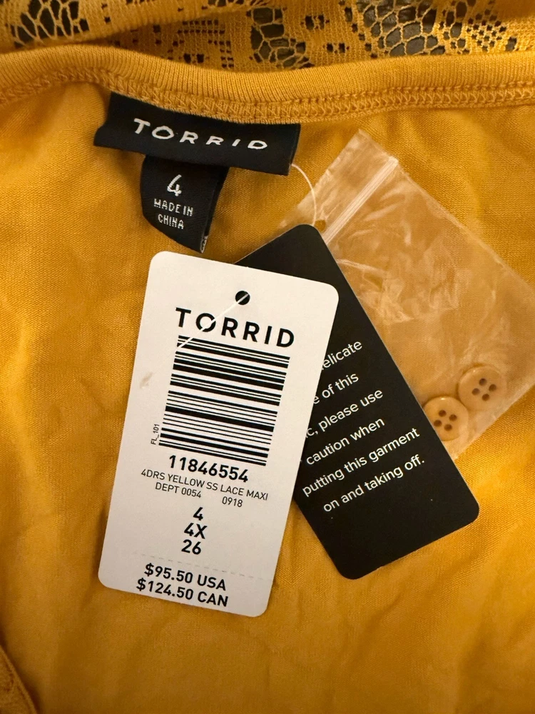 Torrid Maxi Lace Button-Front Mineral Yellow lined Dress size 4. Perfect for a casual picnic or more formal affair, this luxe lace and crochet maxi with a button down closure and embroidered sleeve details is equally as versatile as it is comfortable. Split neck Button closure Stretch waist Slip included Self: nylon/cotton; lining: rayon/spandex