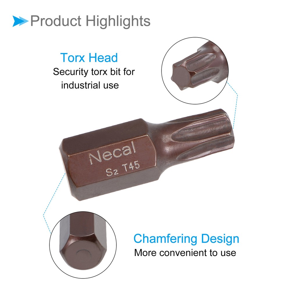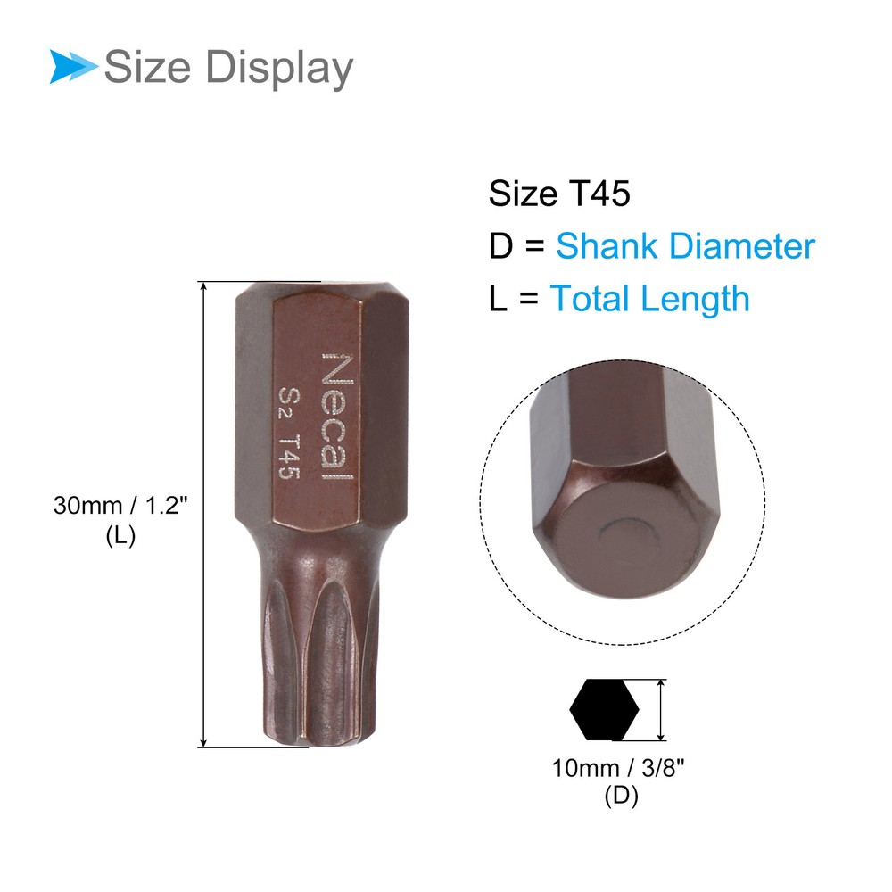 Document Attributes:* Shank Size: 10mm / 3/8"* Total Length: 30mm / 1.2"* Bit Type: T45 * Material: S2 SteelWhat Is Included:* 1 Piece x Torx Screwdriver BitApplications & Features:--- Those bits fit for electric screwdrivers, hand screwdrivers, electric drills, air drills, air batches and 3/8" (10mm) screwdriver sets.--- The torx screwdriver bits are made of S2 steel, which ensures high hardness, durability and wear resistance.--- These screwdriver bits are magnetic, which can firmly absorb the screw to prevent it from falling off.--- The star head bits are easy to install on the screwdriver handle with double ear on the sides of the bit shank.Useful Tips:--- Please apply appropriate force. Excessive force may cause the bit to slip, while insufficient force may not effectively tighten or remove the screw. Torx Screwdriver Bits 3/8" Hex Shank 30mm Long T45 Magnetic Screw Driver Bit Attributes: * Shank Size: 10mm / 3/8" * Total Length: 30mm / 1.2" * Bit Type: T45 * Material: S2 Steel What Is Included: * 1 Piece x Torx Screwdriver Bit Applications & Features: --- Those bits fit for electric screwdrivers, hand screwdrivers, electric drills, air drills, air batches and 3/8" (10mm) screwdriver sets. --- The torx screwdriver bits are made of S2 steel, which ensures high hardness, durability and wear resistance. --- These screwdriver bits are magnetic, which can firmly absorb the screw to prevent it from falling off. --- The star head bits are easy to install on the screwdriver handle with double ear on the sides of the bit shank. Useful Tips: --- Please apply appropriate force. Excessive force may cause the bit to slip, while insufficient force may not effectively tighten or remove the screw. Hot Item Payment 1.We accept eBay payment . 2.Payment must be received within 7 business days of auction closing. Shipping 1.We ship to your eBay or Paypal address. Please make sure your eBay and Paypal address is correct before you pay. 2.Items will be shipped within 1-3 business day when we received payment. 3.Delivery time depends on destination and other factors. Description Policy Torx Screwdriver Bits 3/8" Hex Shank 30mm Long T45 Magnetic Screw Driver Bit Attributes: * Shank Size: 10mm / 3/8" * Total Length: 30mm / 1.2" * Bit Type: T45 * Material: S2 Steel What Is Included: * 1 Piece x Torx Screwdriver Bit Applications & Features: --- Those bits fit for electric screwdrivers, hand screwdrivers, electric drills, air drills, air batches and 3/8" (10mm) screwdriver sets. --- The torx screwdriver bits are made of S2 steel, which ensures high hardness, durability and wear resistance. --- These screwdriver bits are magnetic, which can firmly absorb the screw to prevent it from falling off. --- The star head bits are easy to install on the screwdriver handle with double ear on the sides of the bit shank. Useful Tips: --- Please apply appropriate force. Excessive force may cause the bit to slip, while insufficient force may not effectively tighten or remove the screw. Hot Item Payment 1.We accept eBay payment . 2.Payment must be received within 7 business days of auction closing. Shipping 1.We ship to your eBay or Paypal address. Please make sure your eBay and Paypal address is correct before you pay. 2.Items will be shipped within 1-3 business day when we received payment. 3.Delivery time depends on destination and other factors.