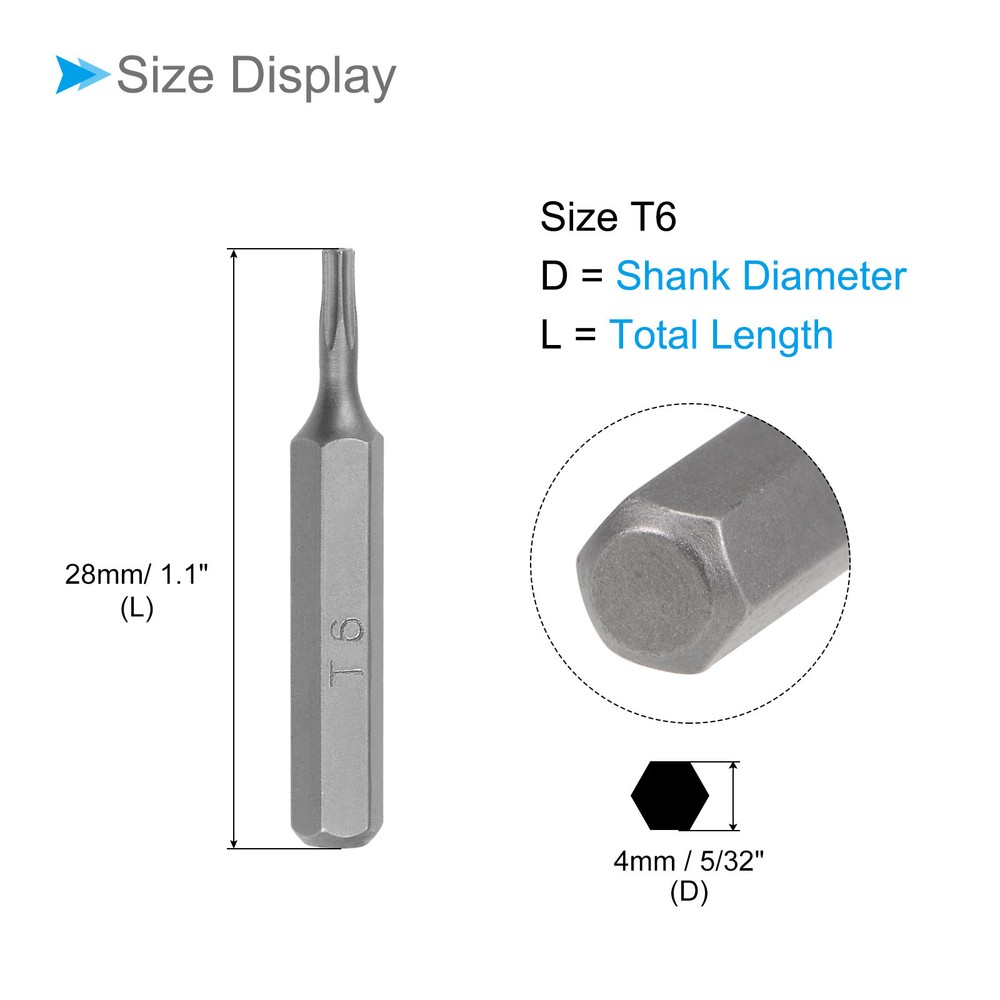 Document Attributes:* Shank Size: 4mm / 5/32"* Total Length: 28mm/ 1.1"* Bit Type: T6 * Material: S2 SteelWhat Is Included:* 1 Piece x Torx Screwdriver BitApplications & Features:--- Those bits fit for electric screwdrivers, hand screwdrivers, electric drills, air drills, air batches and 5/32" (4mm) screwdriver sets.--- The torx screwdriver bits are made of S2 steel, which ensures high hardness, durability and wear resistance.--- These screwdriver bits are magnetic, which can firmly absorb the screw to prevent it from falling off.--- The star head bits are easy to install on the screwdriver handle with double ear on the sides of the bit shank.Useful Tips:--- Please apply appropriate force. Excessive force may cause the bit to slip, while insufficient force may not effectively tighten or remove the screw. Torx Screwdriver Bits 5/32" Hex Shank 28mm Long T6 Magnetic Screw Driver Bit Attributes: * Shank Size: 4mm / 5/32" * Total Length: 28mm/ 1.1" * Bit Type: T6 * Material: S2 Steel What Is Included: * 1 Piece x Torx Screwdriver Bit Applications & Features: --- Those bits fit for electric screwdrivers, hand screwdrivers, electric drills, air drills, air batches and 5/32" (4mm) screwdriver sets . --- The torx screwdriver bits are made of S2 steel, which ensures high hardness, durability and wear resistance. --- These screwdriver bits are magnetic, which can firmly absorb the screw to prevent it from falling off. --- The star head bits are easy to install on the screwdriver handle with double ear on the sides of the bit shank. Useful Tips: --- Please apply appropriate force. Excessive force may cause the bit to slip, while insufficient force may not effectively tighten or remove the screw. Hot Item Payment 1.We accept eBay payment . 2.Payment must be received within 7 business days of auction closing. Shipping 1.We ship to your eBay or Paypal address. Please make sure your eBay and Paypal address is correct before you pay. 2.Items will be shipped within 1-3 business day when we received payment. 3.Delivery time depends on destination and other factors. Description Policy Torx Screwdriver Bits 5/32" Hex Shank 28mm Long T6 Magnetic Screw Driver Bit Attributes: * Shank Size: 4mm / 5/32" * Total Length: 28mm/ 1.1" * Bit Type: T6 * Material: S2 Steel What Is Included: * 1 Piece x Torx Screwdriver Bit Applications & Features: --- Those bits fit for electric screwdrivers, hand screwdrivers, electric drills, air drills, air batches and 5/32" (4mm) screwdriver sets . --- The torx screwdriver bits are made of S2 steel, which ensures high hardness, durability and wear resistance. --- These screwdriver bits are magnetic, which can firmly absorb the screw to prevent it from falling off. --- The star head bits are easy to install on the screwdriver handle with double ear on the sides of the bit shank. Useful Tips: --- Please apply appropriate force. Excessive force may cause the bit to slip, while insufficient force may not effectively tighten or remove the screw. Hot Item Payment 1.We accept eBay payment . 2.Payment must be received within 7 business days of auction closing. Shipping 1.We ship to your eBay or Paypal address. Please make sure your eBay and Paypal address is correct before you pay. 2.Items will be shipped within 1-3 business day when we received payment. 3.Delivery time depends on destination and other factors.