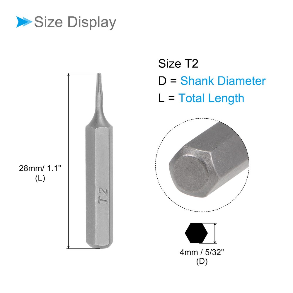 Document Attributes:* Shank Size: 4mm / 5/32"* Total Length: 28mm/ 1.1"* Bit Type: T2* Material: S2 SteelWhat Is Included:* 1 Piece x Torx Screwdriver BitApplications & Features:--- Those bits fit for electric screwdrivers, hand screwdrivers, electric drills, air drills, air batches and 5/32" (4mm) screwdriver sets.--- The torx screwdriver bits are made of S2 steel, which ensures high hardness, durability and wear resistance.--- These screwdriver bits are magnetic, which can firmly absorb the screw to prevent it from falling off.--- The star head bits are easy to install on the screwdriver handle with double ear on the sides of the bit shank.Useful Tips:--- Please apply appropriate force. Excessive force may cause the bit to slip, while insufficient force may not effectively tighten or remove the screw. Torx Screwdriver Bits 5/32" Hex Shank 28mm Long T2 Magnetic Screw Driver Bit Attributes: * Shank Size: 4mm / 5/32" * Total Length: 28mm/ 1.1" * Bit Type: T2 * Material: S2 Steel What Is Included: * 1 Piece x Torx Screwdriver Bit Applications & Features: --- Those bits fit for electric screwdrivers, hand screwdrivers, electric drills, air drills, air batches and 5/32" (4mm) screwdriver sets . --- The torx screwdriver bits are made of S2 steel, which ensures high hardness, durability and wear resistance. --- These screwdriver bits are magnetic, which can firmly absorb the screw to prevent it from falling off. --- The star head bits are easy to install on the screwdriver handle with double ear on the sides of the bit shank. Useful Tips: --- Please apply appropriate force. Excessive force may cause the bit to slip, while insufficient force may not effectively tighten or remove the screw. Hot Item Payment 1.We accept eBay payment . 2.Payment must be received within 7 business days of auction closing. Shipping 1.We ship to your eBay or Paypal address. Please make sure your eBay and Paypal address is correct before you pay. 2.Items will be shipped within 1-3 business day when we received payment. 3.Delivery time depends on destination and other factors. Description Policy Torx Screwdriver Bits 5/32" Hex Shank 28mm Long T2 Magnetic Screw Driver Bit Attributes: * Shank Size: 4mm / 5/32" * Total Length: 28mm/ 1.1" * Bit Type: T2 * Material: S2 Steel What Is Included: * 1 Piece x Torx Screwdriver Bit Applications & Features: --- Those bits fit for electric screwdrivers, hand screwdrivers, electric drills, air drills, air batches and 5/32" (4mm) screwdriver sets . --- The torx screwdriver bits are made of S2 steel, which ensures high hardness, durability and wear resistance. --- These screwdriver bits are magnetic, which can firmly absorb the screw to prevent it from falling off. --- The star head bits are easy to install on the screwdriver handle with double ear on the sides of the bit shank. Useful Tips: --- Please apply appropriate force. Excessive force may cause the bit to slip, while insufficient force may not effectively tighten or remove the screw. Hot Item Payment 1.We accept eBay payment . 2.Payment must be received within 7 business days of auction closing. Shipping 1.We ship to your eBay or Paypal address. Please make sure your eBay and Paypal address is correct before you pay. 2.Items will be shipped within 1-3 business day when we received payment. 3.Delivery time depends on destination and other factors.