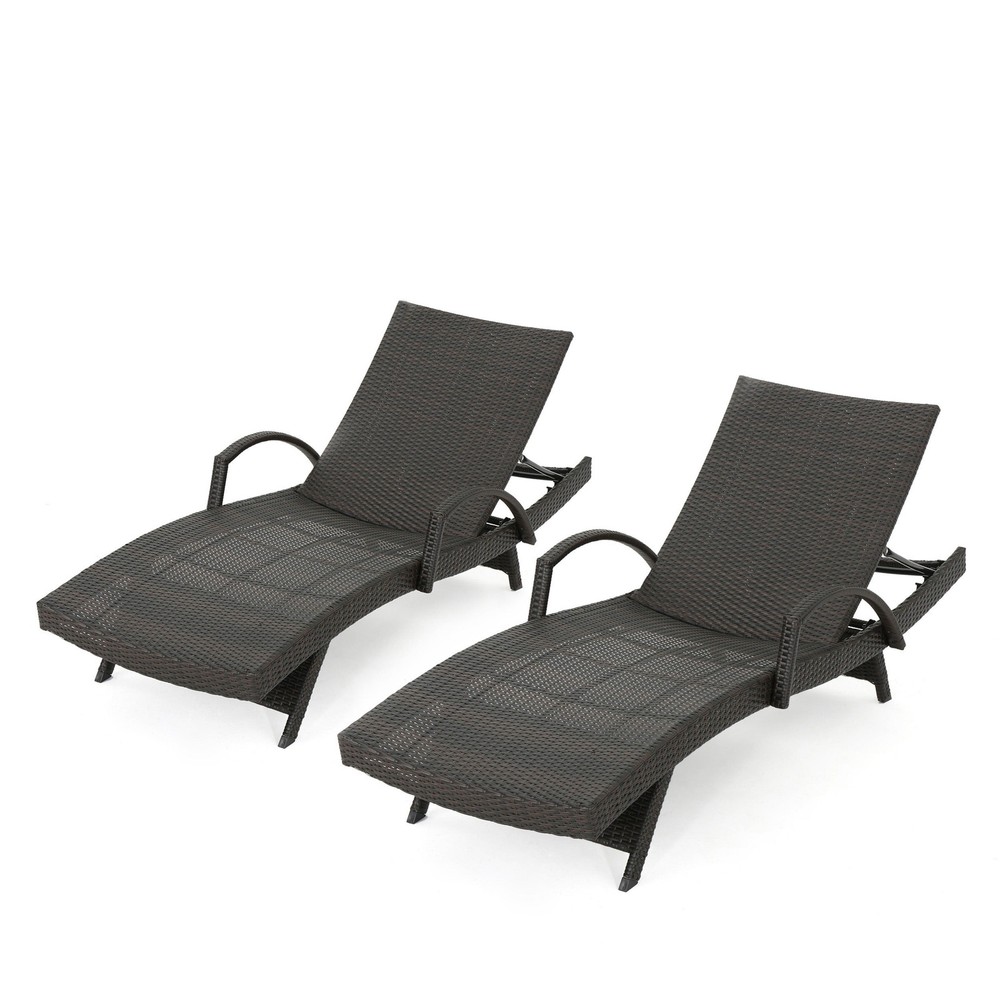 Enhance the comfort and appeal of your outdoor space with these functional and elegant lounge chairs from Christopher Knight Home. Adjust the back of these lounge chairs to the preferred reclining position for optimal comfort and convenience. Includes: Two (2) lounges Materials: PE wicker, powder coated ironColor options: Multi-brownFeatures: Adjustable back and support arms provide comfortAssembly required: YesWeight: 40-poundsDimensions: 13.75 inches high x 27.50 inches wide x 79.50 inches deepProduct Features: Water ResistantMaterial: Iron, WickerStyle: Contemporary, Modern, TraditionalAssembly: Assembly RequiredExact Color: BrownColor: Brown Assembly Required Free Shipping Over $49.99* Details Toscana Wicker Outdoor Chaise Lounge Chair (Set of 2) by Grey Product Description: Enhance the comfort and appeal of your outdoor space with these functional and elegant lounge chairs from Christopher Knight Home. Adjust the back of these lounge chairs to the preferred reclining position for optimal comfort and convenience. IncludesTwo (2) lounges MaterialsPE wicker, powder coated iron Color optionsMulti-brown FeaturesAdjustable back and support arms provide comfort Assembly requiredYes Weight40-pounds Dimensions13.75 inches high x 27.50 inches wide x 79.50 inches deep Product FeaturesWater Resistant MaterialIron, Wicker StyleContemporary, Modern, Traditional AssemblyAssembly Required Exact ColorBrown ColorBrown Assembly Required
