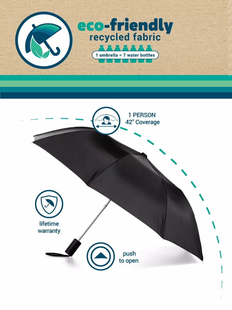 Constructed with a 100% recycled canopy. Each umbrella removes 7 water bottles from our eco system! In a year's time, totes will recycle 45 million water bottles!; Bright canopies for a burst of color Opens automatically with the touch of a button; Ergonomic black rubber handle for premium style and grip Canopy Size: 42 inches Folded Length: 15 inches, conveniently compact Backed by totes' lifetime warranty if yours breaks, simply return it to our warranty center