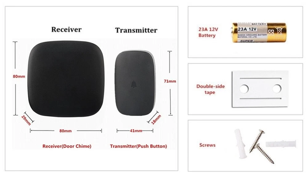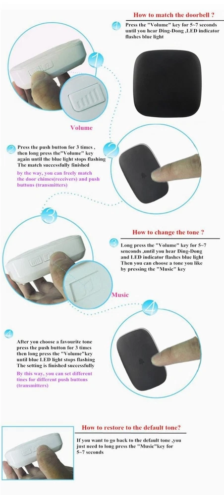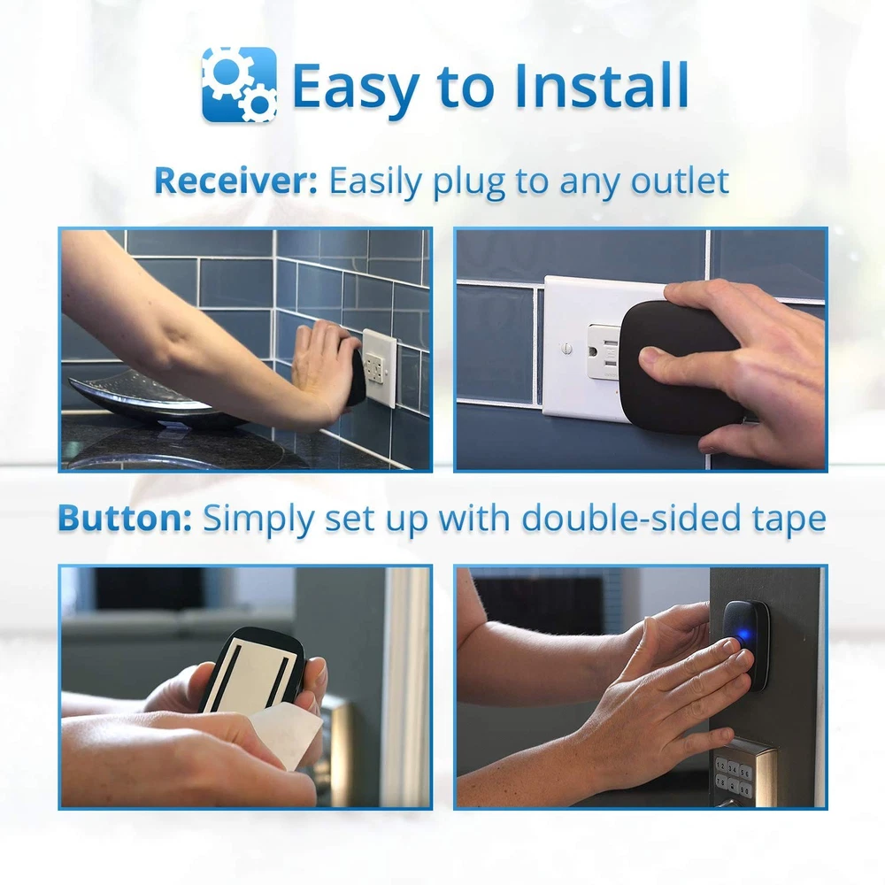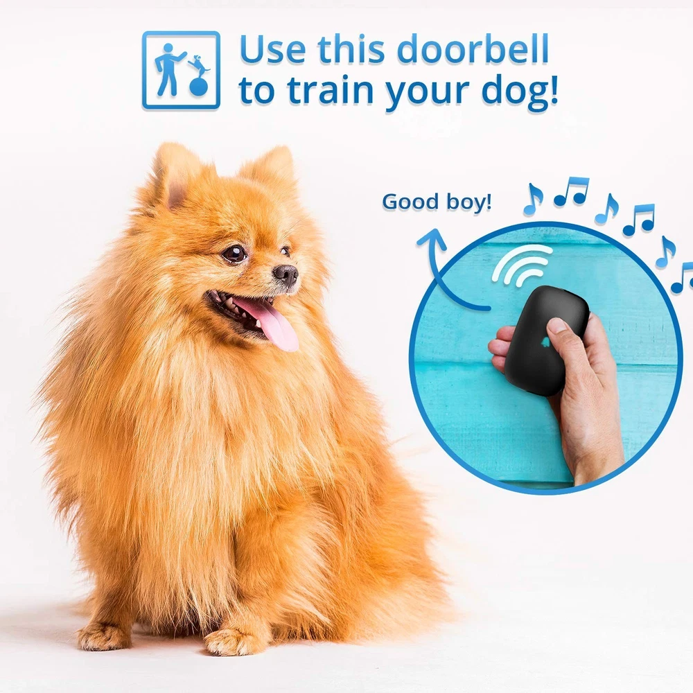 TOUCH ACTIVATED DOG BELL - Unique touch activated dog bells for potty training. Blue LED lights up when touching the touch area of transmitter button. The button is also 100% waterproof, and can be used indoors and outdoors. LONG RANGE AND CUSTOMIZABLE - This wireless doorbell has over 50+ different ring and chimes. Operating range of over 500 feet when indoors (1000 feet in open area). Four levels of adjustable volume from 25Db to 110Db. EASY TO INSTALL - Easily plug receiver into an electrical outlet (no batteries required for main receiver). Use the double sided sticker to stick the transmitter on the door or wall or place anywhere you need. CE, FCC, RoHS certified. GREAT TRAINING DEVICE - This dog potty training door bell works like a charm. Using their noses or paws, dogs only need to touch the door bell gently for it to sound. Teach your dog how to use the dog bell to signal when they need to go outside, potty or bathroom.