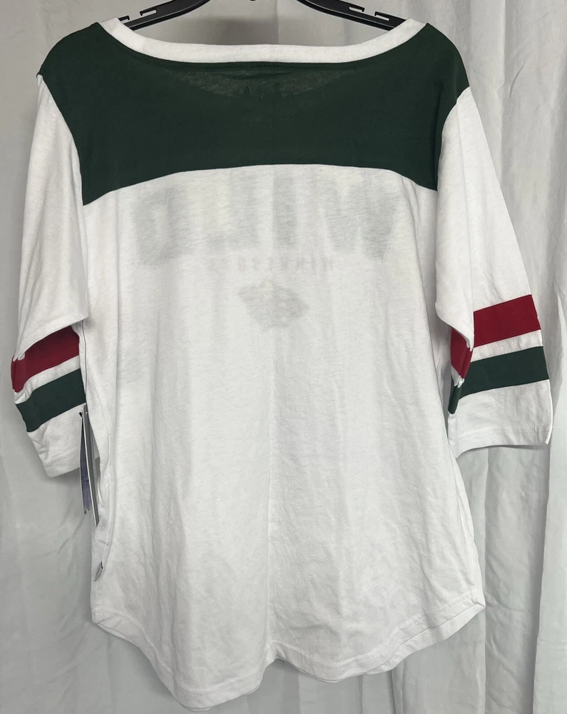 Support your favorite NHL team with this stylish Touch Alyssa Milano 3/4 Sleeve Hockey T-Shirt. This shirt features the Minnesota Wild team colors and logo on the front, making it a perfect addition to your fan apparel collection. The shirt is designed for women and comes in size L, making it comfortable to wear during game nights or any other occasion. The shirt is brand new with tags, making it a perfect gift for any Minnesota Wild fan. The shirt is made of high-quality materials that are sure to last for a long time. Add this shirt to your collection today and show off your love for your favorite NHL team. SKU: P 15