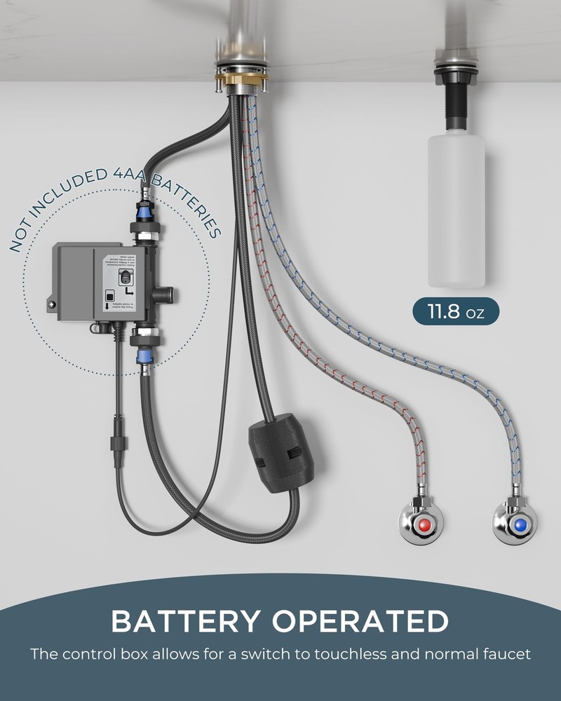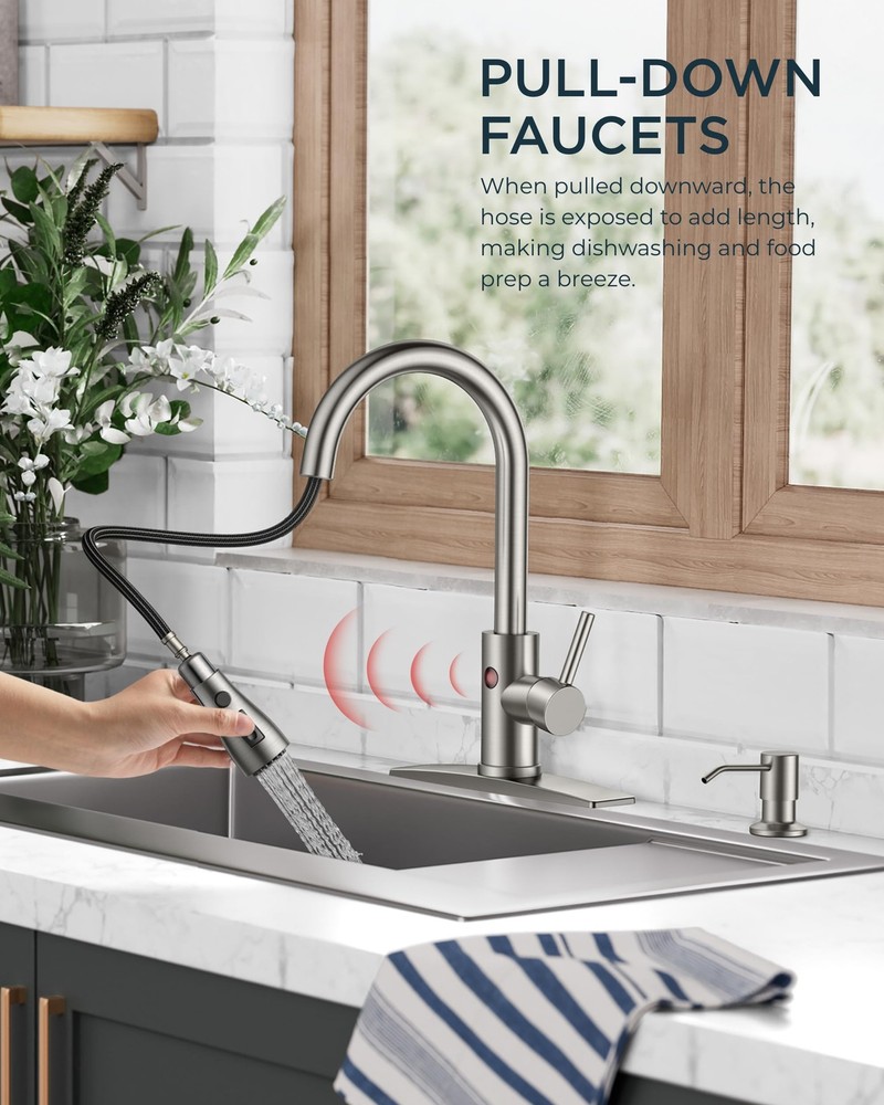 First, how does a touchless faucet work? Imagine walking up to your sink, waving your hand, and presto — water flows without a touch. That’s the promise of touchless kitchen faucets. Key Features of the kitchen faucets? 1. Touchless Operation - There is a sensor at the bottom of the faucet so you just need to put your fingers or wave nearby to inform that you want some water. 2. Three Spray Modes - The kitchen faucet with pull down spray supports three modes for multitasking in your kitchen, stream-flow, spray-flow and paused modes. 3. High-Arc Spout: the spout is high, 360-degree rotated and 18 inch retractable hose so you can move your hand freely around the dishwasher with no fear of turning on the faucet accidentally. 4. Timeout Protection: Once the motion sensor detects no object, the water will shut off automatically after 3 minutes (According to Default Setting) to avoid wasting water. 5. Leak-proof: the handle has a high-quality ceramic cartridge that can be turned on and off continuously for 500,000 times. Wave for water! - Simply wave your hand near the sensor. touchless kitchen faucets bring in the ultimate hands-free operation, which makes cooking and cleaning a breeze. Saving Water - water stops automatically after 3mins continuous flow. What Will You Get? - The kitchen faucet set includes a 14.76 inch faucet and an 11.83 oz (350 ml) soap dispenser. The versatile dispenser is ideal for hand soap, dish soap, lotion and more. This set is designed to meet your kitchen needs perfectly Multi-Functional Kitchen Faucet: The high arc kitchen faucet with pull-down sprayer has 3 spray modes - Stream, Spray and Pause modes —for versatile use. It includes a 360° rotating head and an 18-inch retractable hose for complete sink coverage Lead-free Material: Our bar kitchen faucet is made from premium SUS 304 stainless steel for longevity use, and features a ceramic cartridge tested over 500,000 times for leak-proof performance. Flow Rate: 1.8 Gallons Per Minute, saving 20% water DIY Friendly Installation: Install our bar sink faucet effortlessly in under 15 minutes without professional assistance, it includes a 10-inch detachable deck plate for one or three holes kitchen sinks, and all Mounting hardware for a hassle-free setup Stylish Design -- This USA/CAN standard faucet for kitchen sink, laundry utility rooms, RVs, and bars. Its minimalist design blends seamlessly with most kitchen sinks while adding a fresh, modern touch