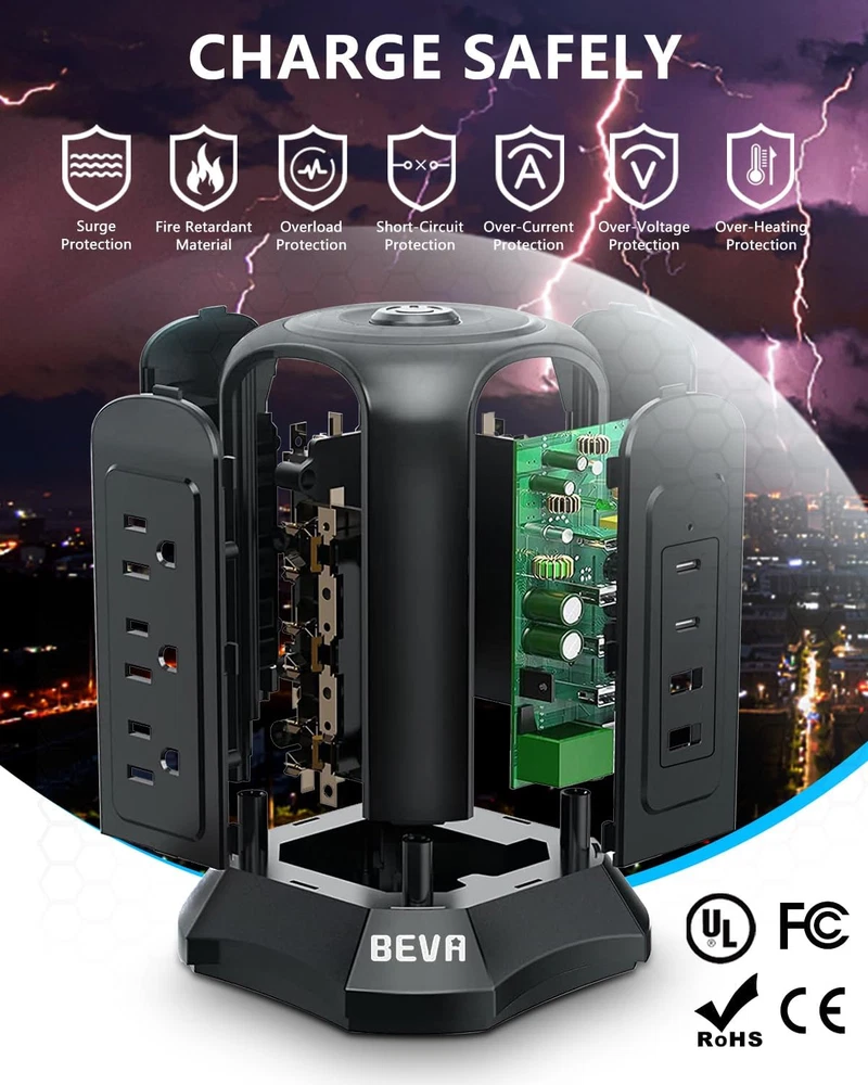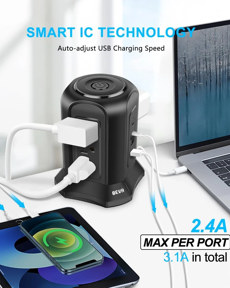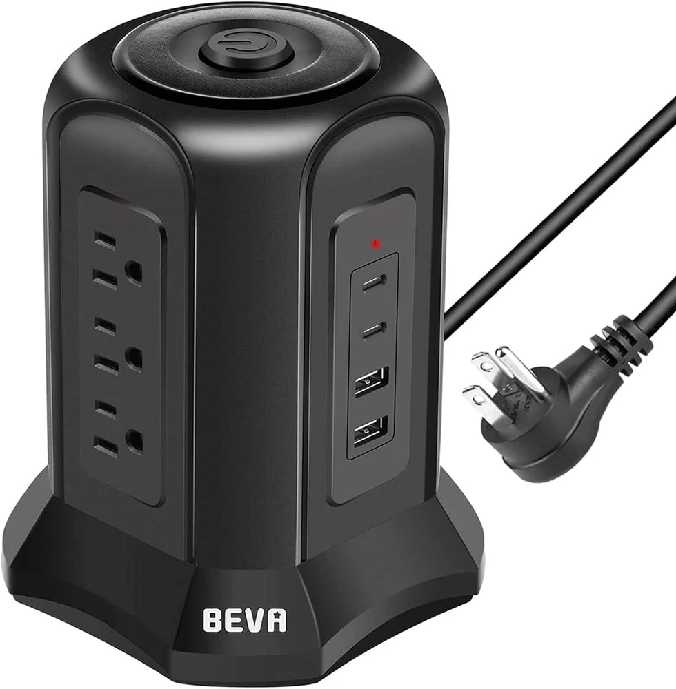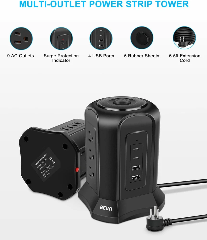 【13 IN 1 Tower Power Strip with USB】With 9 AC outlets(1250W, 10A) and 4 smart USB ports(5V/3.1A), the surge protector power strip with USB supports wide voltage 110V-250V and can charge up to 13 electronic devices at the same time. Greatly satisfy your electrical needs. 【Space-Saving Tower Design】Short on space? Then why not opt for this vertically extended power tower strip? Unique 4 sides of outlets provide enough space for each outlet and USB port, saving more space and tidying up various cords in your home and work area compared to traditional power strips. 【Non-Slip Base and 45° Flat Plug】The charging tower has 5 rubber feet to prevent it from slipping and sliding, increasing its stability on the countertop. And this multi-outlet extension cord also has a 45° flat plug, which easily fits into hard-to-reach places behind your bed or sofa. Widely used for bedside table, camper, sewing room, garage, kitchen or other places. 【Smart USB Fast Charging & Master Switch】USB charging output is 5V/3.1A, which could provide 4 ports running at the same time, and fast charging USB port with smart IC technology, it can auto-detect your connected devices and can achieve faster charging efficiency, which would charge your phone or pad WITHOUT a variety of converters. A master switch on the top of the surge protector tower, easier for you to manage all connected devices, no more plugging & unplugging hassle! 【Power Your Safety】To protect your valuable electronic devices, the plug has passed the FCC, RoHS, CE certification. And has surge protection(900J), overload protection, short circuit protection, lightning protection, plus an ABS + PC fireproof casing, which can withstand temperature up to 1382℉(750℃). Give your devices a safe & reliable power source. Product Description About BEVA: BEVA is a professional power strips manufacturer that has been established for more than 10 years. Our products have a wide range of applications, good quality, reasonable prices and stylish designs, and are widely used in home, offices, hotels and other industries. They have been widely recognized and trusted by many users. Surge Protection Short Circuit Protection Over-load Protection Over-current Protection Lightning Protection Fire-resistant Materials BEVA DESKTOP POWER STRIP TOWER WITH 9 OUTLETS 4 USB PORTS Tower-shaped design makes it more space-saving than normal flat power strip. Specifications: Product Dimension: 6.5 x 5.5 x 5.5 inch Charging ports: 9 AC outlets & 4 USB Rated Voltage: 110V~250V, 50/60 Hz Rated Power: 1250W, 10A Surge Protector Rating: 900 Joules USB output:5V/3.1A(Total) 2.1A(Max/per port) Cable Length: 6.5 Feet Switch: 1 pcs ON/OFF switch PRODUCT DETAILS ABS + PC Fireproof Materials The shell of this power strip is made of ABS + PC flame retardant materials, which has good toughness, crack resistance and great durability. Protective Power Cord Comparing with normal power cord, our upgraded protective power cable can greatly avoid being broken after long time usage. Makes the outlet power strip safer and durable. 6.5ft Heavy Duty Power Cord The inner 100% pure copper heavy duty cord ensures great heat dissipation, high conductivity and efficiency. Exterior ABS + PC fireproof shell can withstand pressure and makes sure longevity and durability. PRODUCT DETAILS Safe Choice for Your Electronics Built-in overload protection, short circuit protection, overload protection, overcurrent protection and surge protection. Not only protect the safety of the appliances on the power strip, but also the safety of the user. 5 Anti-slid Rubber Sheets There are 5 skidproof footpads on the bottom to ensure the stability of the vertical power outlets, ensuring that it won't be so easy to be knocked down during use. 45-Degree Right Angle Flat Plug The tower power strip features a 6.5ft low profile 45-degree low profile right angled flat plug extension cord, with which you can make it get easy access to anywhere you want and fit well in narrow zone, such as behind sofa, behind bookcase or nightstand. And do not need to worry about whether the surge protector will block the bottom outlet of the wall plug.