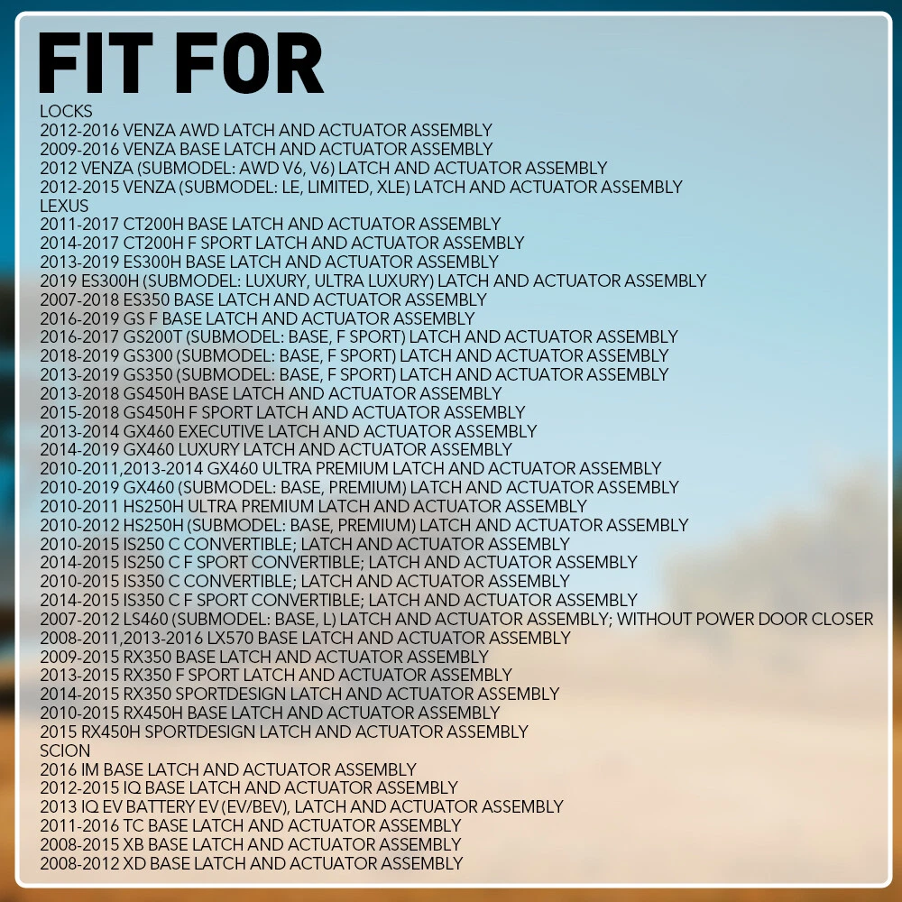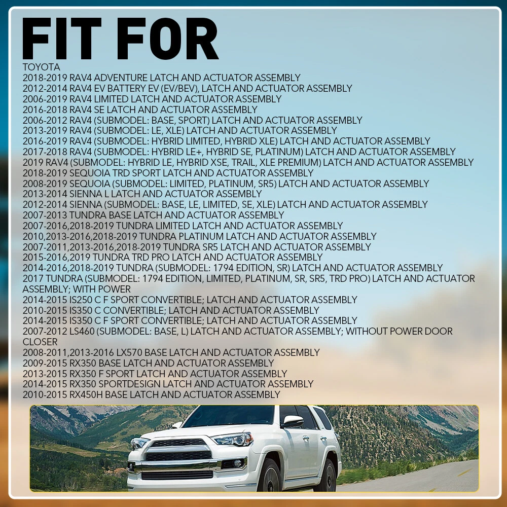 Fits for: Toyota 2017-2018 4Runner Base Latch And Actuator Assembly 2010-2016 4Runner Trail Latch And Actuator Assembly 2017-2019 4Runner TRD Off-Road Latch And Actuator Assembly 2015-2019 4Runner TRD Pro Latch And Actuator Assembly 2010-2019 4Runner (submodel: Limited, SR5) Latch And Actuator Assembly 2018-2019 4Runner (submodel: SR5 Premium, TRD Off-Road Premium) Latch And Actuator Assembly 2009-2011 Camry Base Latch And Actuator Assembly 2007-2008 Camry CE Latch And Actuator Assembly 2007-2011 Camry Hybrid Latch And Actuator Assembly 2014-2017 Camry Hybrid SE Latch And Actuator Assembly 2012-2014 Camry L Latch And Actuator Assembly Front Driver Side Door Actuator Lock For Toyota 4Runner RAV4 Tundra 69040-0C050 Fits for: Toyota 2017-2018 4Runner Base Latch And Actuator Assembly 2010-2016 4Runner Trail Latch And Actuator Assembly 2017-2019 4Runner TRD Off-Road Latch And Actuator Assembly 2015-2019 4Runner TRD Pro Latch And Actuator Assembly 2010-2019 4Runner (submodel: Limited, SR5) Latch And Actuator Assembly 2018-2019 4Runner (submodel: SR5 Premium, TRD Off-Road Premium) Latch And Actuator Assembly 2009-2011 Camry Base Latch And Actuator Assembly 2007-2008 Camry CE Latch And Actuator Assembly 2007-2011 Camry Hybrid Latch And Actuator Assembly 2014-2017 Camry Hybrid SE Latch And Actuator Assembly 2012-2014 Camry L Latch And Actuator Assembly 2014 Camry SE Sport Latch And Actuator Assembly 2016 Camry Special Edition Latch And Actuator Assembly 2015-2017 Camry XSE Latch And Actuator Assembly 2007-2017 Camry (submodel: LE, SE, XLE) Latch And Actuator Assembly 2012-2017 Camry (submodel: Hybrid LE, Hybrid XLE) Latch And Actuator Assembly 2009-2011 Corolla Base Latch And Actuator Assembly 2012-2013 Corolla L Latch And Actuator Assembly 2009-2010 Corolla XLE Latch And Actuator Assembly 2009-2012 Corolla XRS Latch And Actuator Assembly 2009-2013 Corolla (submodel: CE, LE, S) Latch And Actuator Assembly 2017-2018 Corolla iM Base Latch And Actuator Assembly 2013 Highlander Plus Latch And Actuator Assembly 2010-2013 Highlander SE Latch And Actuator Assembly 2008-2010 Highlander Sport Latch And Actuator Assembly 2008-2013 Highlander (submodel: Base, Hybrid, Hybrid Limited, Limited) Latch And Actuator Assembly 2008-2011,2013-2019 Land Cruiser Base Latch And Actuator Assembly 2011-2013 Matrix AWD Latch And Actuator Assembly 2009-2014 Matrix Base Latch And Actuator Assembly 2009-2010 Matrix XR Latch And Actuator Assembly 2009-2013 Matrix (submodel: S, XRS) Latch And Actuator Assembly 2012 Prius C (submodel: Base, Four, One, Three, Two) Latch And Actuator Assembly 2012-2014 Prius V (submodel: Base, Five, Three, Two) Latch And Actuator Assembly 2018-2019 RAV4 Adventure Latch And Actuator Assembly 2012-2014 RAV4 EV BATTERY EV (EV/BEV), Latch And Actuator Assembly 2006-2019 RAV4 Limited Latch And Actuator Assembly 2016-2018 RAV4 SE Latch And Actuator Assembly 2006-2012 RAV4 (submodel: Base, Sport) Latch And Actuator Assembly 2013-2019 RAV4 (submodel: LE, XLE) Latch And Actuator Assembly 2016-2019 RAV4 (submodel: Hybrid Limited, Hybrid XLE) Latch And Actuator Assembly 2017-2018 RAV4 (submodel: Hybrid LE+, Hybrid SE, Platinum) Latch And Actuator Assembly 2019 RAV4 (submodel: Hybrid LE, Hybrid XSE, Trail, XLE Premium) Latch And Actuator Assembly 2018-2019 Sequoia TRD Sport Latch And Actuator Assembly 2008-2019 Sequoia (submodel: Limited, Platinum, SR5) Latch And Actuator Assembly 2013-2014 Sienna L Latch And Actuator Assembly 2012-2014 Sienna (submodel: Base, LE, Limited, SE, XLE) Latch And Actuator Assembly 2007-2013 Tundra Base Latch And Actuator Assembly 2007-2016,2018-2019 Tundra Limited Latch And Actuator Assembly 2010,2013-2016,2018-2019 Tundra Platinum Latch And Actuator Assembly 2007-2011,2013-2016,2018-2019 Tundra SR5 Latch And Actuator Assembly 2015-2016,2019 Tundra TRD Pro Latch And Actuator Assembly 2014-2016,2018-2019 Tundra (submodel: 1794 Edition, SR) Latch And Actuator Assembly 2017 Tundra (submodel: 1794 Edition, Limited, Platinum, SR, SR5, TRD Pro) Latch And Actuator Assembly; With Power Locks 2012-2016 Venza AWD Latch And Actuator Assembly 2009-2016 Venza Base Latch And Actuator Assembly 2012 Venza (submodel: AWD V6, V6) Latch And Actuator Assembly 2012-2015 Venza (submodel: LE, Limited, XLE) Latch And Actuator Assembly Lexus 2011-2017 CT200h Base Latch And Actuator Assembly 2014-2017 CT200h F Sport Latch And Actuator Assembly 2013-2019 ES300h Base Latch And Actuator Assembly 2019 ES300h (submodel: Luxury, Ultra Luxury) Latch And Actuator Assembly 2007-2018 ES350 Base Latch And Actuator Assembly 2016-2019 GS F Base Latch And Actuator Assembly 2016-2017 GS200t (submodel: Base, F Sport) Latch And Actuator Assembly 2018-2019 GS300 (submodel: Base, F Sport) Latch And Actuator Assembly 2013-2019 GS350 (submodel: Base, F Sport) Latch And Actuator Assembly 2013-2018 GS450h Base Latch And Actuator Assembly 2015-2018 GS450h F Sport Latch And Actuator Assembly 2013-2014 GX460 Executive Latch And Actuator Assembly 2014-2019 GX460 Luxury Latch And Actuator Assembly 2010-2011,2013-2014 GX460 Ultra Premium Latch And Actuator Assembly 2010-2019 GX460 (submodel: Base, Premium) Latch And Actuator Assembly 2010-2011 HS250h Ultra Premium Latch And Actuator Assembly 2010-2012 HS250h (submodel: Base, Premium) Latch And Actuator Assembly 2010-2015 IS250 C Convertible; Latch And Actuator Assembly 2014-2015 IS250 C F Sport Convertible; Latch And Actuator Assembly 2010-2015 IS350 C Convertible; Latch And Actuator Assembly 2014-2015 IS350 C F Sport Convertible; Latch And Actuator Assembly 2007-2012 LS460 (submodel: Base, L) Latch And Actuator Assembly; Without Power Door Closer 2008-2011,2013-2016 LX570 Base Latch And Actuator Assembly 2009-2015 RX350 Base Latch And Actuator Assembly 2013-2015 RX350 F Sport Latch And Actuator Assembly 2014-2015 RX350 Sportdesign Latch And Actuator Assembly 2010-2015 RX450h Base Latch And Actuator Assembly 2015 RX450h Sportdesign Latch And Actuator Assembly Scion 2016 iM Base Latch