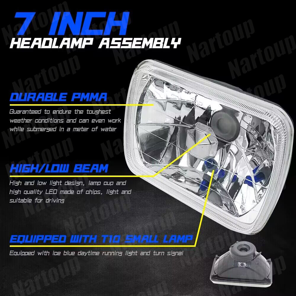 1 pair 7X6" 5X7" glass lampshade +H4 LED super white presence headlights These Light Up 500 Percent Brighter And Whiter Than The Standard Stock Sealed Beam Incandescent Headlight Bulbs. These Have The Original 3 Prong Plug Design On The Back So They Will Plug Directly Into The Original Wiring Harness. These Will Fit Any Car Or Truck That Has 2 Rectangle Glass Headlights That Are 5X6 7X6 Inches. Specs: Universal Fitment for vehicles using 2PCS 7 inch lampshade Made with High Quality Glass Lenses - NOT cheap plastic! Improved appearance with Classic Cut design! Brighter than standard housings to Improve road visibility and safety! Direct Plug & Play design (certain vehicles will require slight modification) Professional Installation is highly recommended Warranty: 5 Years H4/9003 LED Headlight Bulbs Key Features: 1. Designed to enhance your visibility and driving safety at night and bad weather. 2. Latest 2-side COB LED light source, super bright without blind zone. 3. Efficient cooling system ensures maximum headlight performance and appropriate working temperature. 4. Built-in smart IC chip provides intelligent temperature control and allows for instant start. 5. IP68 waterproof and high temperature resistant, withstand extreme weather conditions. 6. Easy installation without any modification or additional wiring, plug and play. Compatible Models and Years: - Universal for most vehicles on the market like SUV, bus, truck, sedan, pickup, sport utility etc. Specifications: Brand: Nartoup Condition: 100% Brand New Light Source:Nartoup LEDs Material: Aviation Aluminum + ABS Color Temperature: 6000K-6500K White Working Voltage: DC 9-32V ( Fit 12V,24V Vehicle ) Number of Bulbs: 2 Waterproof Rate: IP68 Working Temperature: -40℃ - +80℃ Bulb Type: H4/9003 Beam Type: High Beam/ Low Beam Beam Angle: 360 Degrees Lifespan: Over 50,000 hours Heat Dissipation Principle: Heat Pipe Technology + Aluminum Radiator Fitment Type: Direct Replacement Placement on Vehicle: Front, Left, Right Parcel Content: 2PCS H4 LED Headlight Bulbs 2PCS 7 inch square Headlight Housing 2PCS Connect cables from H4 to 9008 New boxes and old boxes are sent randomly!!! After service Notification: If you are satisfied with our product and service please leave us a positive feedback,if there is any problem when you received the package,please feel free to contact us,we will be definitely give you a satisfying solution,when you choose the return reason .please choose the reason"i don't like it". by this option we will accept your return immediately and provide return label for full refund. the others reason to return will take both of us many troubles to handle. If you have any questions, please feel free to contact us, we are happy to answer them for you. Hope you will have a good shopping experience~