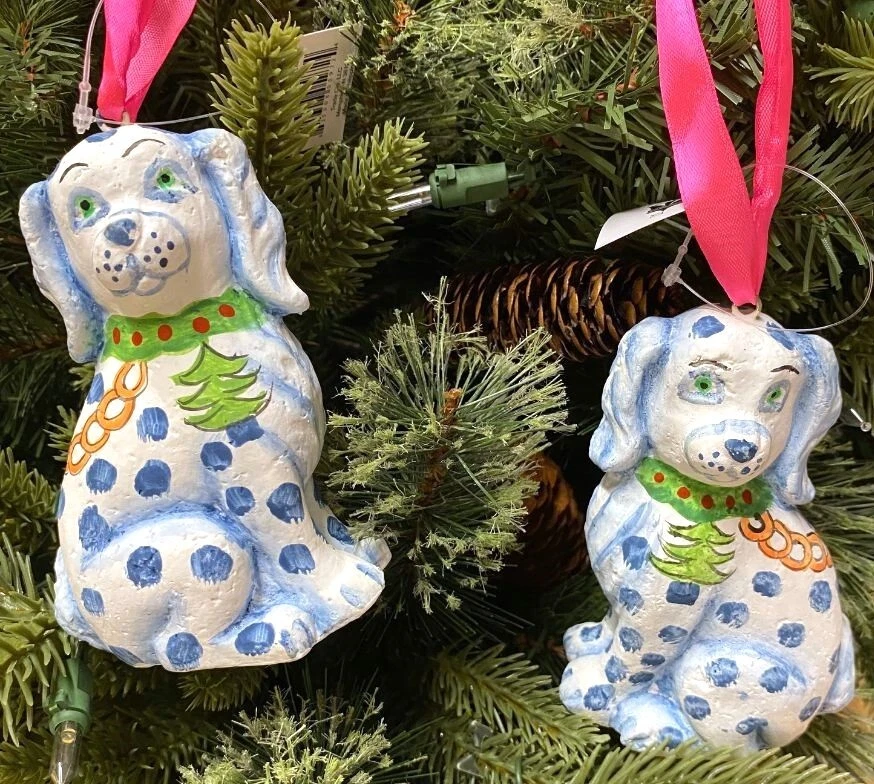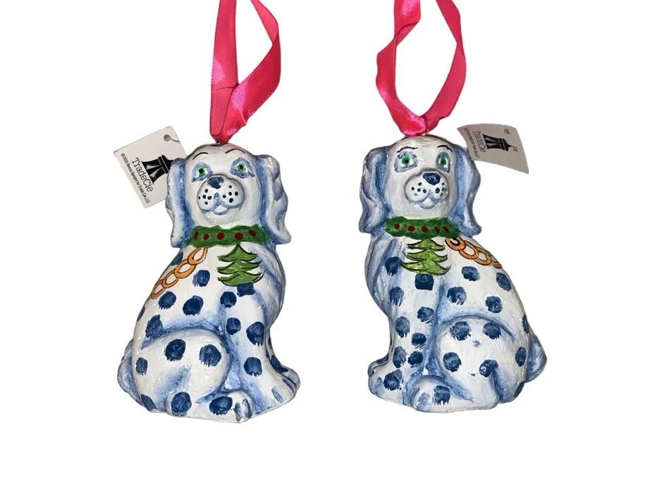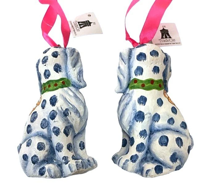TRADE CIE NEW WITH TAGS Becca Speight artist pair of beautiful blue and white Staffordshire dog ornaments. With pink ribbon hangers these hand painted ornaments will be a keepsake for the sophisticated home for years to come. Ready for the holidays or all year long. 3" x 5" The matching accessories and cats are available while they last.