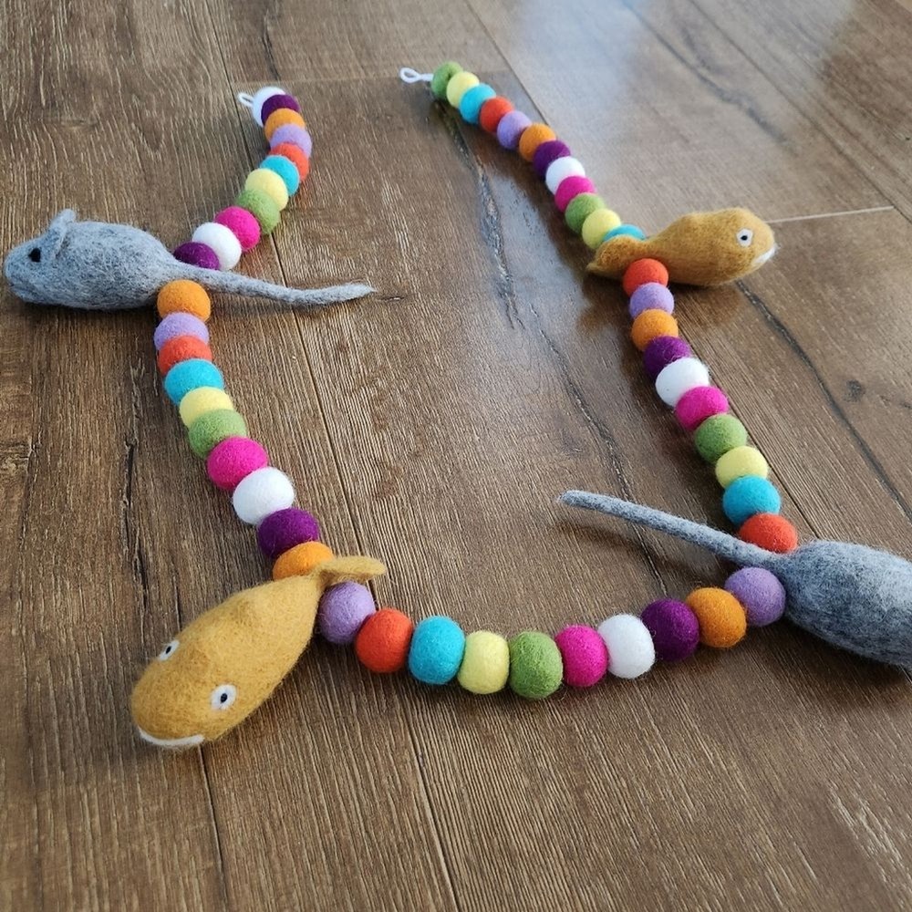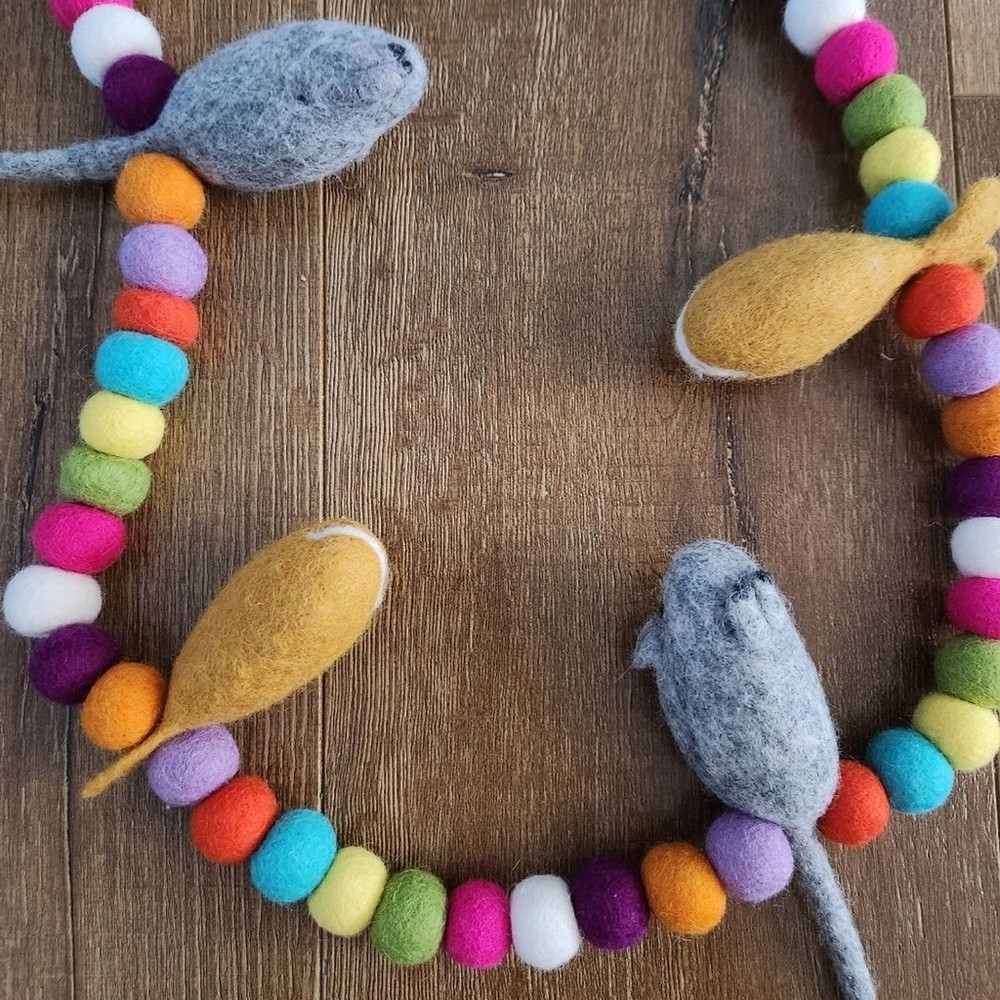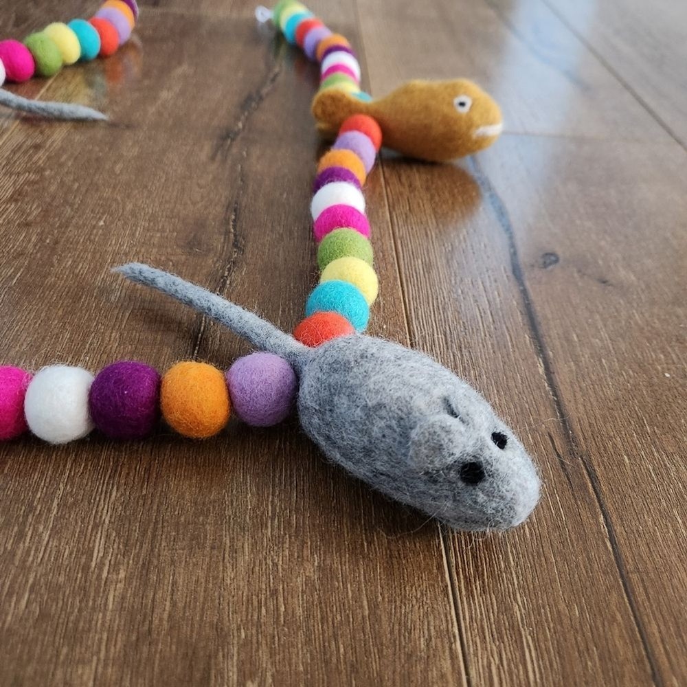 Featuring an adorable Trader Joe's Here, Kitty Kitty felt mouse and fish garland cat toy. This is a handcrafted garland made of New Zealand wool and it was hand felted in Nepal. It would make a purrfect addition to any household. It's in fantastic condition and looks like it was never used. Add it to your home today!! brand: Trader Joe's fabrication: New Zealand wool length: 40" animal length: 4" - 7"