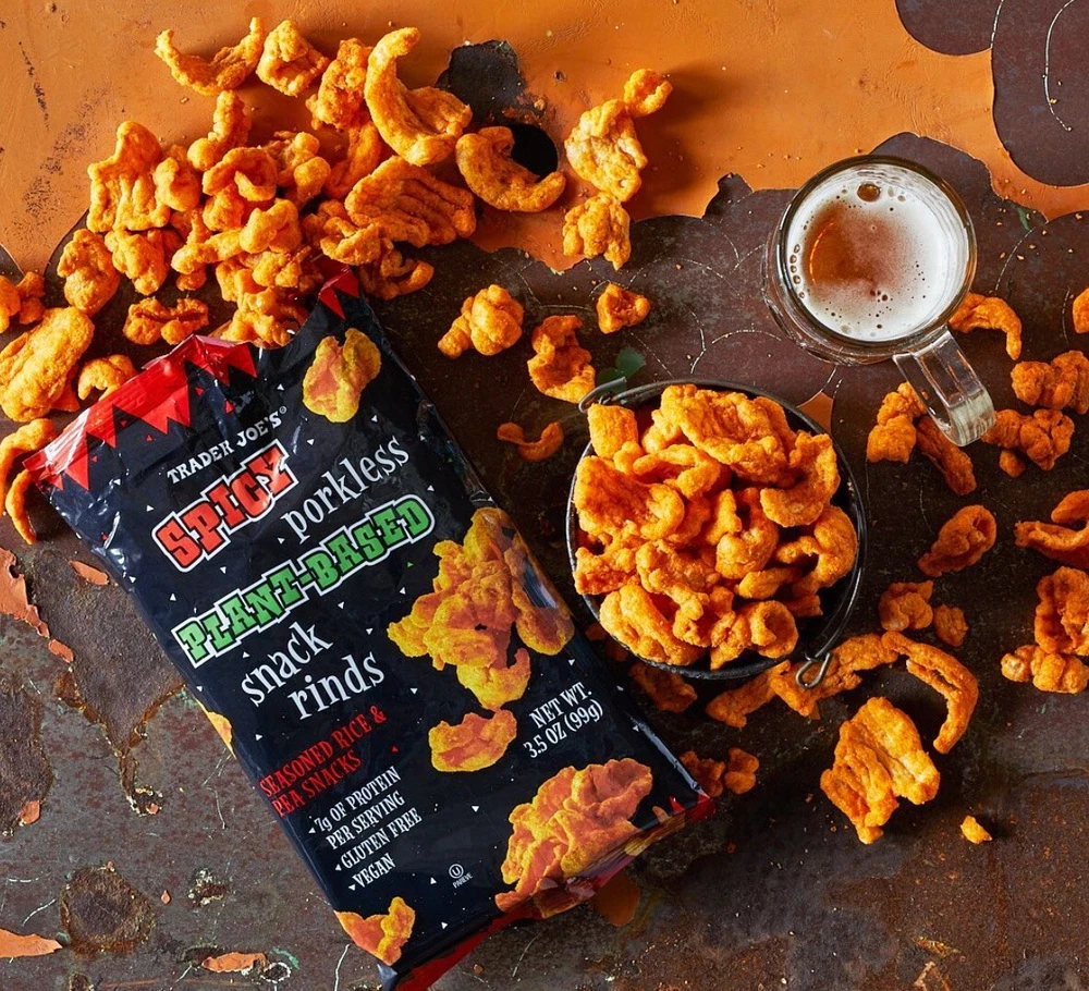 Trader Joe's Spicy Porkless Plant-Based Snack Rinds This is a leaner and great tasting alternative to traditional pork skins and you will fall in love! Made from Seasoned Rice and Pea snack it is: Vegan Gluten free And offering 7 grams of Protein per serving Enjoy!